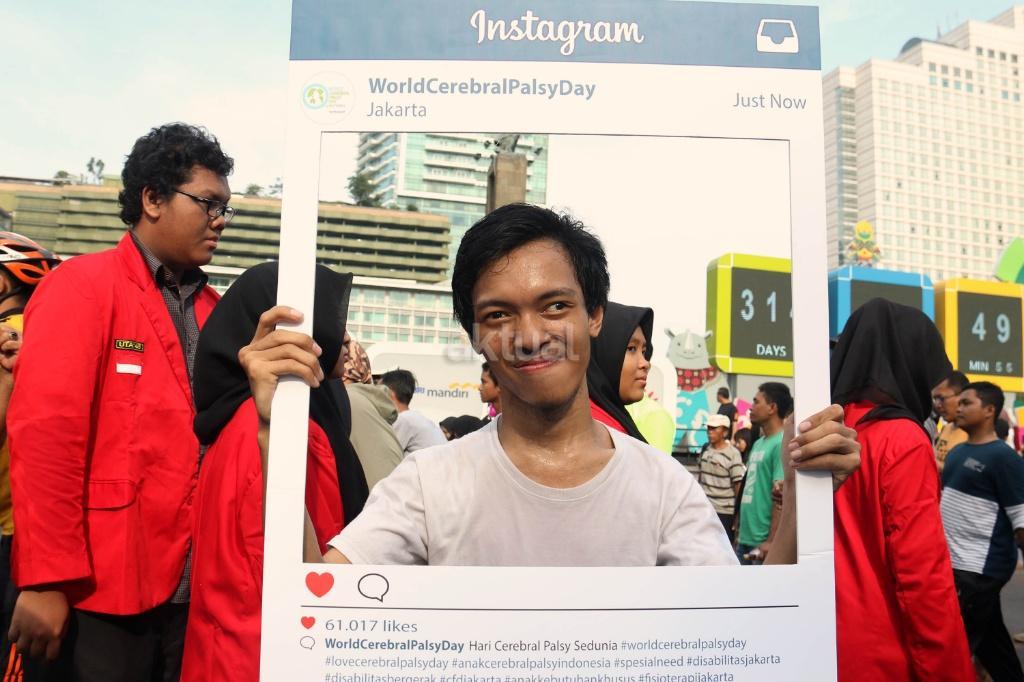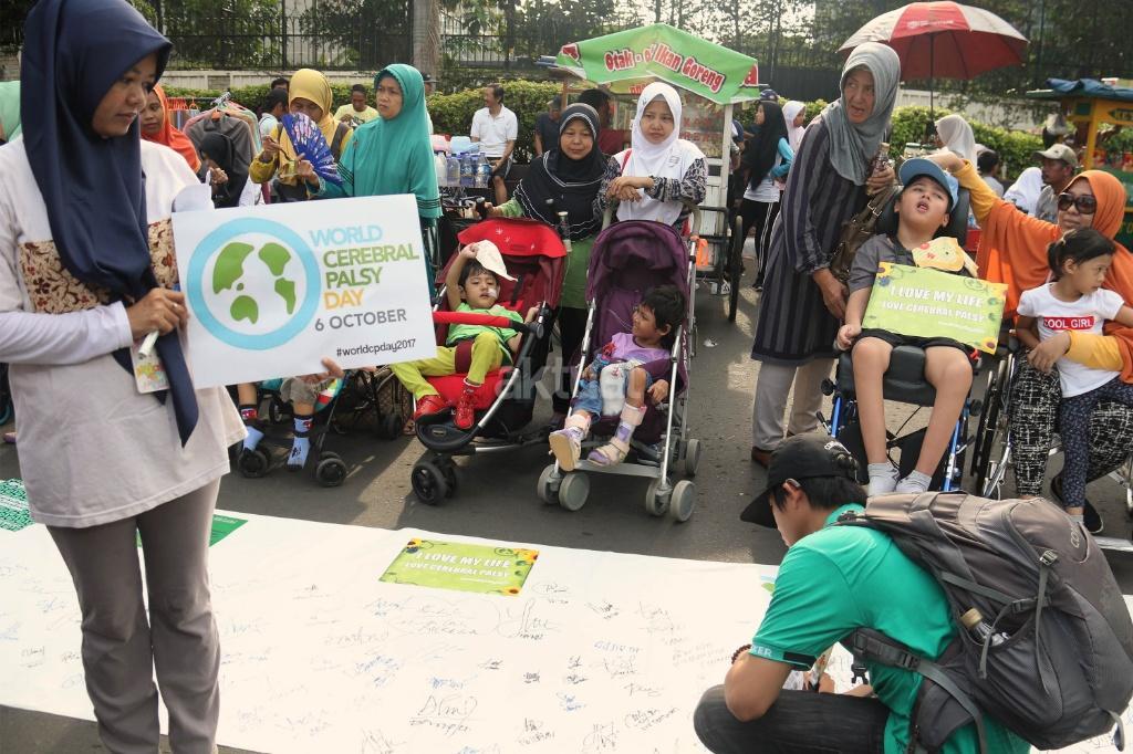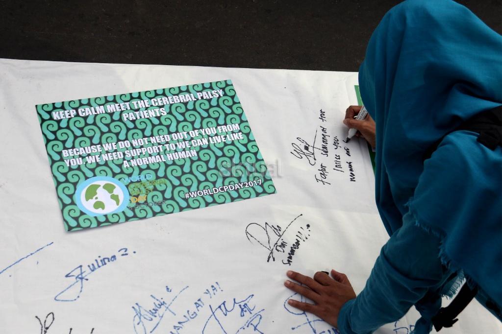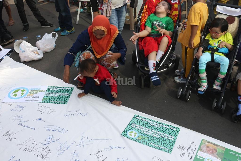 Sejumlah pengunjung CFD melakukan tanda tangan sebagai dukungan dalam memperingati hari Cerebral Palsy (CP) Sedunia dikawasan Bunderan HI, Jakarta, Minggu (8/10/2017). Setiap hari Rabu minggu pertama di bulan Oktober, diperingati sebagai Hari Cerebral Palsy Sedunia (World Cerebral Palsy Day ) yang merupakan pesan moral bagi anak-anak penderita cerebral palsy belum mendapat perhatian seperti anak-anak yang lainnya. AKTUAL/Munzir