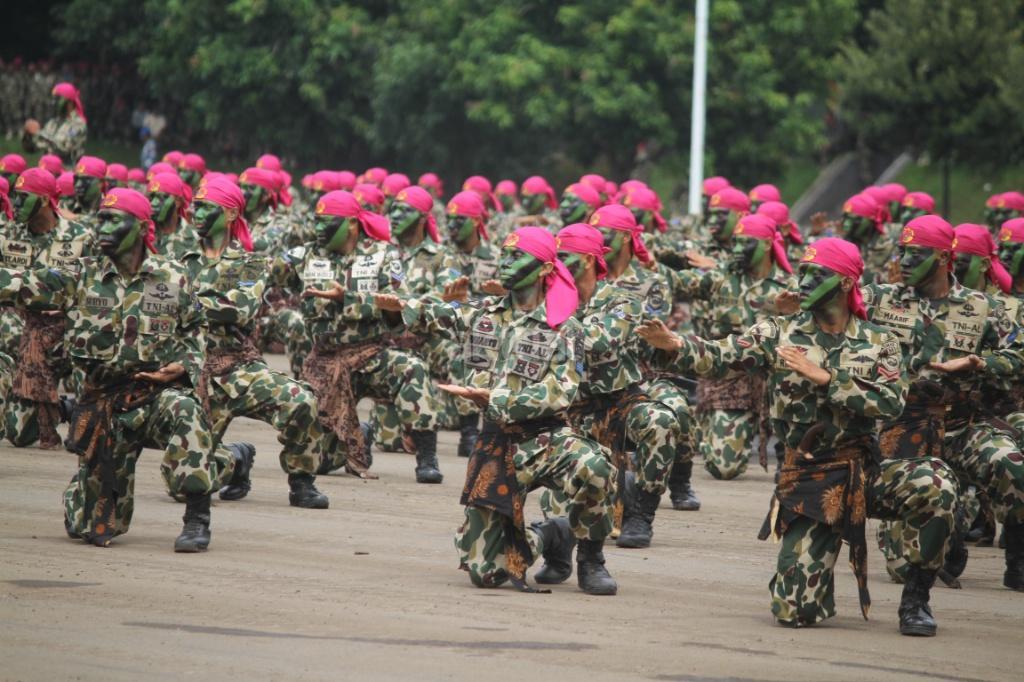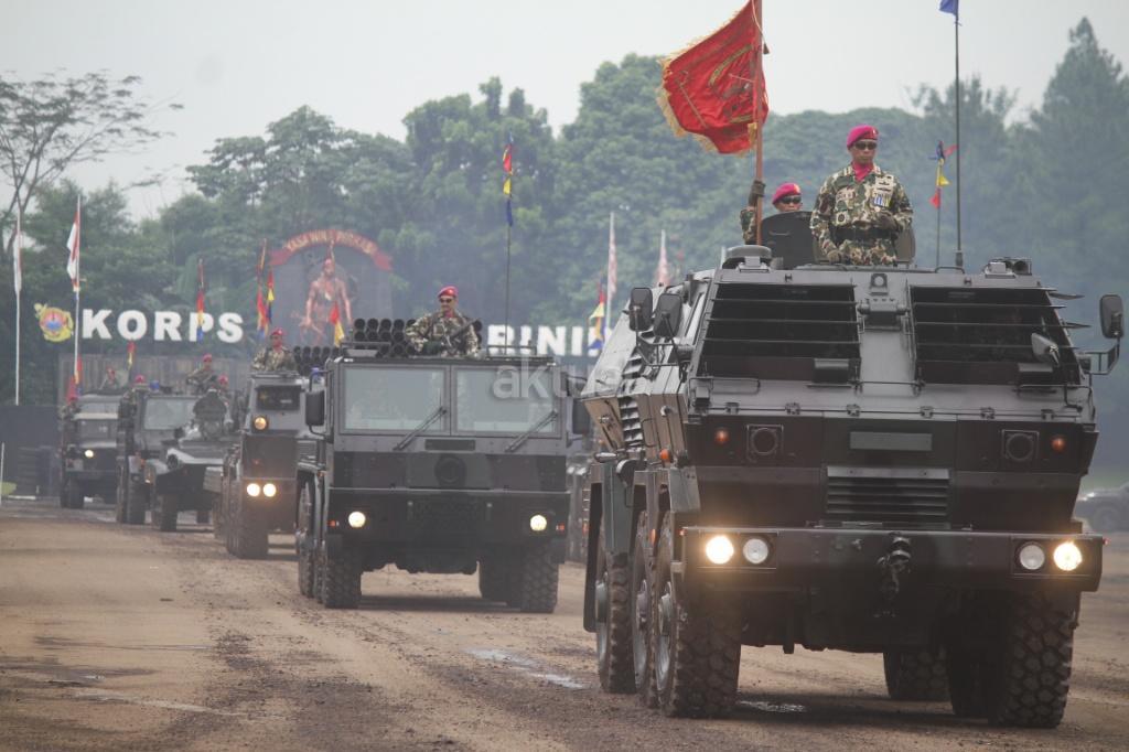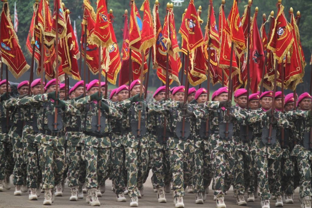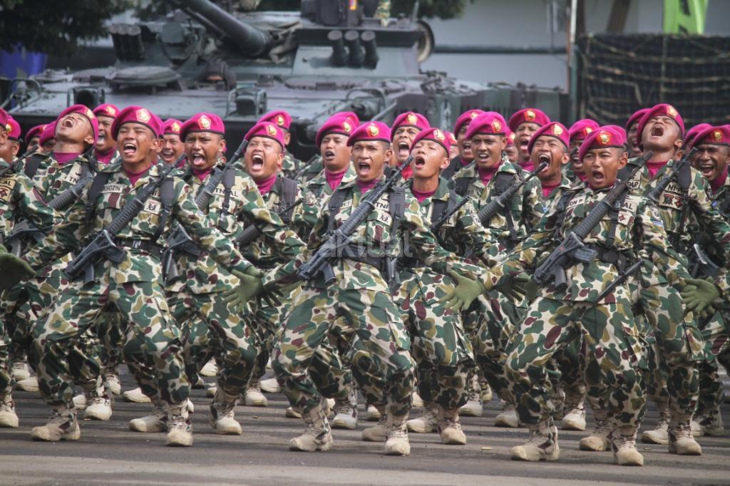 Pasukan saat mengikuti peringatan Hari Ulang Tahun (HUT) ke-72 Korps Marinir TNI AL di Lapangan Apel Brigif 2 Cilandak, Jakarta, Rabu (15/11). HUT bertema ‘Marinir Prajurit Pejuang dan Profesional’ ini diikuti 3.500 prajurit. AKTUAL/Tino Oktaviano