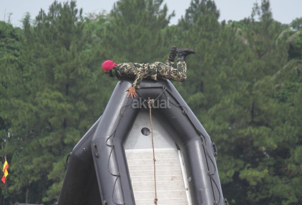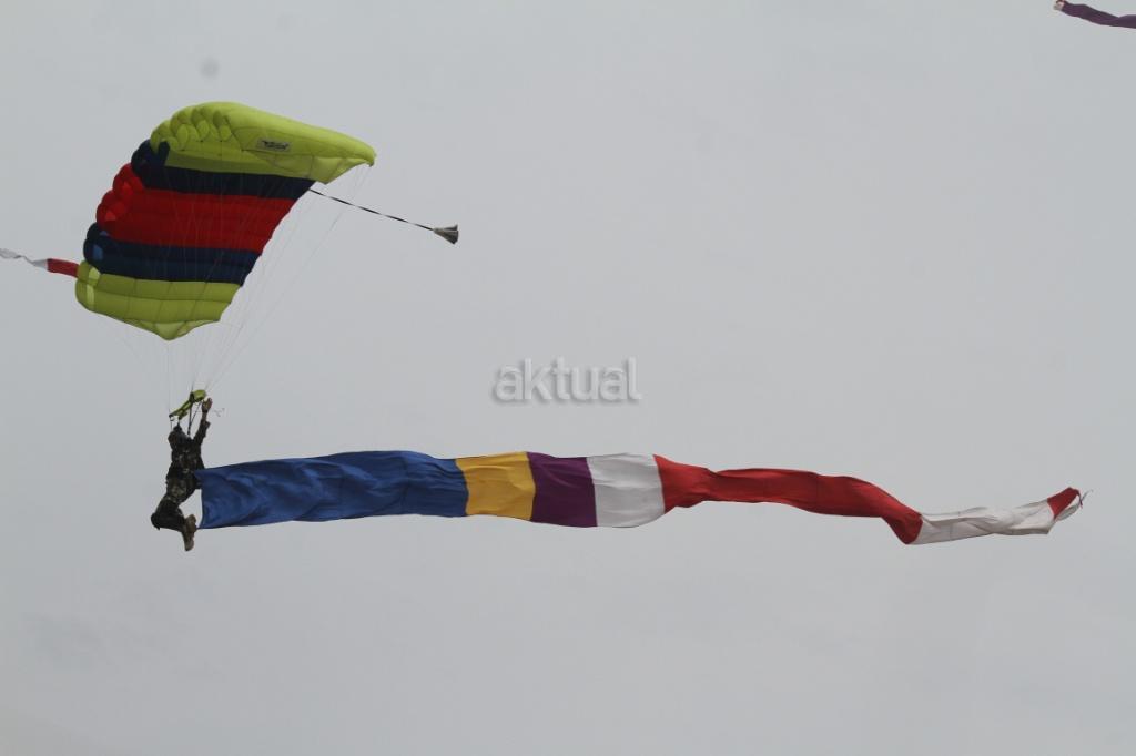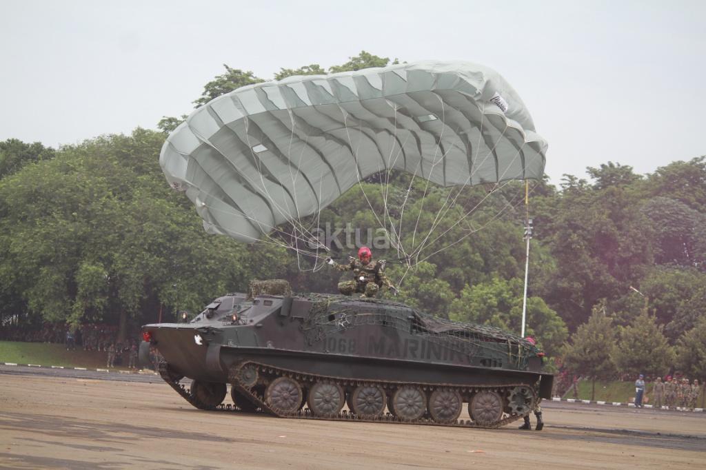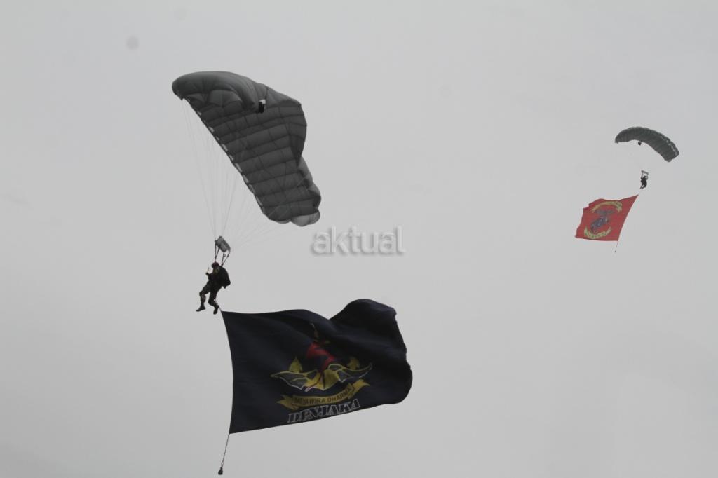 Aksi terjun payung ditunjukan pasukan saat peringatan Hari Ulang Tahun (HUT) ke-72 Korps Marinir TNI AL di Lapangan Apel Brigif 2 Cilandak, Jakarta, Rabu (15/11). HUT bertema ‘Marinir Prajurit Pejuang dan Profesional’ ini diikuti 3.500 prajurit. AKTUAL/@Tino Oktaviano