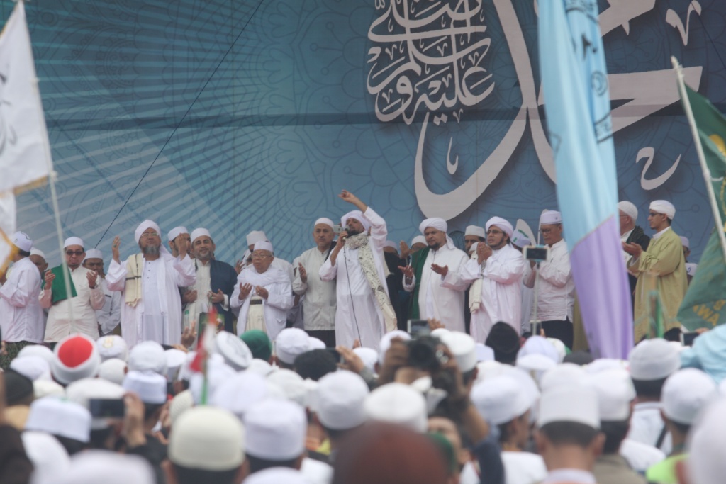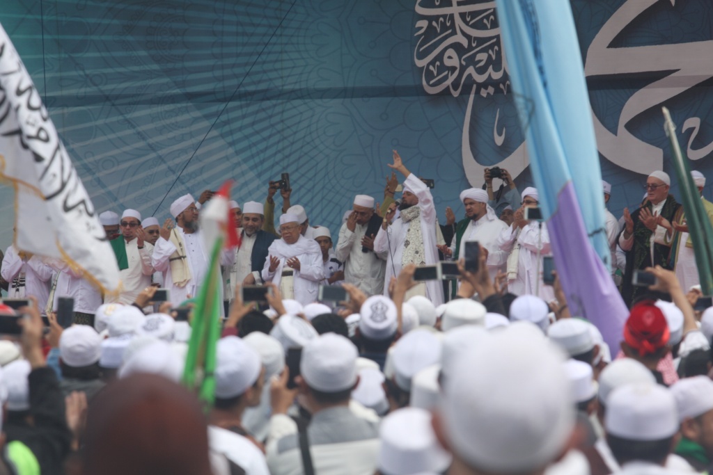 Ketua Majelis Ulama Indonesia (MUI) Kh. Ma’ruf Amin (tengah) memimpin doa didampingi Dewan Pembina Majelis Rasulullah SAW Habib Nabiel Almusawa dan sejumlah Alim Ulama dan Habaib dalam peringatan Maulid Nabi Muhammad SAW 1439 Hijriyah di Monumen Nasional (Monas), Jakarta, Jumat (1/12). Ribuan umat muslim mengikuti Peringatan Maulid Nabi Muhammad yang jatuh pada 12 Rabiul Awal 1439 Hijriyah yang digelar oleh Majelis Rasulullah dan dihadiri Gubernur DKI Jakarta Anies Baswedan diisi dengan zikir, shalawat dan doa bersama. AKTUAL/Tino Oktaviano