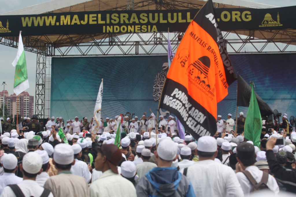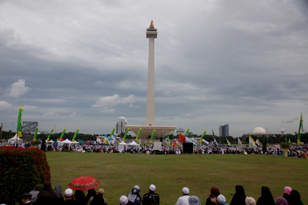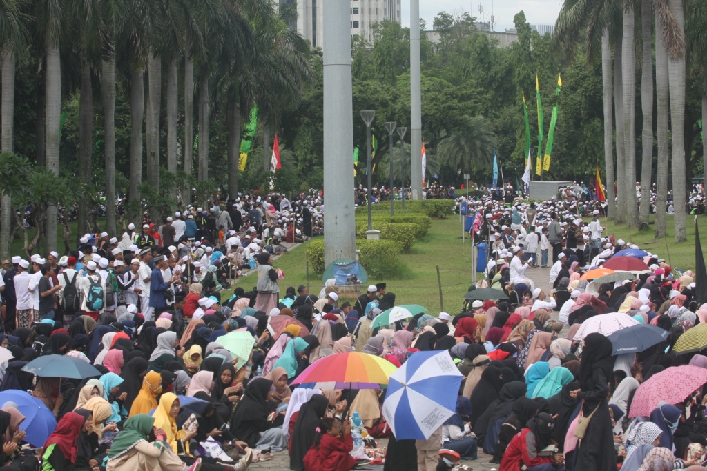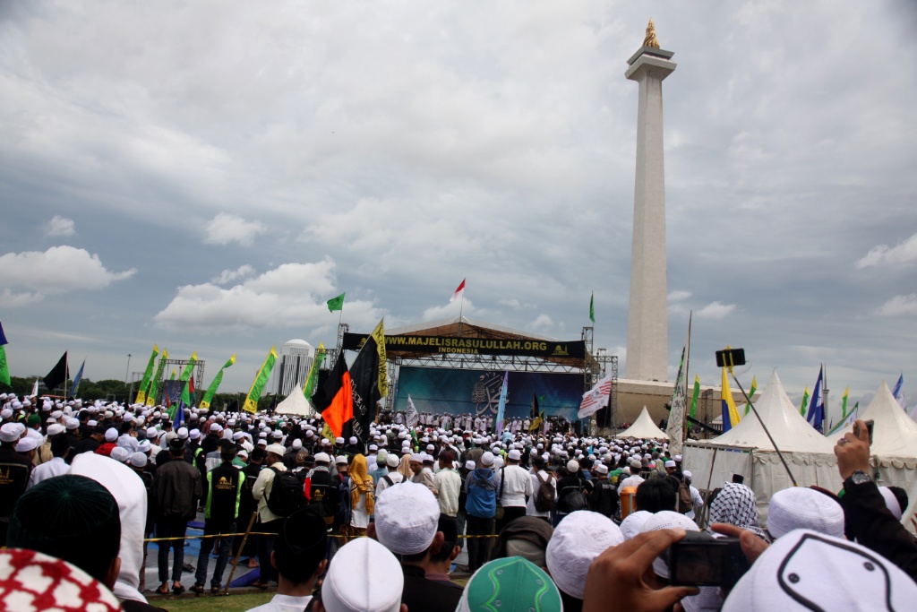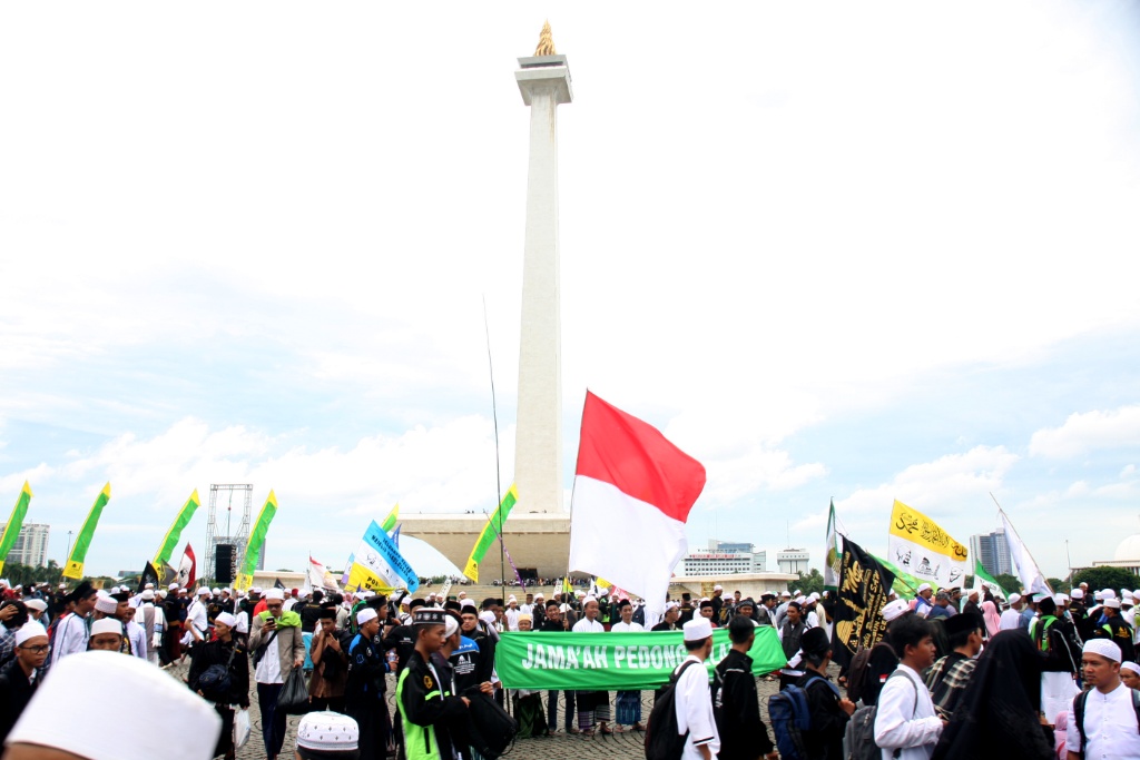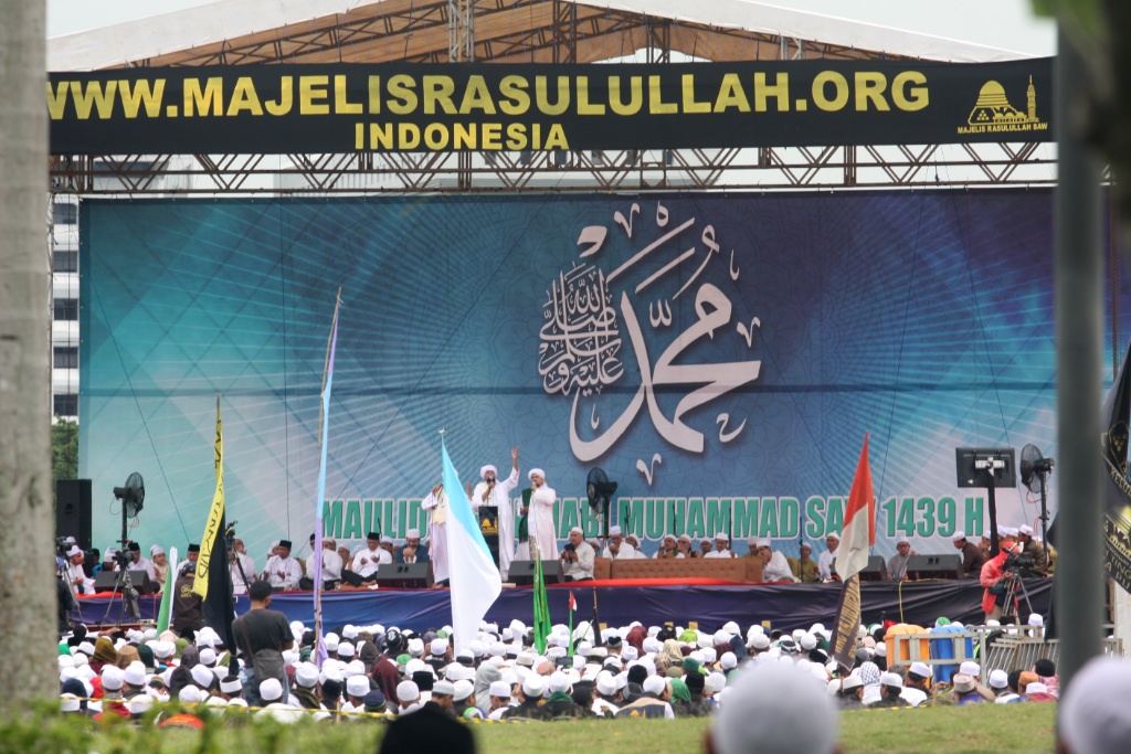 Sejumlah umat muslim menghadiri peringatan Maulid Nabi Muhammad SAW 1439 Hijriyah di Monumen Nasional (Monas), Jakarta, Jumat (1/12). Ribuan umat muslim mengikuti Peringatan Maulid Nabi Muhammad yang jatuh pada 12 Rabiul Awal 1439 Hijriyah yang digelar oleh Majelis Rasulullah dan dihadiri Gubernur DKI Jakarta Anies Baswedan diisi dengan zikir, shalawat dan doa bersama. AKTUAL/Tino Oktaviano