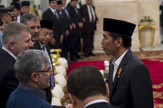 Presiden Joko Widodo (kanan) menyapa sejumlah duta besar dan perwakilan negara sahabat yang hadir dalam acara Peringatan Nuzulul Quran Tahun 1437 H/2016 M Tingkat Nasional di Istana Negara, Jakarta, Selasa (21/6). Dalam peringatan tersebut disi oleh uraian hikmah Nuzulul Quran dengan tema Al-Quran bagi Peningkatan Kualitas Sumber Daya Manusia oleh Ketua Umum Pengurus Besar Al Washliyah Yusnar Yusuf Rangkuti. ANTARA FOTO/Widodo S. Jusuf/Spt/16.
