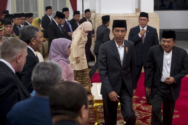 Presiden Joko Widodo (ketiga kanan), Wapres Jusuf Kalla (kanan) dan Menteri Agama Lukman Hakim Saifuddin (kedua kanan) berjalan menuju sejumlah duta besar negara sahabat usai acara Peringatan Nuzulul Quran Tahun 1437 H/2016 M Tingkat Nasional di Istana Negara, Jakarta, Selasa (21/6). Dalam peringatan tersebut disi oleh uraian hikmah Nuzulul Quran dengan tema Al-Quran bagi Peningkatan Kualitas Sumber Daya Manusia oleh Ketua Umum Pengurus Besar Al Washliyah Yusnar Yusuf Rangkuti. ANTARA FOTO/Widodo S. Jusuf/Spt/16.