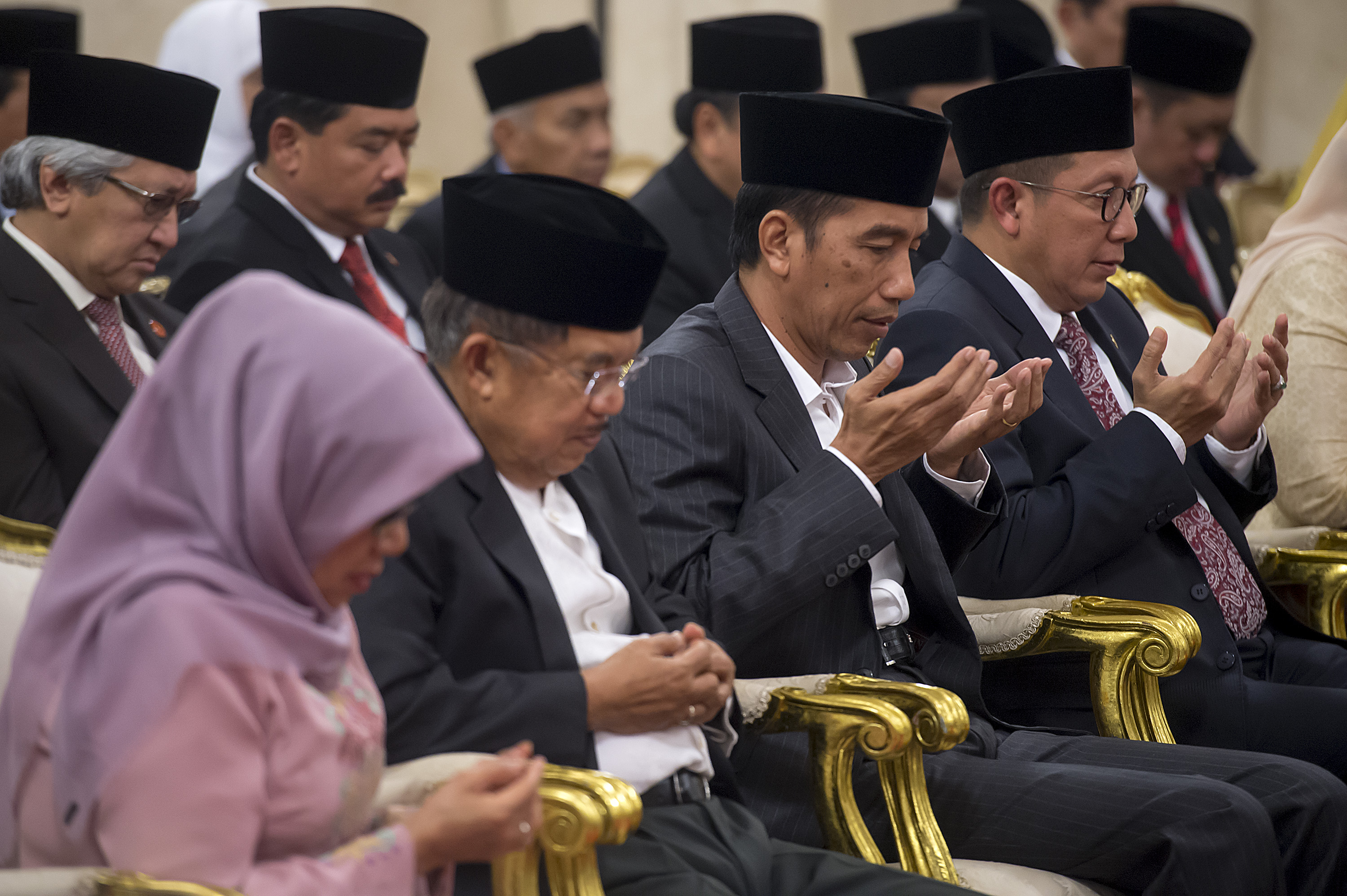 Presiden Joko Widodo (kedua kanan), Wapres Jusuf Kalla (kedua kiri), Ibu Mufidah Kalla (kiri) dan Menteri Agama Lukman Hakim Saifuddin (kanan) memanjatkan doa bersama pada acara Peringatan Nuzulul Quran Tahun 1437 H/2016 M Tingkat Nasional di Istana Negara, Jakarta, Selasa (21/6). Dalam peringatan tersebut disi oleh uraian hikmah Nuzulul Quran dengan tema Al-Quran bagi Peningkatan Kualitas Sumber Daya Manusia oleh Ketua Umum Pengurus Besar Al Washliyah Yusnar Yusuf Rangkuti. ANTARA FOTO/Widodo S. Jusuf/Spt/16.
