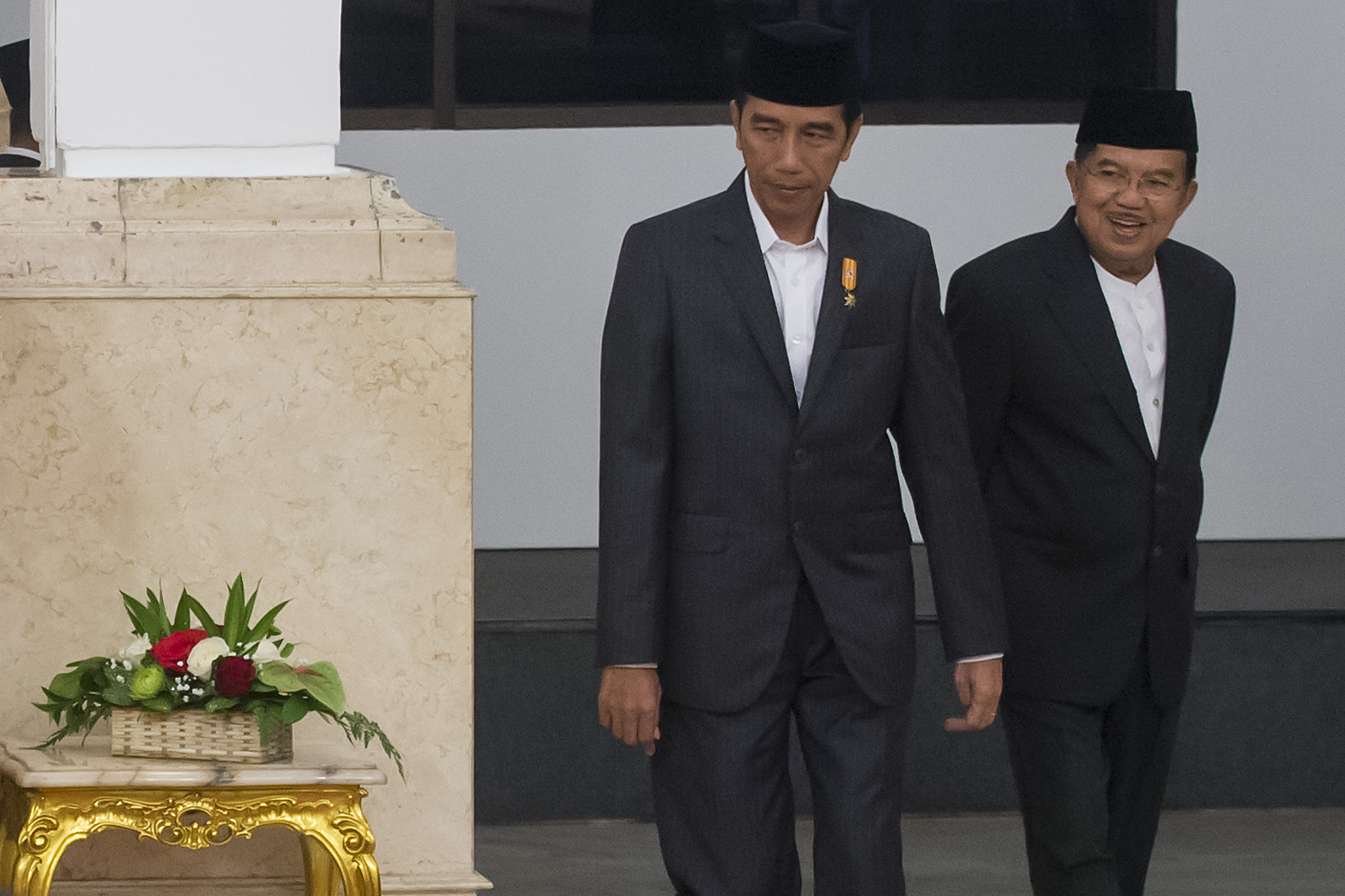 Presiden Joko Widodo (kiri) dan Wapres Jusuf Kalla (kanan) berjalan menuju ruang acara Peringatan Nuzulul Quran Tahun 1437 H/2016 M Tingkat Nasional di Istana Negara, Jakarta, Selasa (21/6). Dalam peringatan tersebut disi oleh uraian hikmah Nuzulul Quran dengan tema Al-Quran bagi Peningkatan Kualitas Sumber Daya Manusia oleh Ketua Umum Pengurus Besar Al Washliyah Yusnar Yusuf Rangkuti. ANTARA FOTO/Widodo S. Jusuf/Spt/16.