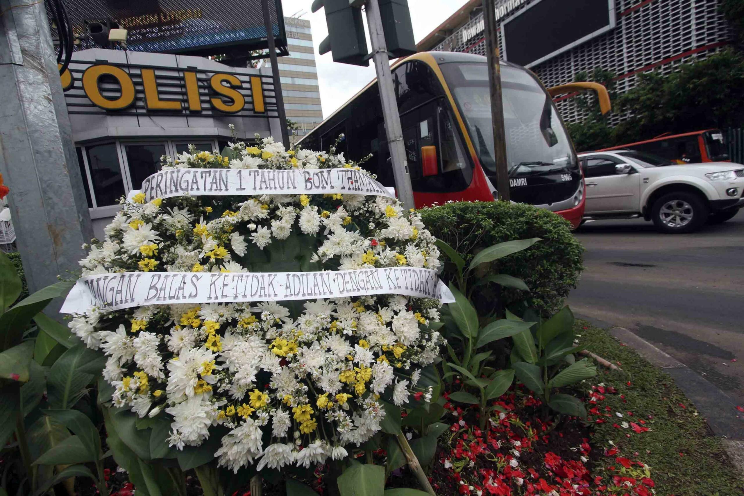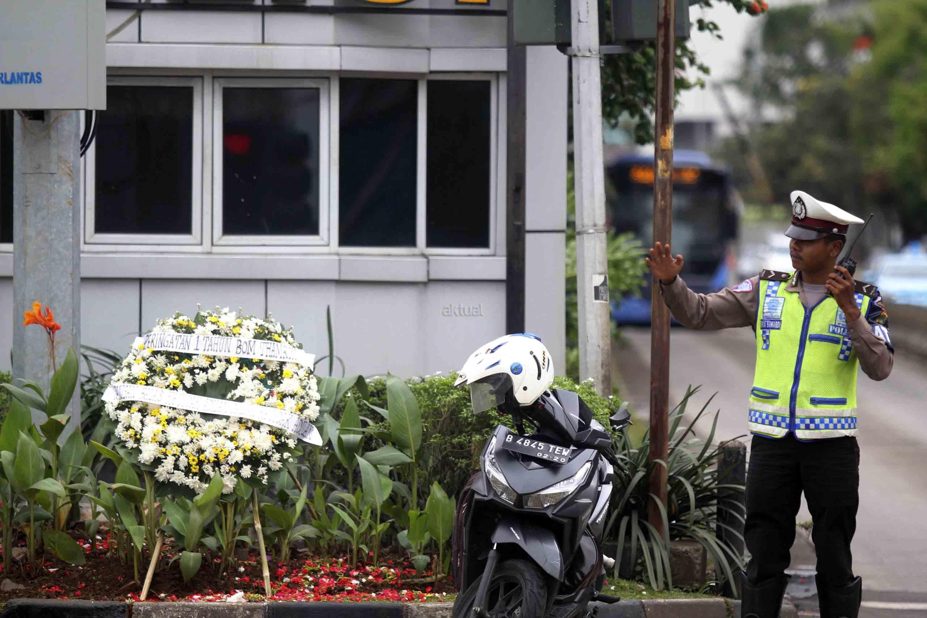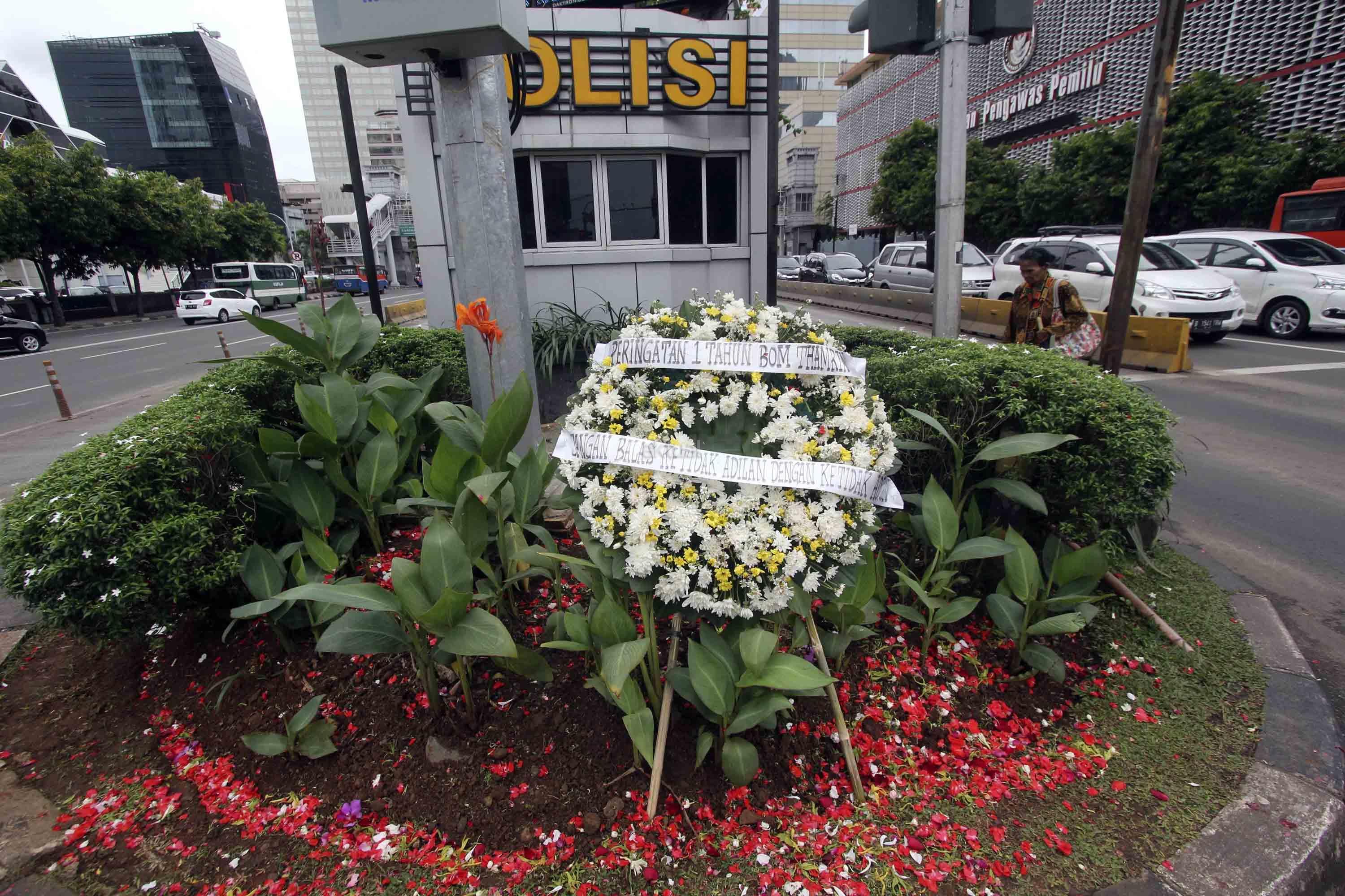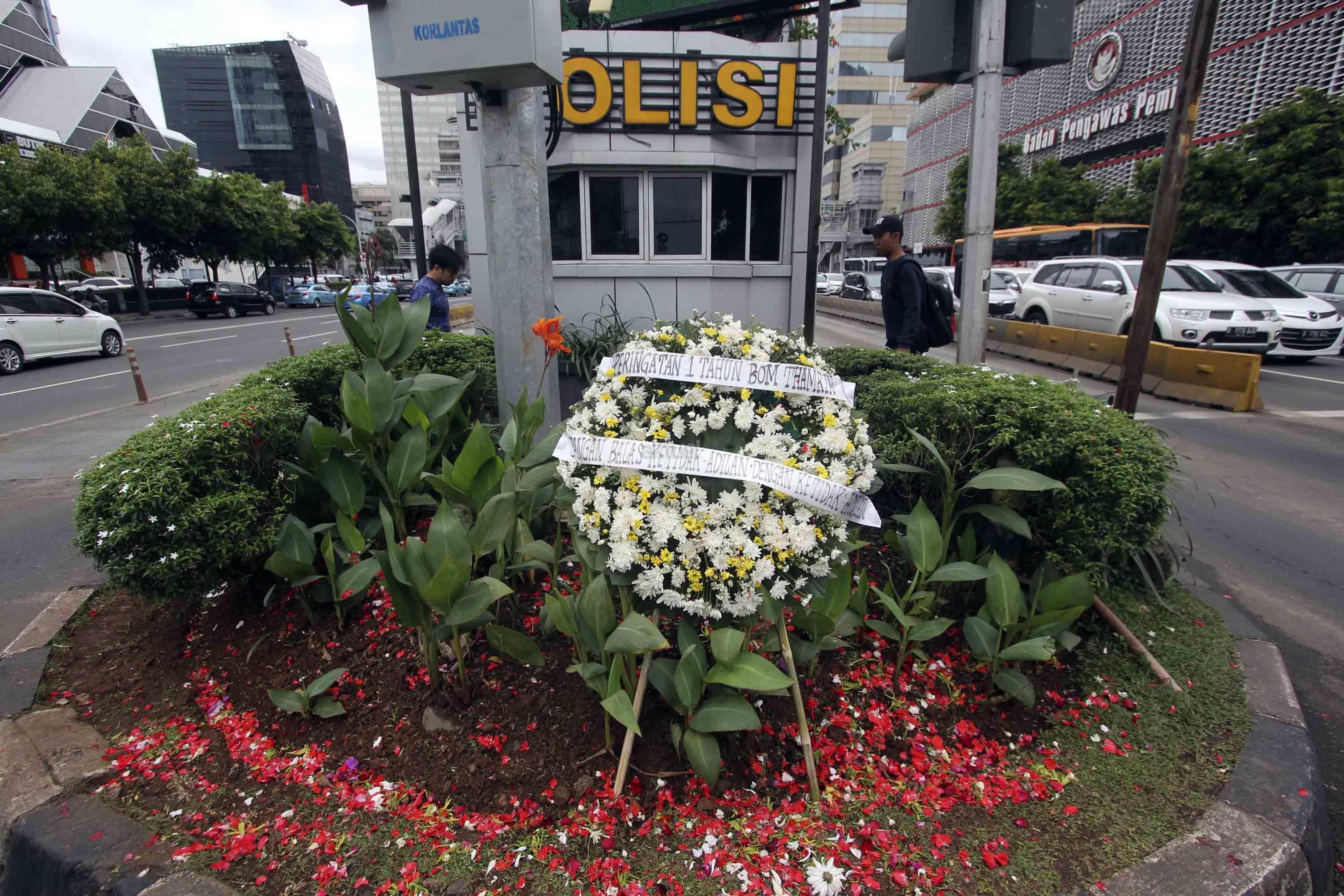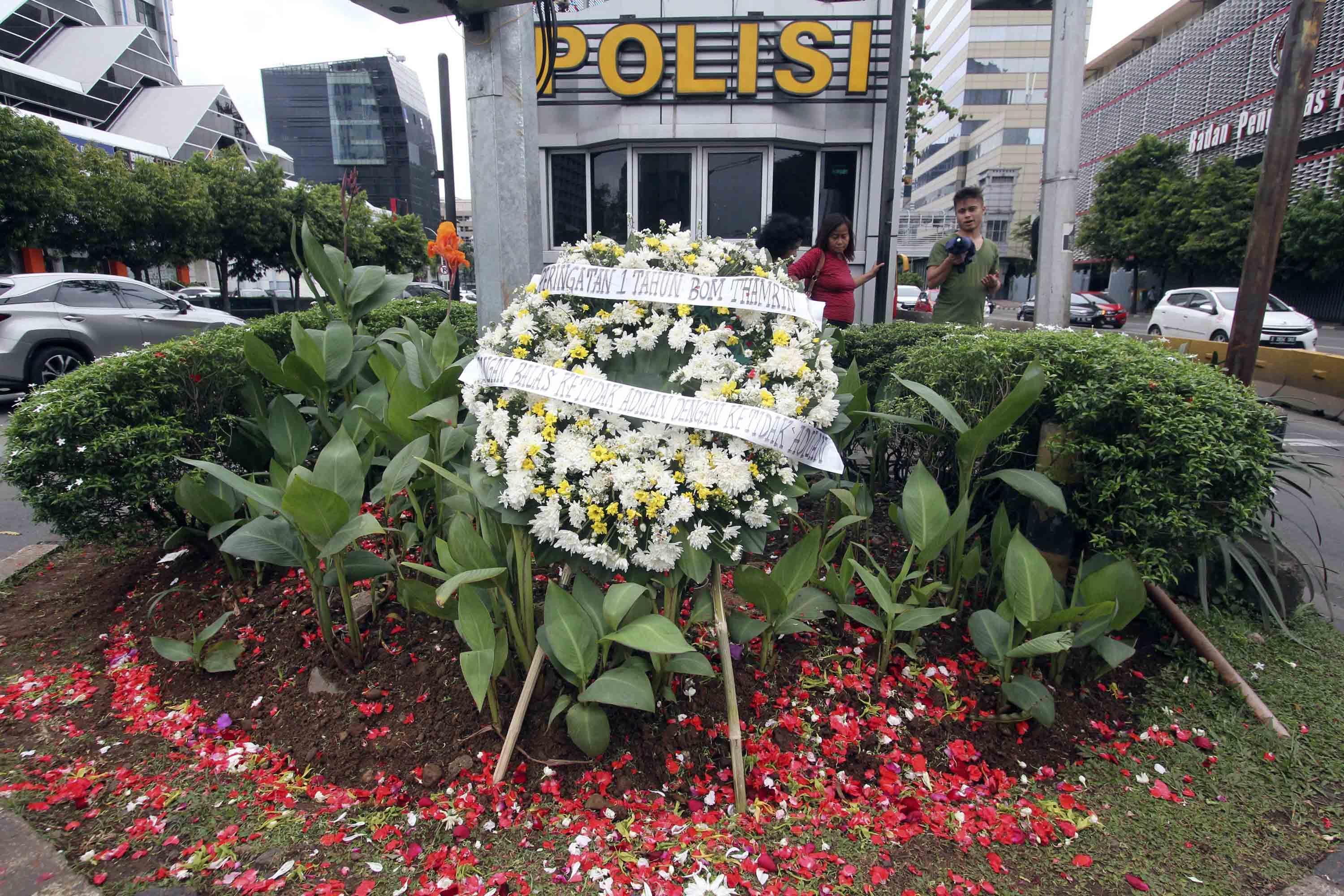 Karangan bunga diletakan untuk memperingati korban serangan "Bom Thamrin" di lokasi kejadian di Jalan MH Thamrin, Jakarta, Sabtu (14/1). Aksi tabur bunga dilakukan dalam rangka memperingati satu tahun kejadian aksi terorisme "Bom Thamrin". AKTUAL/Tino Oktaviano