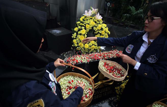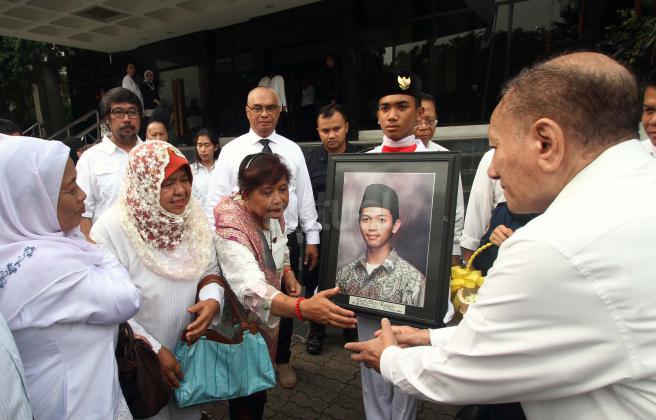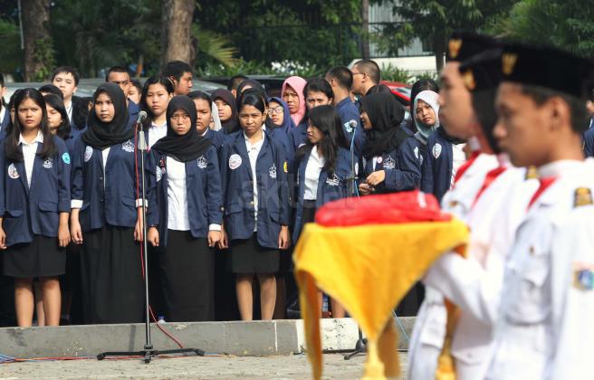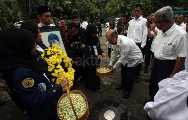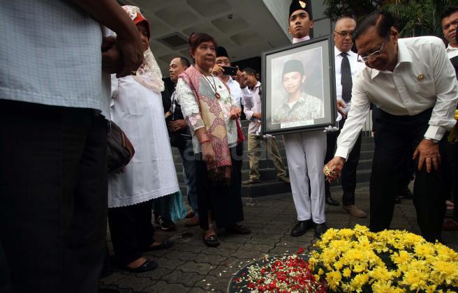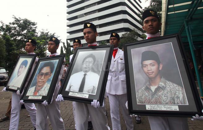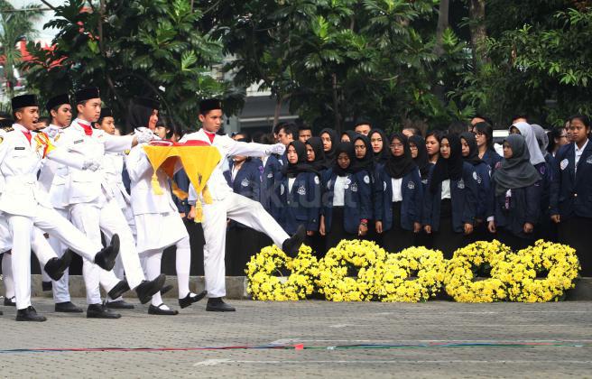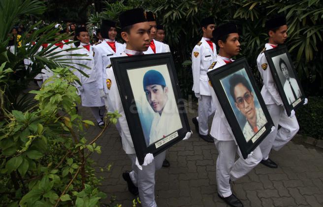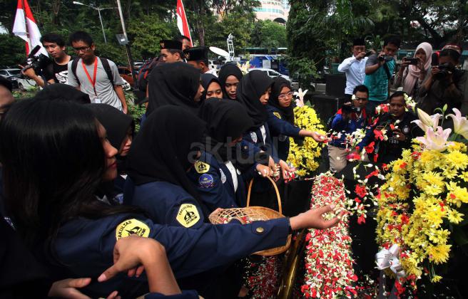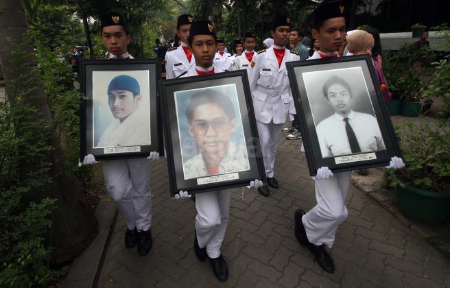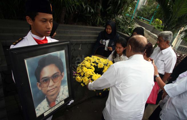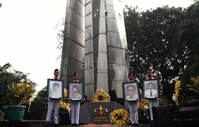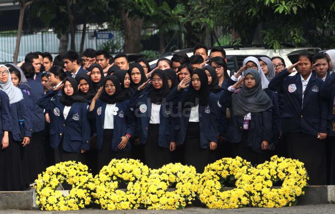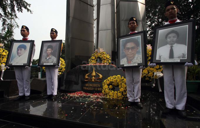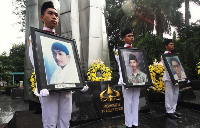 Sejumlah Mahasiswa Trisakti memperingati tragedi 12 Mei 1998, di Kampus Triskati, Jakarta, Kamis (12/5/2016). Peringatan tragedi tersebut dilakukan dengan menggelar upacara pengibaran bendera setengah tiang dan penaburan bunga sebagai bentuk penghormatan atas empat mahasiswa Trisakti yang meninggal dunia dalam insiden Trisakti, 18 tahun silam.