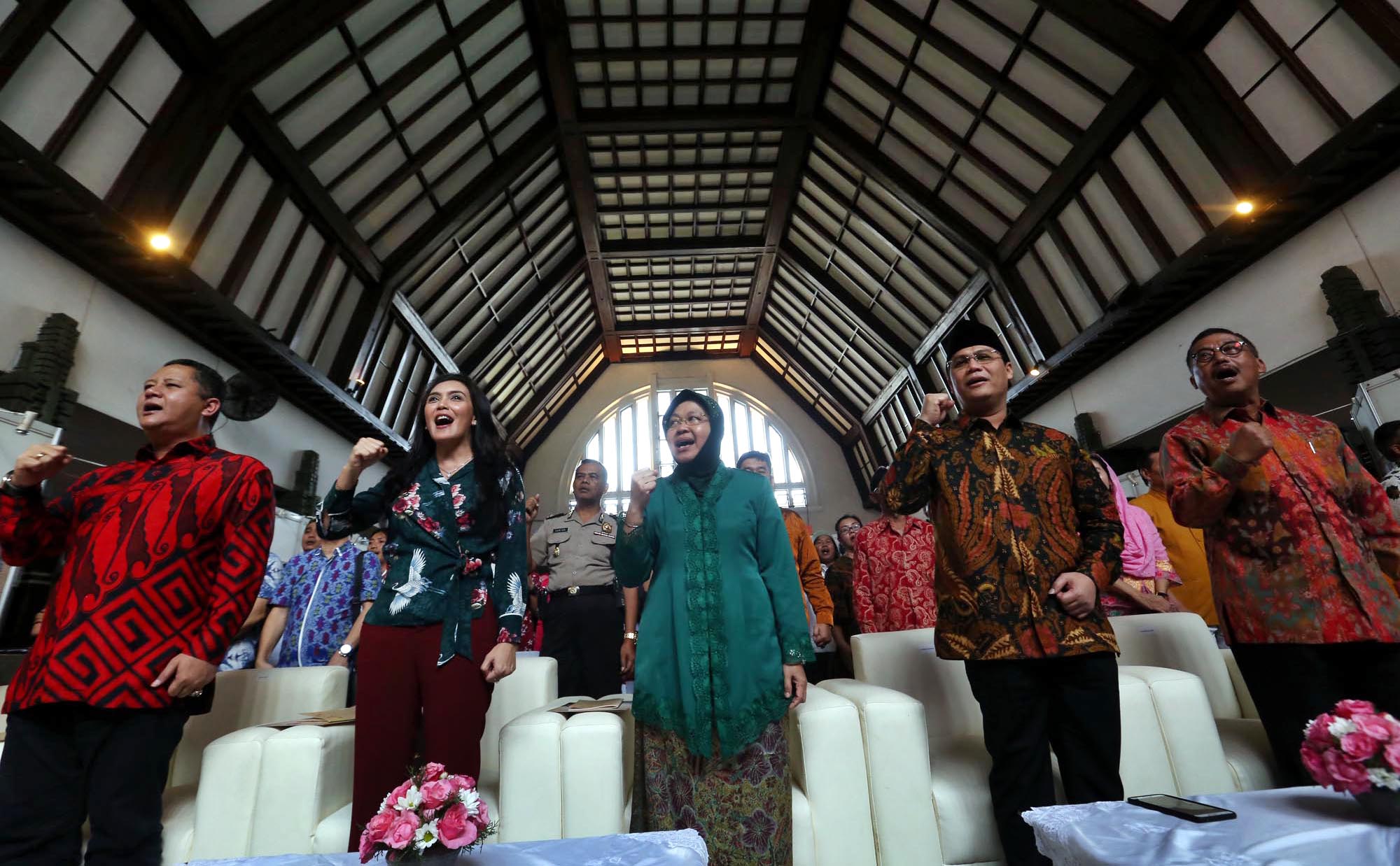 Wakil Ketua MPR Ahmad Basarah (kedua kanan), Wali Kota Surabaya Tri Rismaharini (tengah) dan perwakilan komunitas Jas Merah yang juga Duta Arsip Nasional Rieke Diah Pitaloka (kedua kiri) saat menyayikan lagu Indonesia Raya saat acara rangkaian pagelaran bertajuk ‘Tjamkan Pantja Sila, di Kantor Pos Kebon Rojo, Surabaya, Jawa Timur, Rabu (6/6/2018). Memori tentang sosok proklamator ini sebagai momentum hari kelahirannya ke 117 tahun, sekaligus mengenang Hari Lahir Pancasila, Hari Kelahiran dan Hari Wafatnya Bung Karno di bulan Juni. Pameran ini berlangsung hinggal 9 Juni 2018 dan disediakan 50 hingga 100 perangko bagi setiap pengunjung yang hadir. AKTUAL/HO