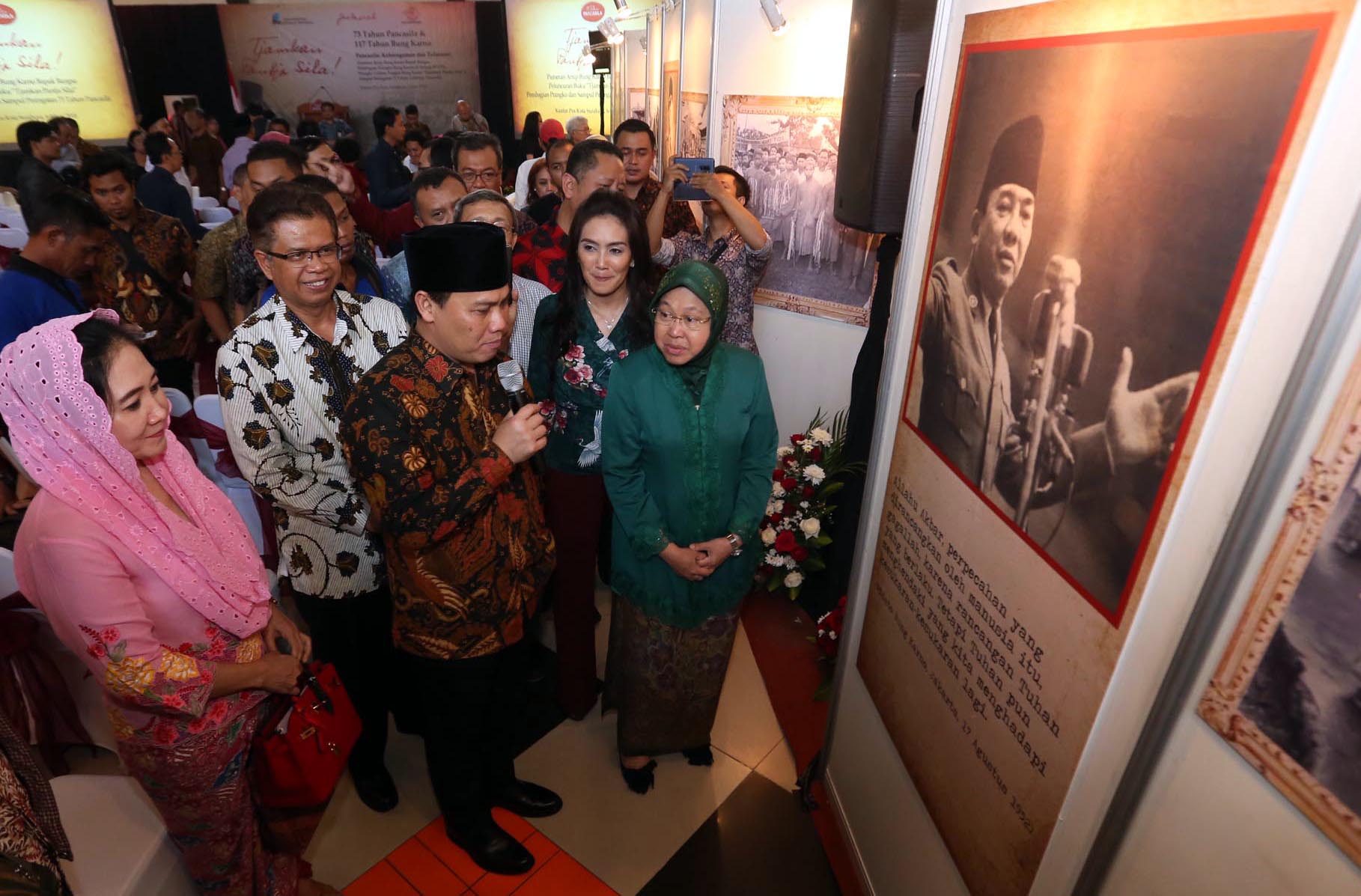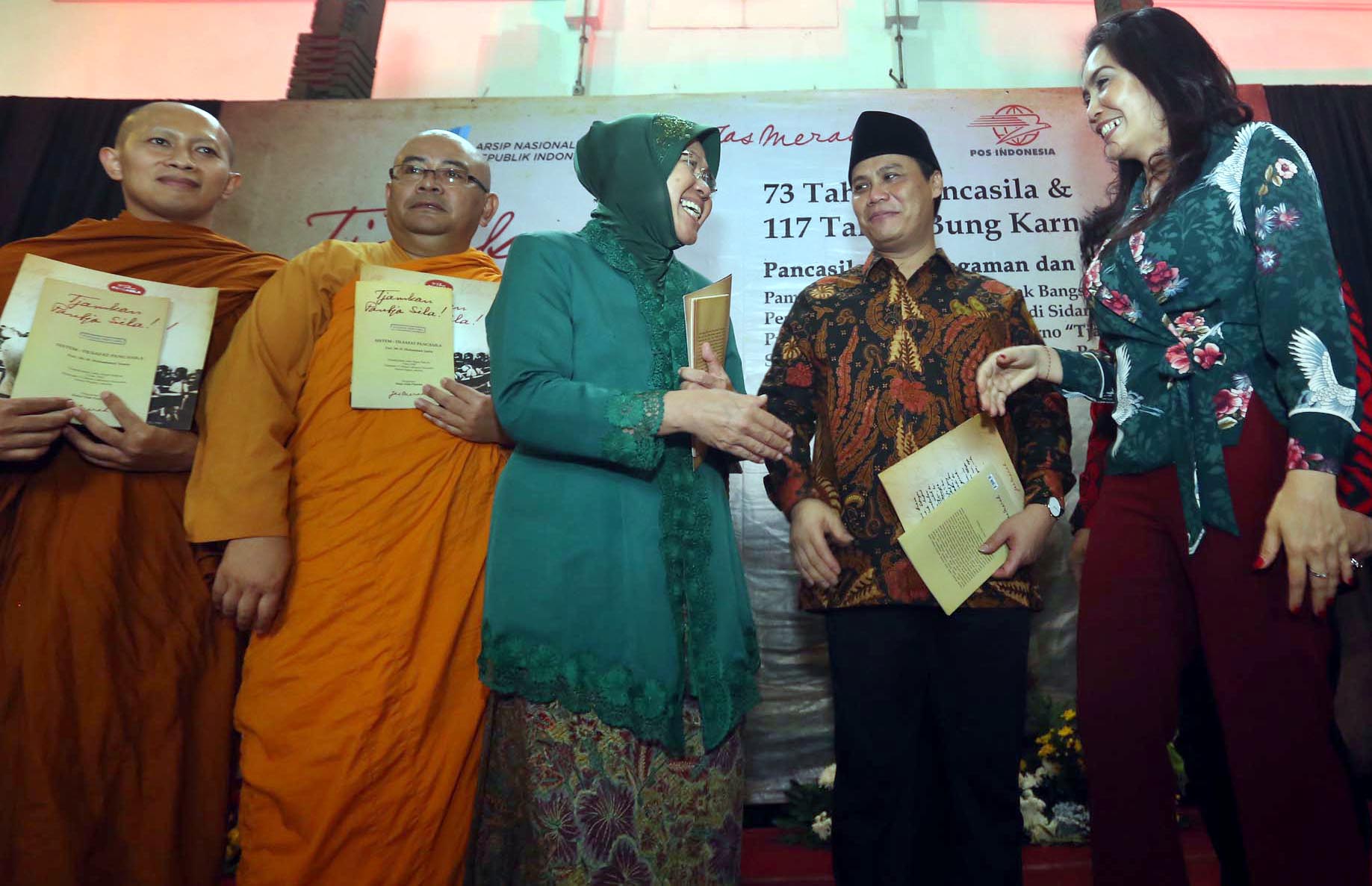 Wakil Ketua MPR Ahmad Basarah, Wali Kota Surabaya Tri Rismaharini dan perwakilan komunitas Jas Merah yang juga Duta Arsip Nasional Rieke Diah Pitaloka, memperlihatkan buku ‘Tjamkan Pantja Sila, dalam acara rangkaian pagelaran bertajuk ‘Tjamkan Pantja Sila, di Kantor Pos Kebon Rojo, Surabaya, Jawa Timur, Rabu (6/6/2018). Memori tentang sosok proklamator ini sebagai momentum hari kelahirannya ke 117 tahun, sekaligus mengenang Hari Lahir Pancasila, Hari Kelahiran dan Hari Wafatnya Bung Karno di bulan Juni. Pameran ini berlangsung hinggal 9 Juni 2018 dan disediakan 50 hingga 100 perangko bagi setiap pengunjung yang hadir. AKTUAL/HO