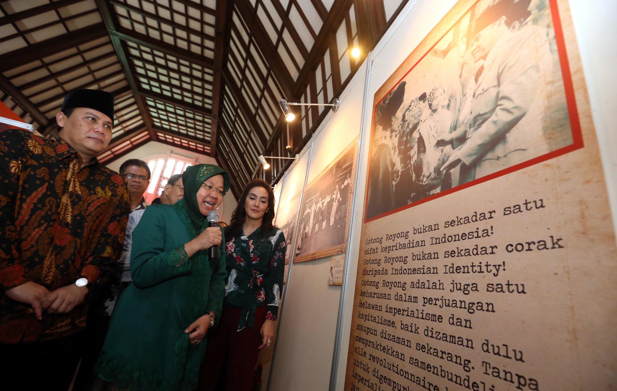 Wakil Ketua MPR Ahmad Basarah (kiri), Wali Kota Surabaya Tri Rismaharini (tengah) dan perwakilan komunitas Jas Merah yang juga Duta Arsip Nasional Rieke Diah Pitaloka (kanan), melihat foto Bung Karno koleksi Arsip Nasional Republik Indonesia (ANRI), yang dipamerkan dalam rangkaian pagelaran bertajuk ‘Tjamkan Pantja Sila, di Kantor Pos Kebon Rojo, Surabaya, Jawa Timur, Rabu (6/6/2018). Memori tentang sosok proklamator ini sebagai momentum hari kelahirannya ke 117 tahun, sekaligus mengenang Hari Lahir Pancasila, Hari Kelahiran dan Hari Wafatnya Bung Karno di bulan Juni. Pameran ini berlangsung hinggal 9 Juni 2018 dan disediakan 50 hingga 100 perangko bagi setiap pengunjung yang hadir. AKTUAL/HO