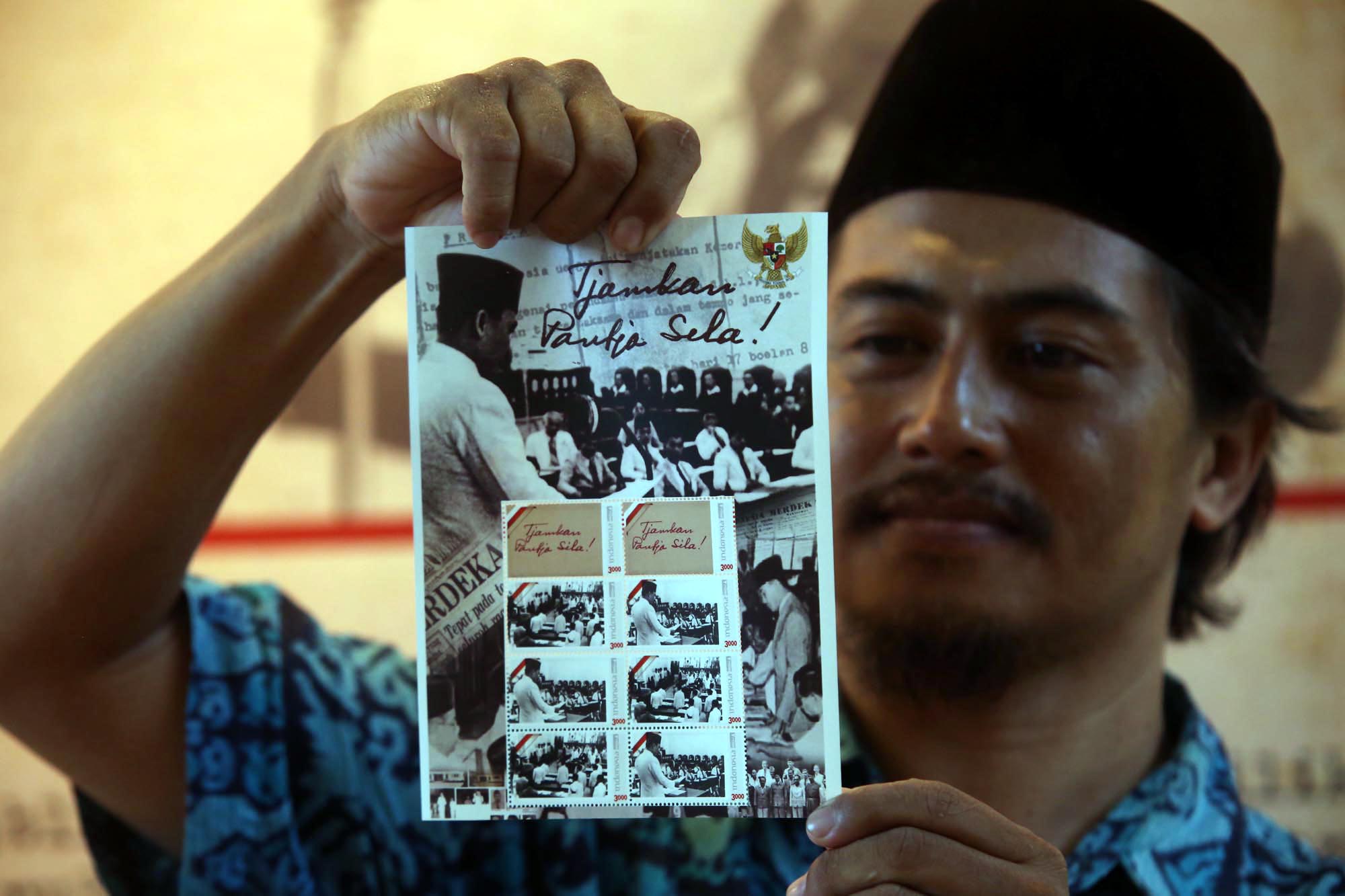 Suasana acara rangkaian pagelaran bertajuk ‘Tjamkan Pantja Sila, di Kantor Pos Kebon Rojo, Surabaya, Jawa Timur, Rabu (6/6/2018). Memori tentang sosok proklamator ini sebagai momentum hari kelahirannya ke 117 tahun, sekaligus mengenang Hari Lahir Pancasila, Hari Kelahiran dan Hari Wafatnya Bung Karno di bulan Juni. Pameran ini berlangsung hinggal 9 Juni 2018 dan disediakan 50 hingga 100 perangko bagi setiap pengunjung yang hadir. AKTUAL/HO