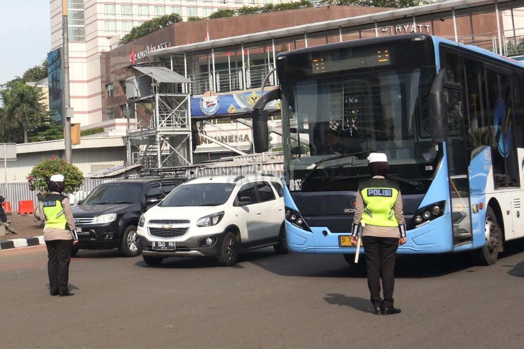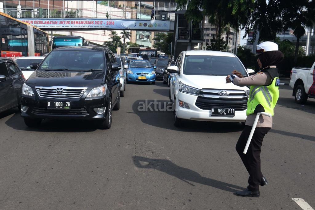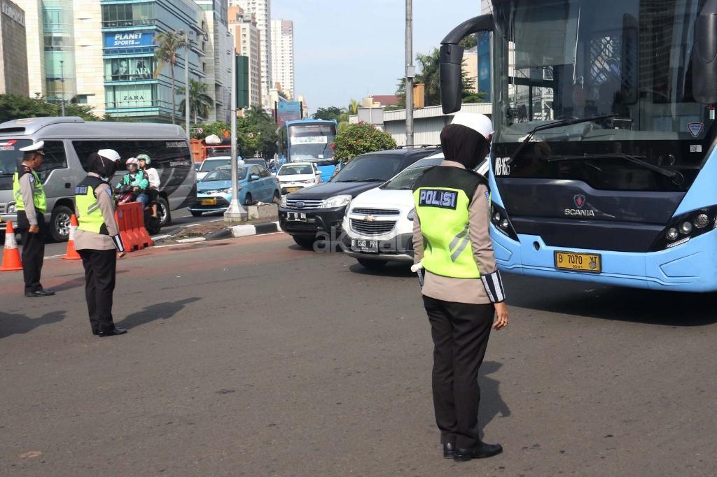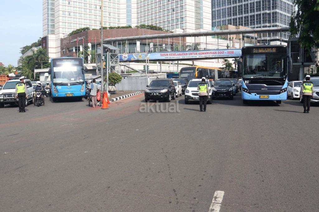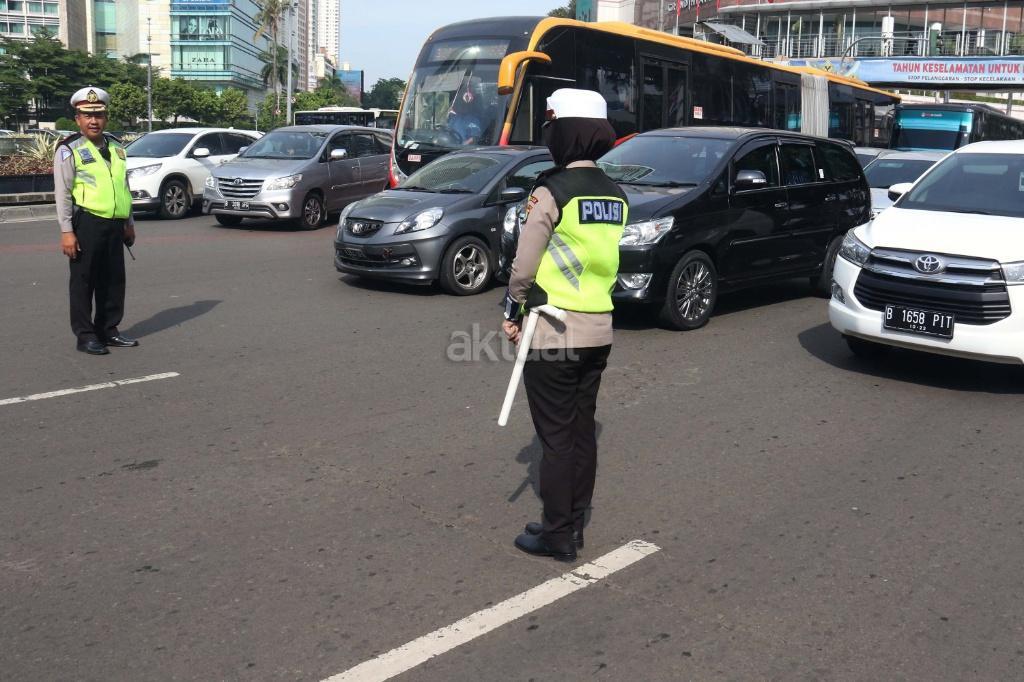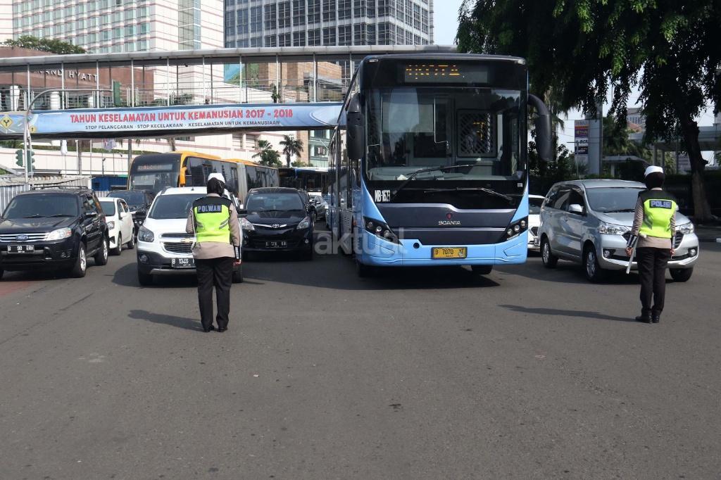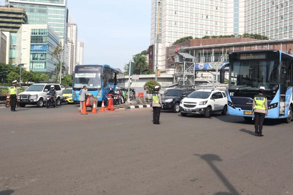 Sejumlah anggota Polisi Lanlu lintas memberhentikan sejumlah kendaraan dan mengheningkan cipta sejenak untuk memperingati Hari Pahlawan, di kawasan Bunderan HI, Jakarta, Jumat (10/11/2017). Kegiatan tersebut sekaligus dalam rangka menghormati jasa-jasa para pejuang dalam mempertahankan kemerdekaan. AKTUAL/Munzir