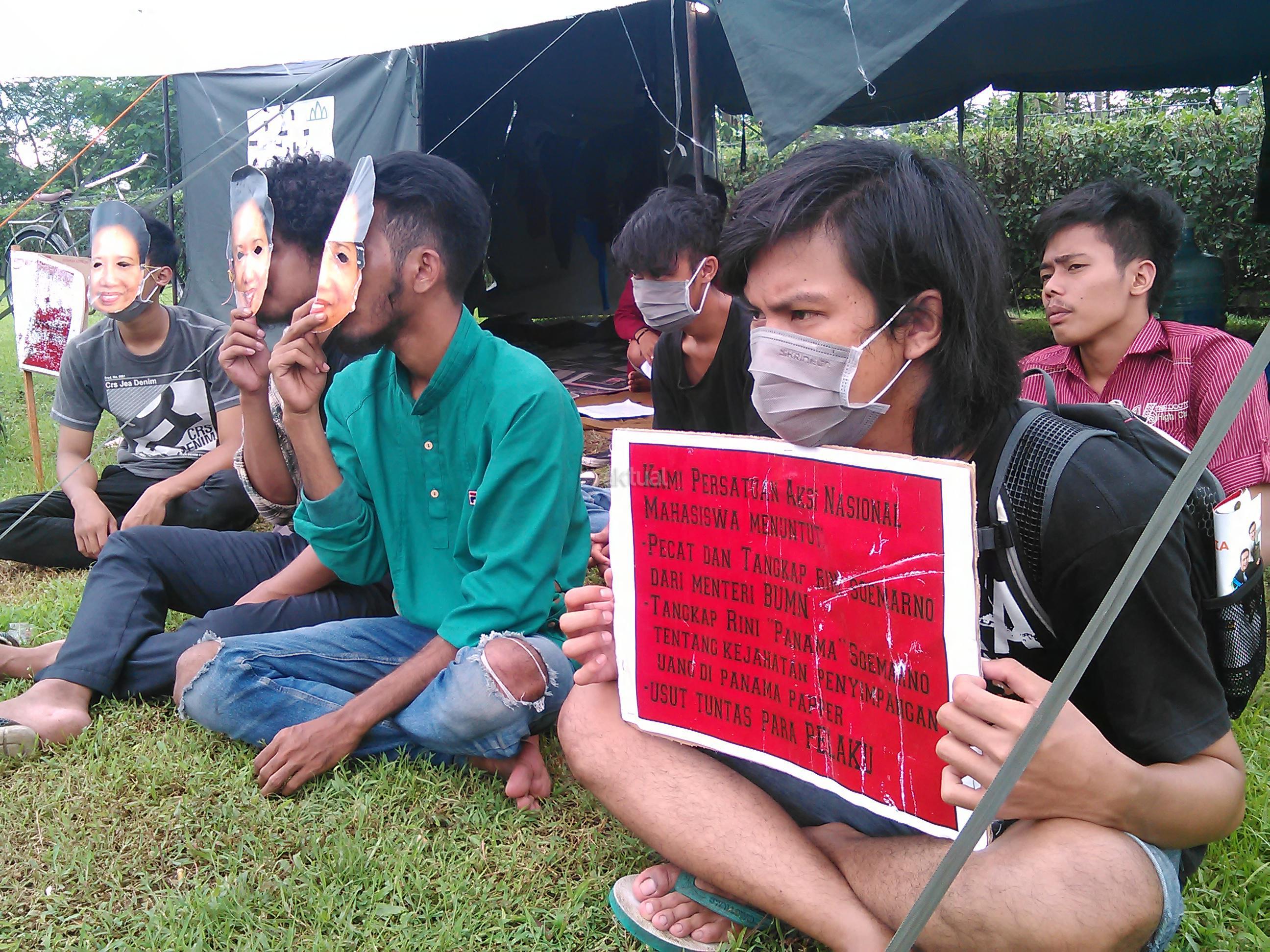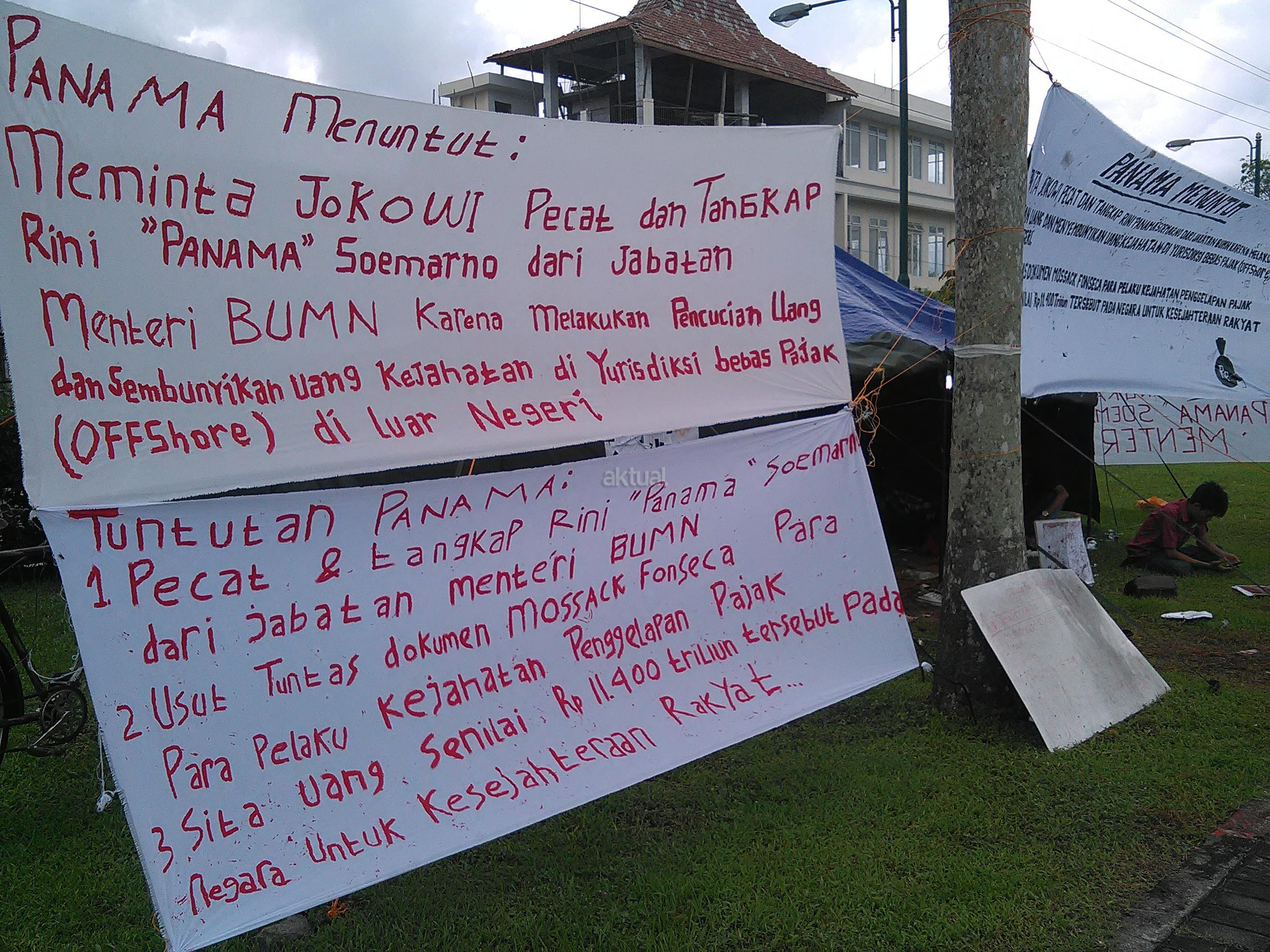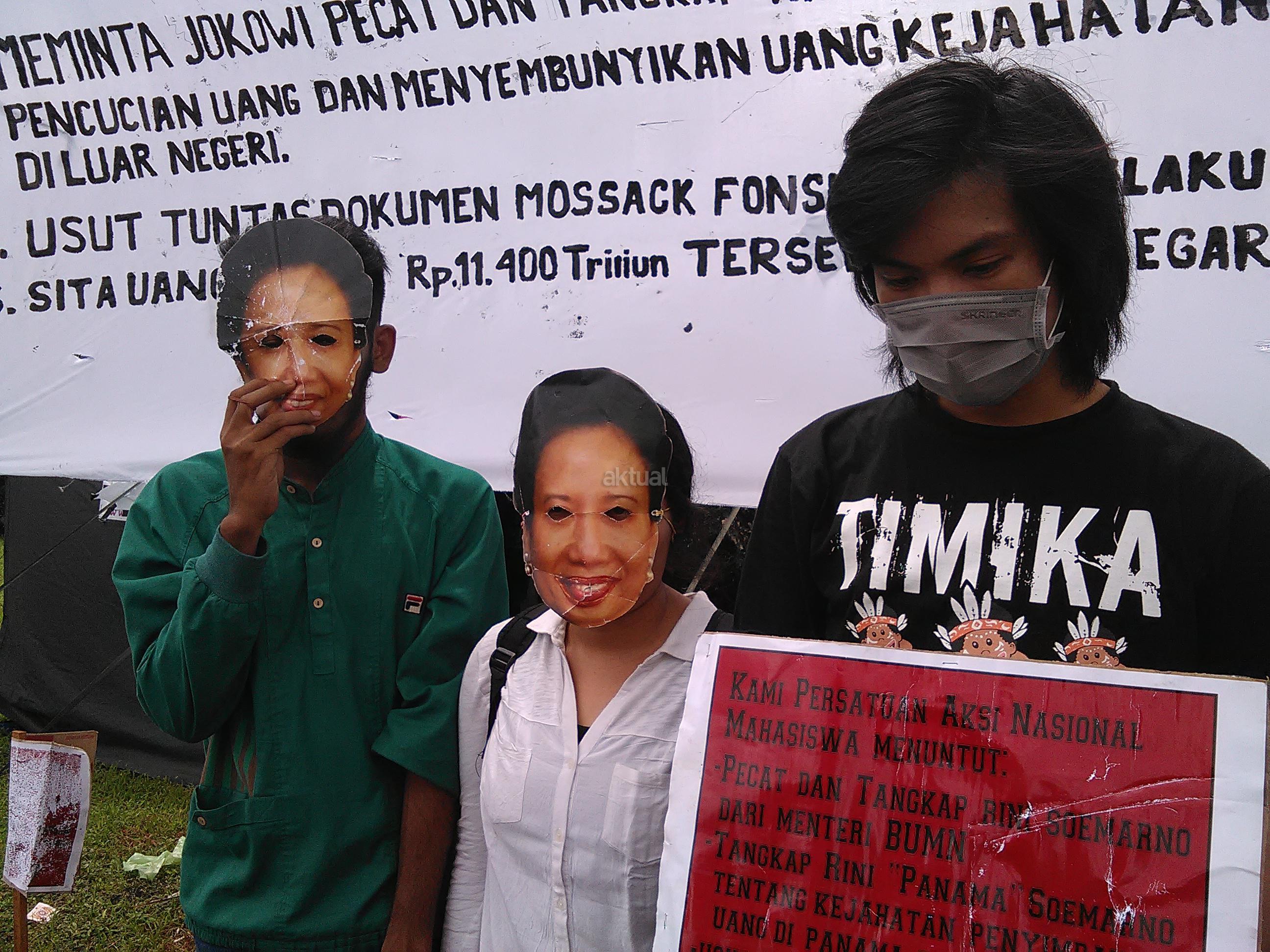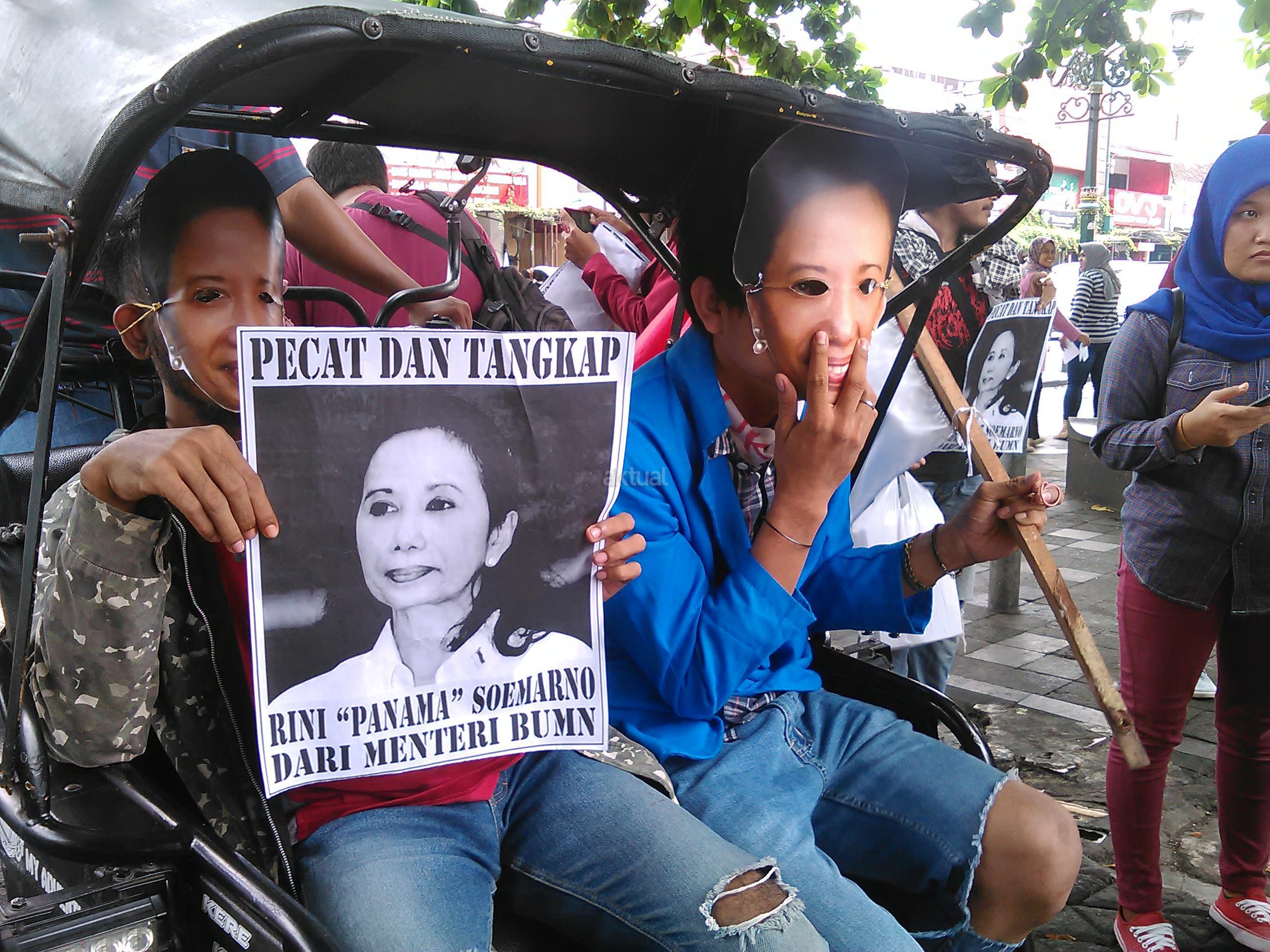 Mahasiswa yang tergabung dalam Aliansi Panama (Persatuan Aksi Nasional Mahasiswa) membawa poster Menteri BUMN Rini Soemarno dalam rangkaian aksi mogok makan untuk meminta Presiden Joko Widodo memecat Menteri BUMN, Rini Soemarno di Yogyakarta, Jumat (15/4). Tepat di Hari Pendidikan, 2 Mei 2016 mendatang, massa mahasiswa dari 45 kota, 178 kampus, akan memasuki Jakarta serentak melakukan aksi besar-besaran menuntut Presiden Jokowi menurunkan Rini Soemarno dari jabatannya sebagai Menteri BUMN. AKTUAL/NELSON NAFIS