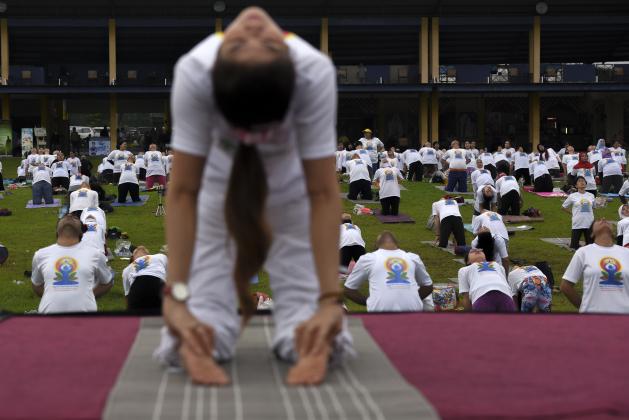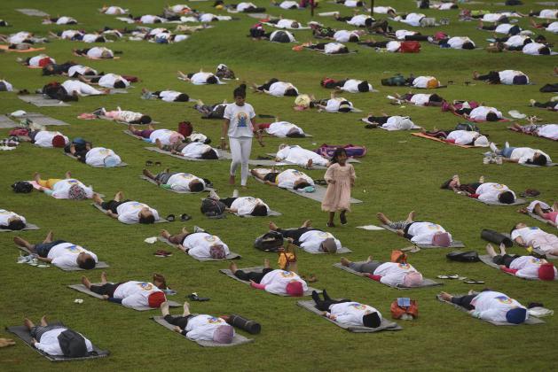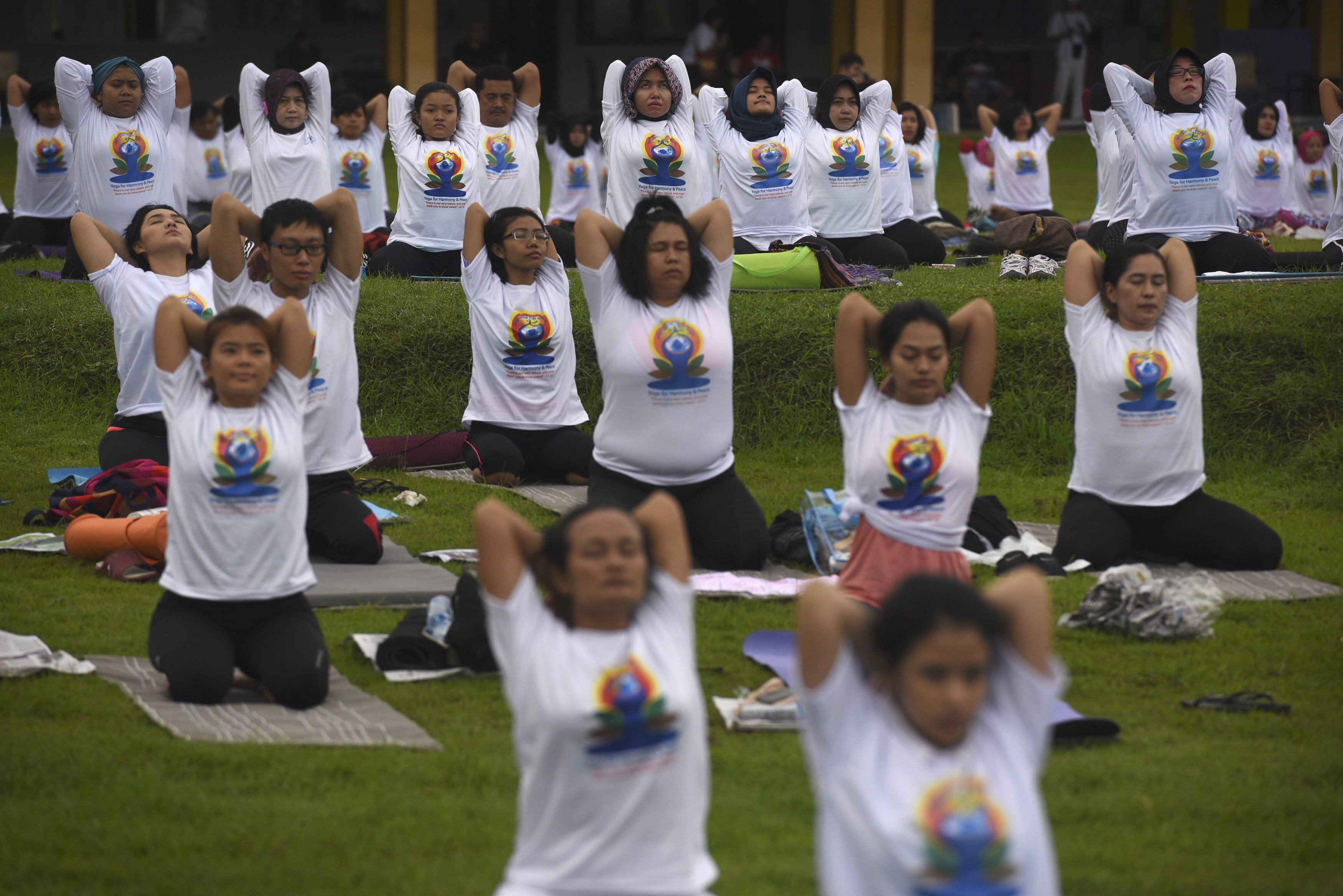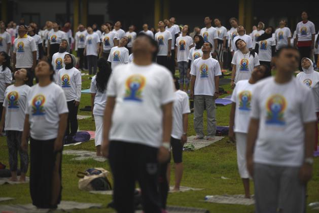 Sejumlah warga melakukan gerakan yoga bersama ketika memperingati Hari Yoga Internasional di Surabaya, Jawa Timur, Minggu (19/6). Yoga merupakan aktivitas fisik, mental dan spiritual yang telah berumur ribuan tahun dari India dan pada 11 Desember 2014, Majelis Umum PBB mendeklarasikan 21 Juni sebagai Hari Yoga Sedunia. ANTARA FOTO/Zabur Karuru/foc/16.