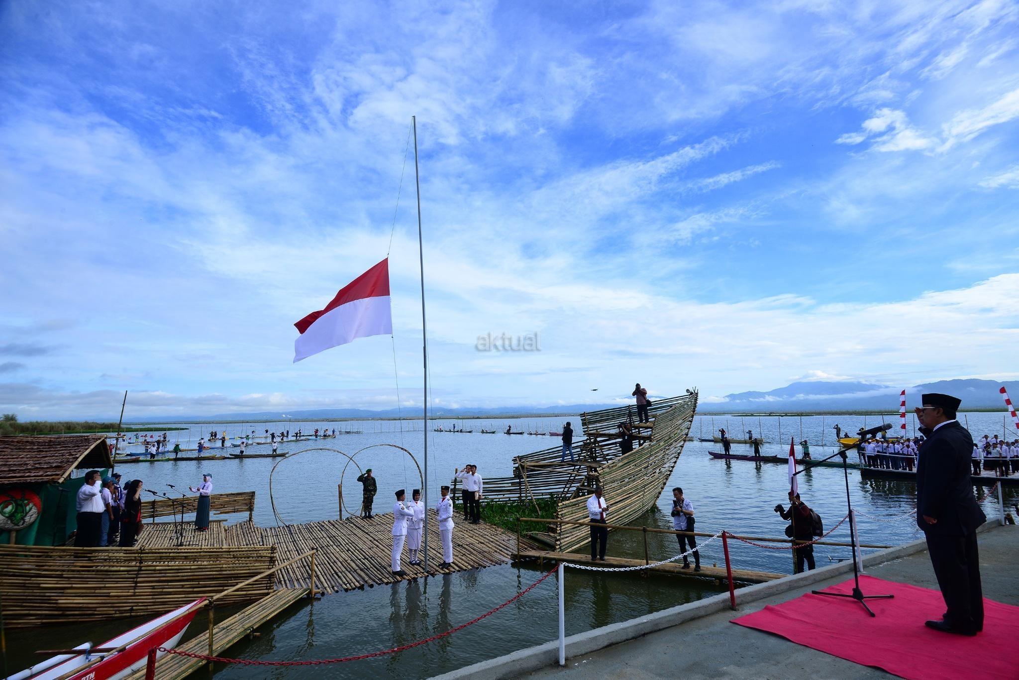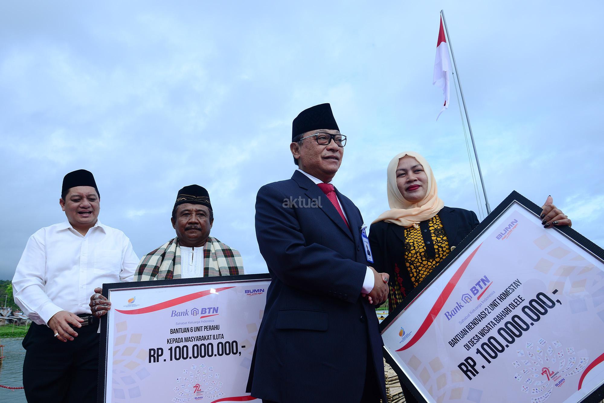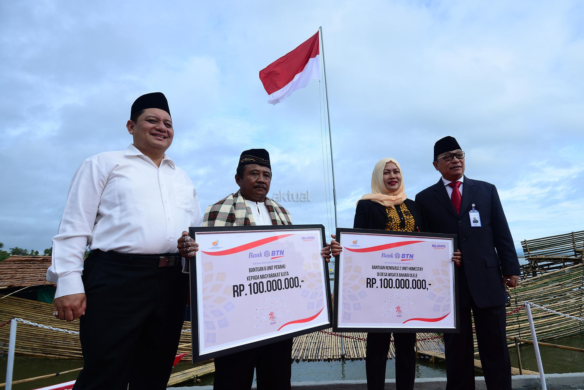 Upacara HUT Kemerdekaan RI ke 72 Bank BTN di Museum Pendaratan Pesawat Ampibi Soekarno, Desa Iluta, Kecamatan Batusa’a, Kabupaten Gorontalo, Kamis (17/8). Dalam kesempatan tersebut, Bank BTN menyerahkan bantuan berupa 6 unit perahu senilai Rp 100 juta, bantuan rehabilitasi 2 unit homestay atau rumah singgah di Desa Wisata Bahari Olele sebesar Rp 100 juta dan membangun kembali rumah veteran di Gorontalo sebagai wujud terima kasih kepada mereka yang telah berjasa dalam menegakkan NKRI. AKTUAL/Humas BTN