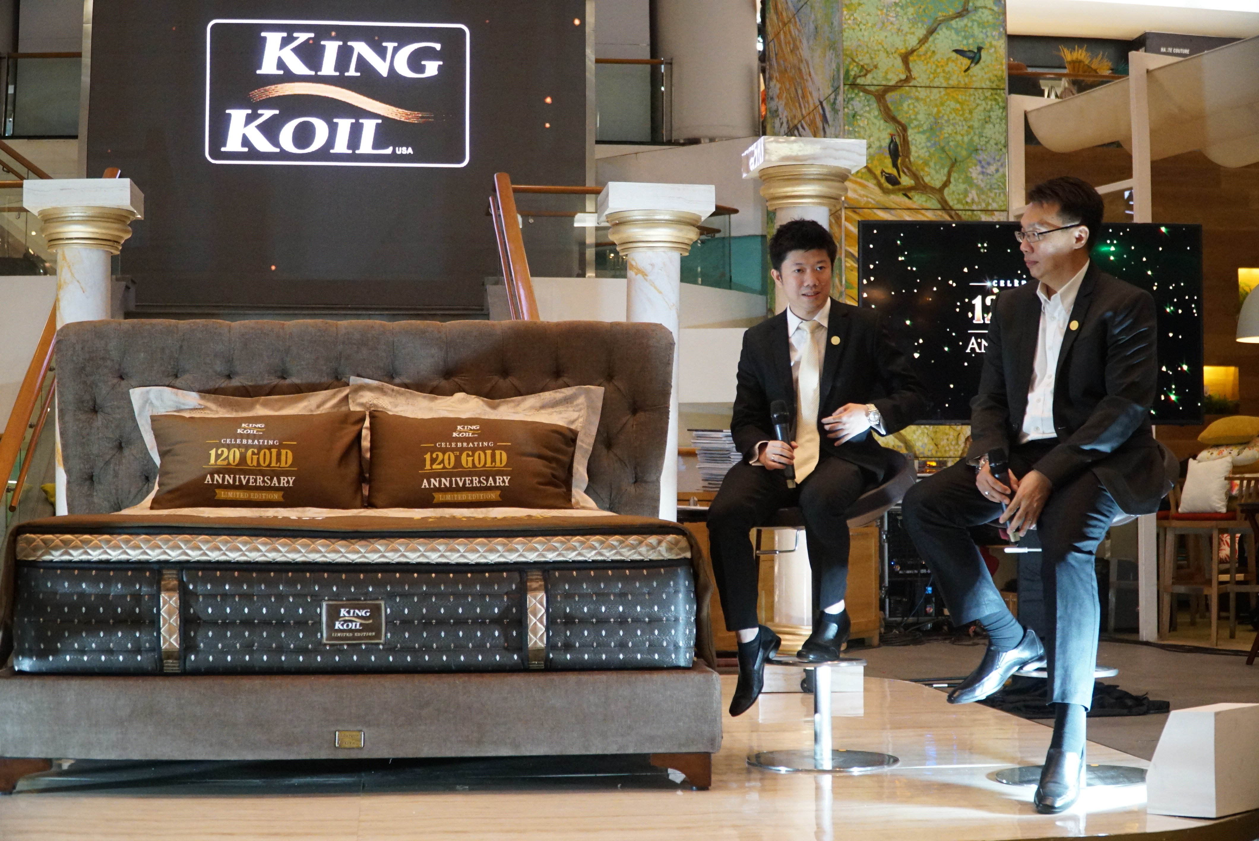 President Director of PT Duta Abadi Primantara, Anthony Setiawan (kanan) bersama Sales & Marketing Director PT Duta Abadi Primantara Aria Hermawan berbincang disela peluncuran produk baru dan perayaan perjalanan 120 tahun King Koil di Jakarta, Rabu (12/12). Di usia emasnya, King Koil® kini telah dibuat di lebih dari 30 negara dan memiliki distributor di lebih dari 90 negara. Sebagai wujud terima kasih kepada para pengguna setianya, King Koil® meluncurkan 120th Gold Limited Edition, sebuah mattress eksklusif dalam edisi terbatas. Di Indonesia, 120th Gold Limited Edition hanya diproduksi sebanyak 250 buah dan disertai dengan sertifikat keaslian disetiap pembeliannya. AKTUAL/Eko S Hilman