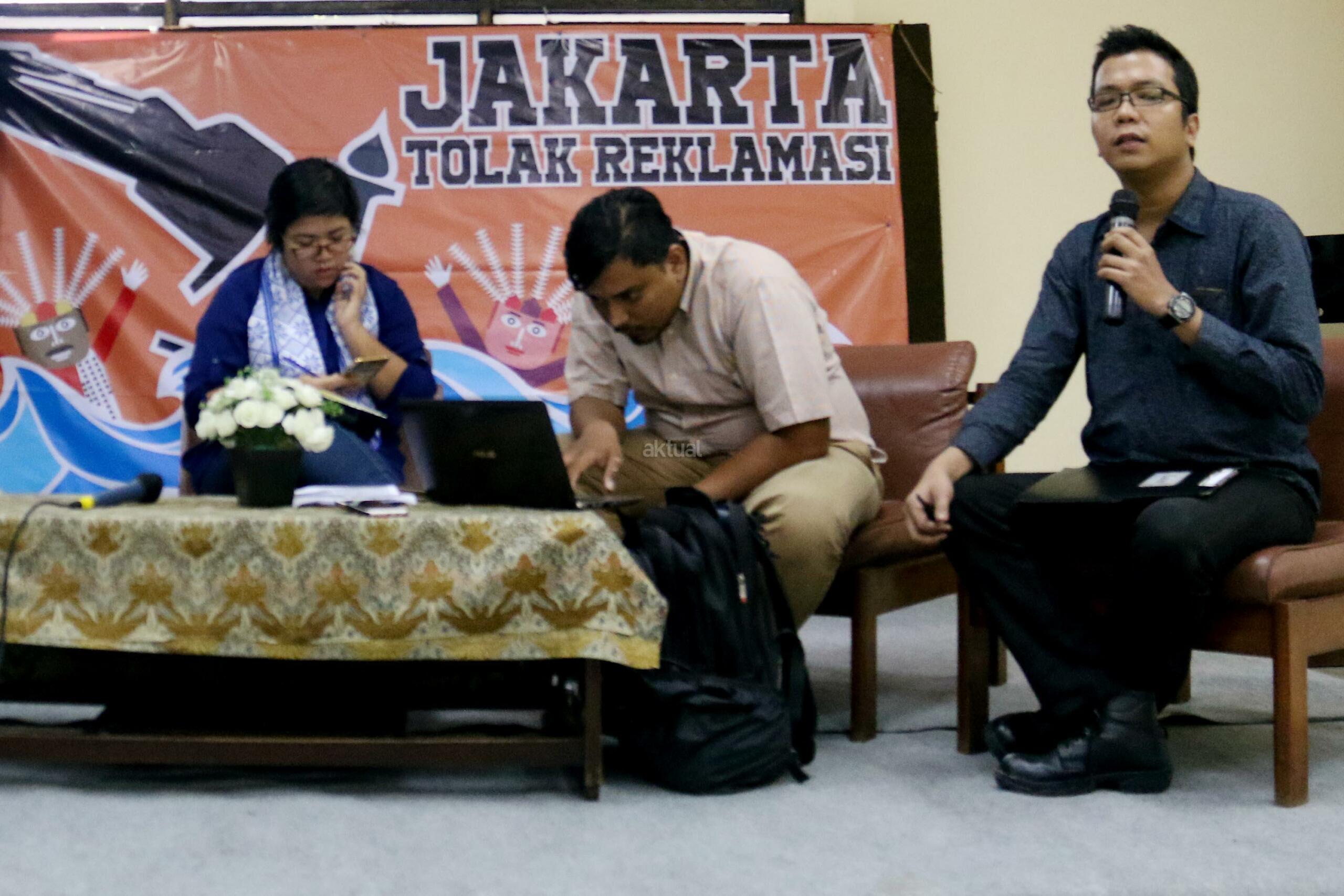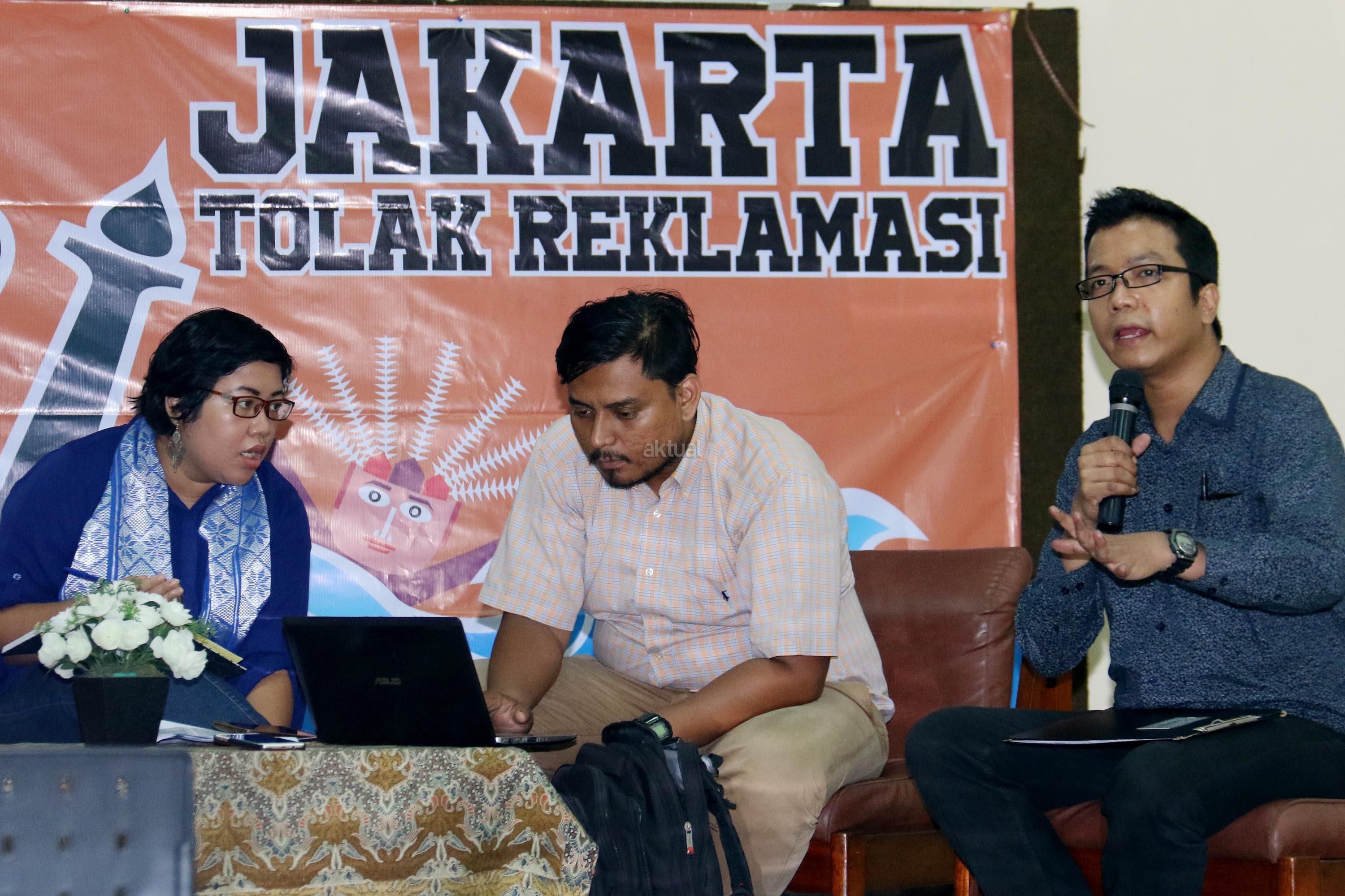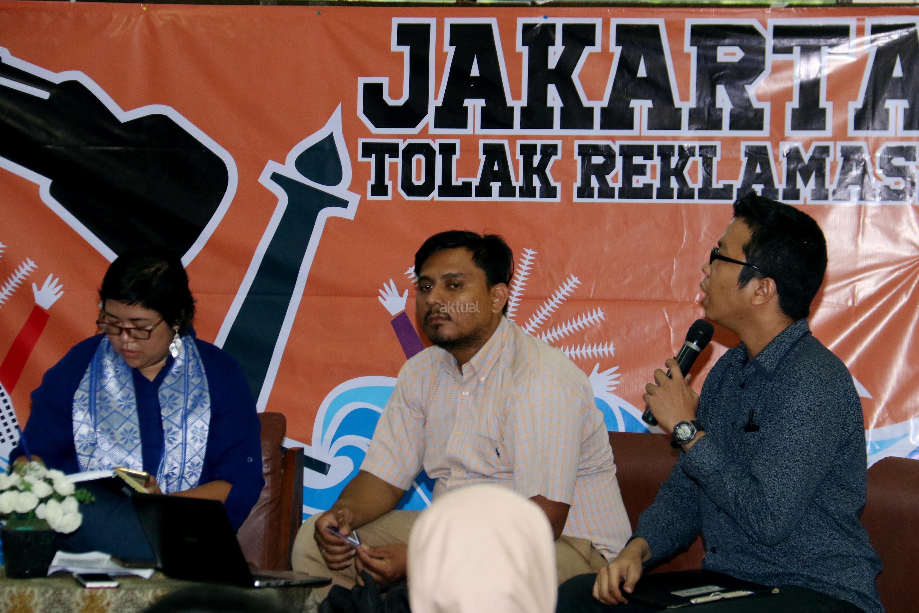 Kiri-kanan ; Kepala Program Solidaritas Perempuan Dinda Nisa Yura, Ketua KNTI Martin Hadiwinata, Pengacara Publik LBH Nelson Simamora saat menjadi pembicara diskusi Senior Citizen dikantor LBH, Jakarta Selasa (17/10/2017). Diskusi yang diselenggarakan oleh BEM FHUI dan Koalisi Selamatkan Teluk Jakarta dengan tema Kenduri Laut Perjuangan Nelayan Menghadapi Ancaman Reklamasi Pesisir. AKTUAL/Munzir