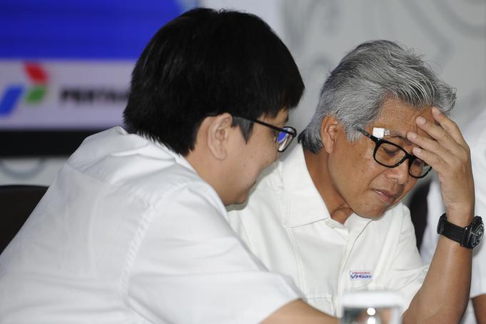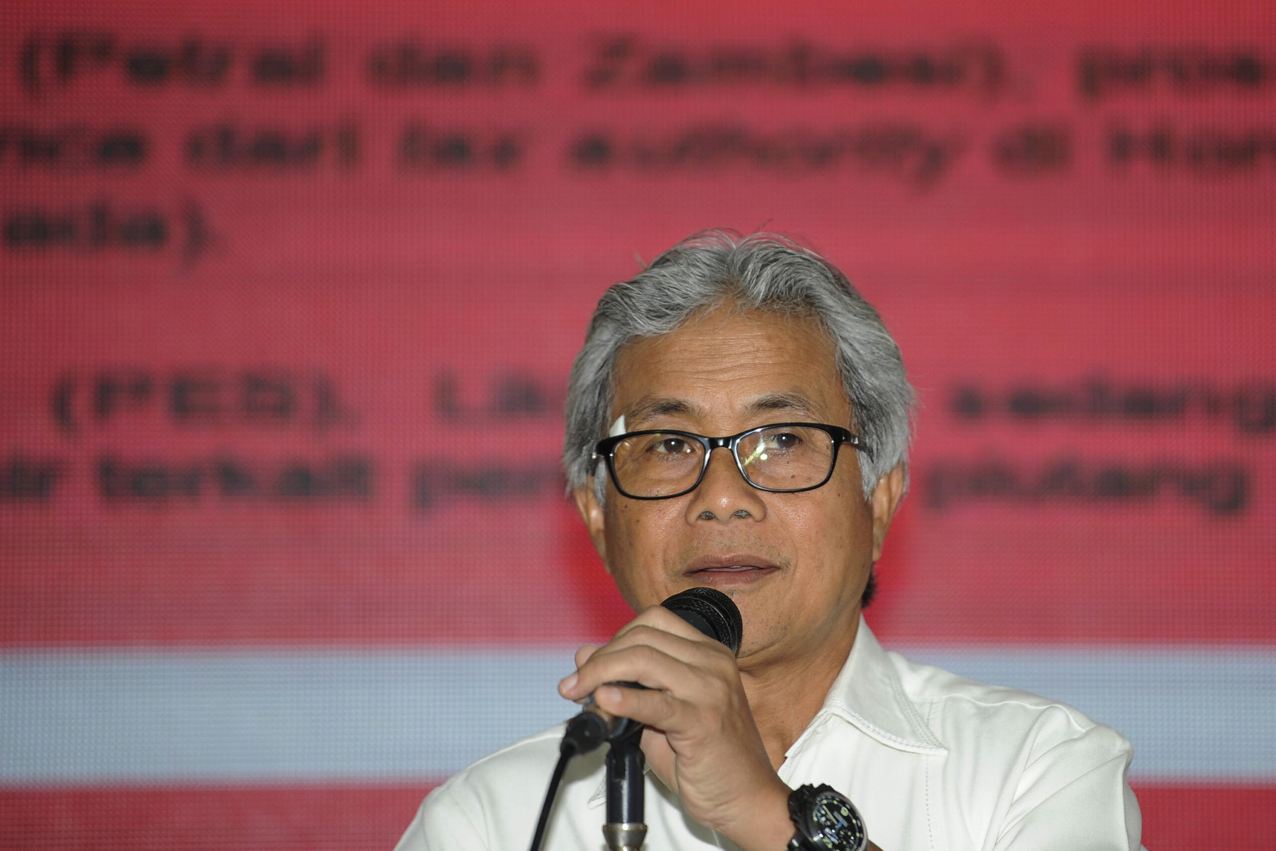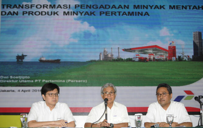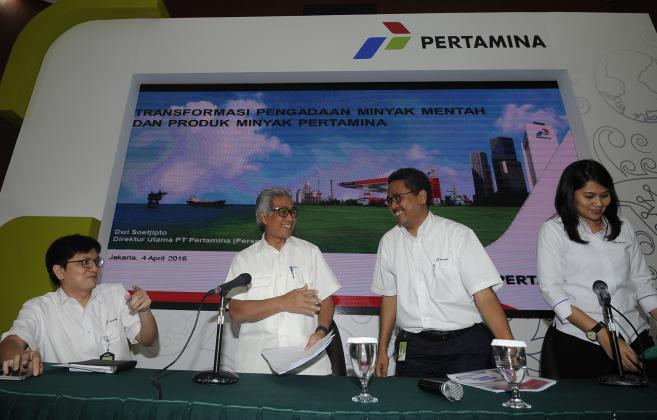 Dirut PT Pertamina (Persero) Dwi Soetjipto (kanan) berbincang dengan Direktur Keuangan Arief Budiman (kiri) saat memberikan keterangan pers terkait likuidasi Petral Group di Jakarta, Senin (4/4). Pertamina telah melakukan formal likuidasi Petral Group yang terdiri dari Zambesi, Petral dan PES pada Februari 2016 lalu sehingga lebih cepat dari target sebelumnya yakni Juni 2016. ANTARA FOTO/Sigid Kurniawan/pras/16.
