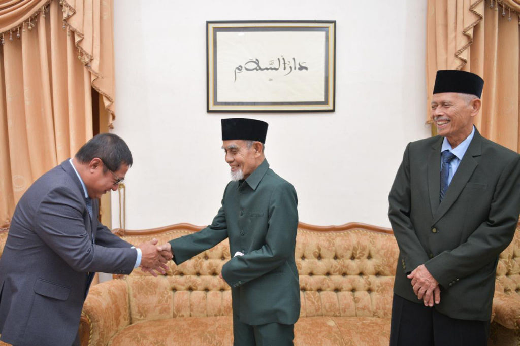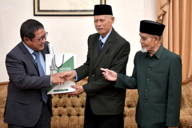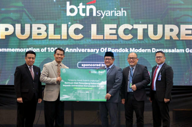 Direktur Utama Bank Syariah Nasional (BSN) Alex Sofjan Noor menyerahkan bantuan kepada Dosen Fakultas Ekonomi Dan Manajemen UNIDA Gontor Royyan Ramdhani Djayusman, disaksikan Wakil Rektor II Setiawan bin Lahuri, Corporate Secretary BSN Dody Agoeng, Kepala BTN Syariah Solo Toni Ardiansyah saat penyerahan bantuan sosial motor sampah untuk lingkungan pendidikan hijau di sela-sela kuliah umum di Universitas Darusaalam Gontor, Ponorogo, Madiun, Jawa Timur, Kamis (4/12).