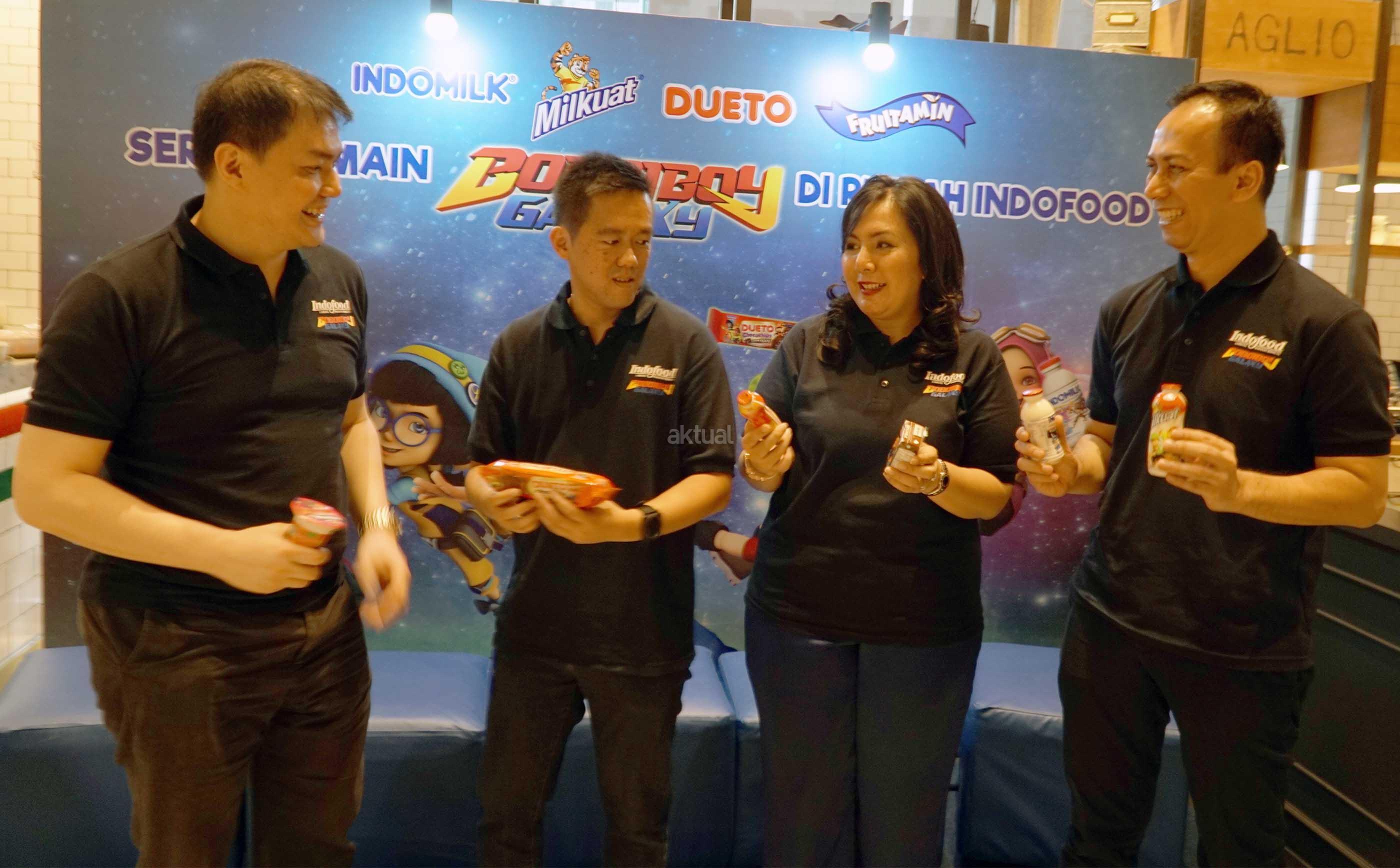(dari kiri ke kanan) General Manager Marketing Divisi Minuman Dalam Kemasan PT Indofood CBP Sukses Makmur Tbk, Budiyanto Bambang,Senior Brand Manager Biscuit PT Indofood CBP Sukses Makmur Tbk, Abraham Nandiwardhana, General Manager Marketing Indomilk Liquid,Powder, dan Milkuat,PT Indofood CBP Sukses Makmur Tbk, Vanda Ratana , Head Of Consumer Engagement Corporate Marketing PT Indofood CBP Sukses Makmur Tbk, Fierman Authar saat jumpa pers dan peluncuran program tersebut di Jakarta, senin (5/5).Program permainan Boboiboy ini yang sebelumnya adalah konsep papan permainan Indomilik Boboiboy Galaxy, tahun ini dikemas dalam permainan ular tangga dengan tema petualangan sehingga akan lebih seru jika dimaninkan dengan lebih banyak teman.Rangkaian ini akan diadakan dari Juni hingga September 2017 di berbagai lokasi seperti minimarket, supermarket, mall, sekolah, tempat rekreasi dan lain lain dengan tujuan untuk menambah keseruan pertemanan anak anak Indonesia. AKTUAL/Eko S Hilman