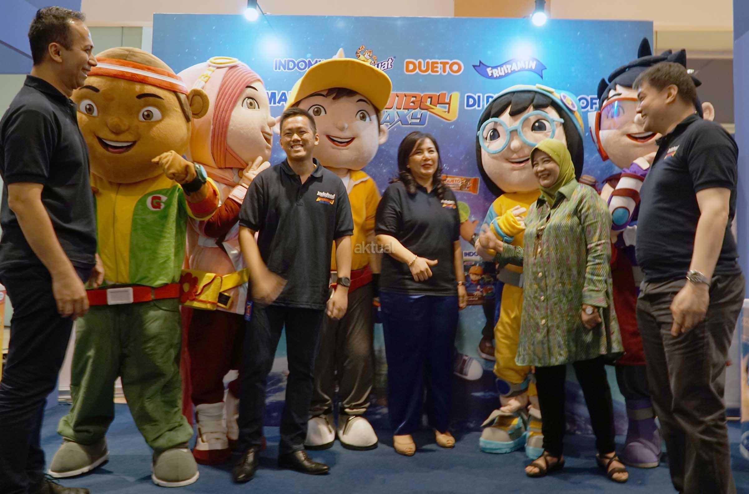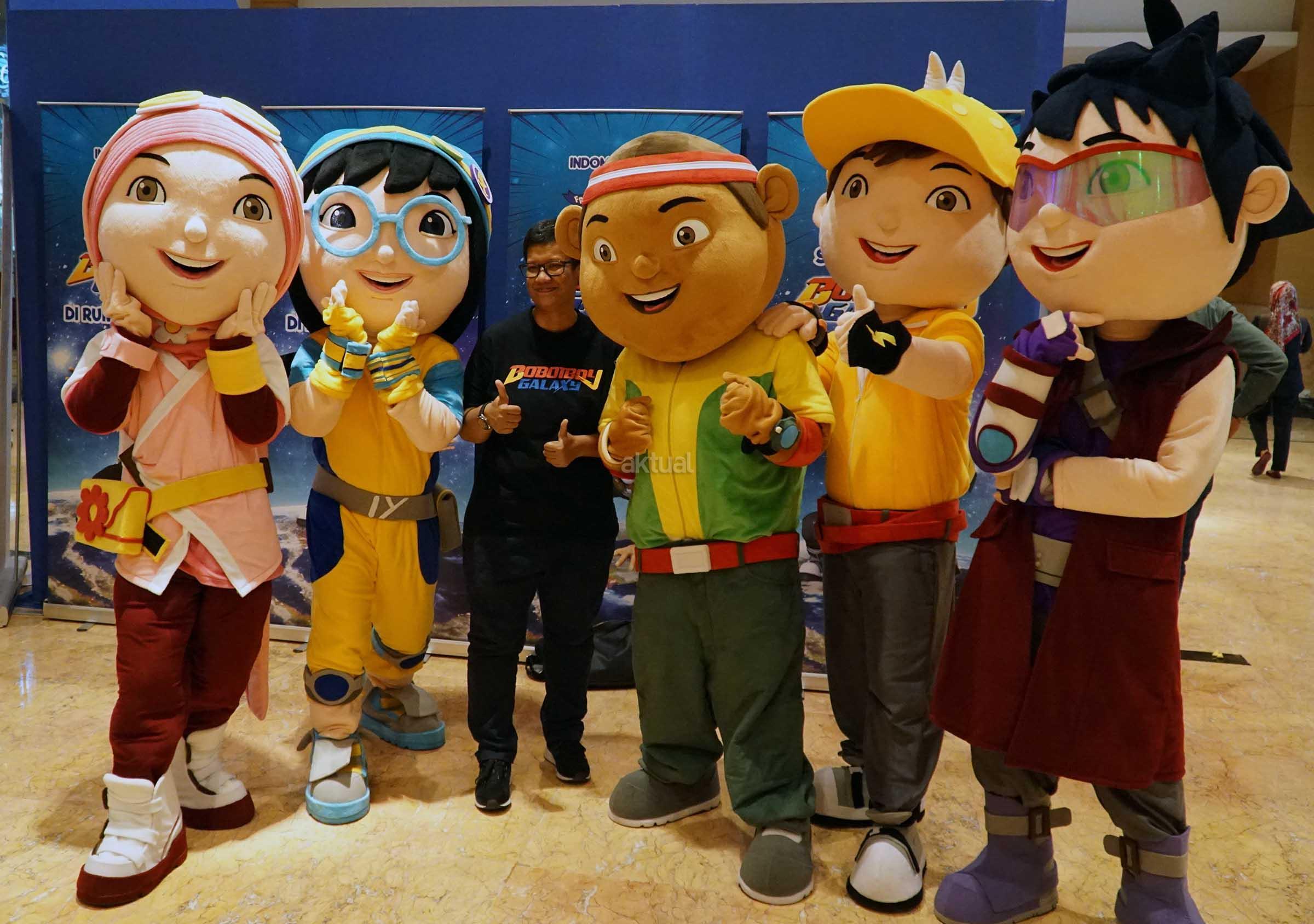 Seorang pengunjung saat berfoto bersama dengan maskot pendukung serunya main Boboiboy saat peluncurannnya di jakarta, senin (5/6). AKTUAL/Eko S Hilman