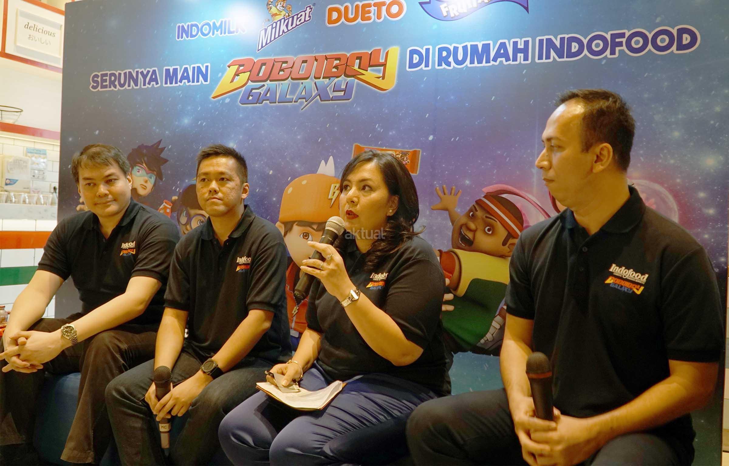 General Manager Marketing Divisi Minuman Dalam Kemasan PT Indofood CBP Sukses Makmur Tbk, Budiyanto Bambang,Senior Brand Manager Biscuit PT Indofood CBP Sukses Makmur Tbk, Abraham Nandiwardhana, General Manager Marketing Indomilk Liquid,Powder, dan Milkuat,PT Indofood CBP Sukses Makmur Tbk, Vanda Ratana , Head Of Consumer Engagement Corporate Marketing PT Indofood CBP Sukses Makmur Tbk, Fierman Authar berbincang disela peluncuran program tersebut di Jakarta, senin (5/5).Program permainan Boboiboy ini yang sebelumnya adalah konsep papan permainan Indomilik Boboiboy Galaxy, tahun ini dikemas dalam permainan ular tangga dengan tema petualangan sehingga akan lebih seru jika dimaninkan dengan lebih banyak teman.Rangkaian ini akan diadakan dari Juni hingga September 2017 di berbagai lokasi seperti minimarket, supermarket, mall, sekolah, tempat rekreasi dan lain lain dengan tujuan untuk menambah keseruan pertemanan anak anak Indonesia. AKTUAL/Eko S Hilman