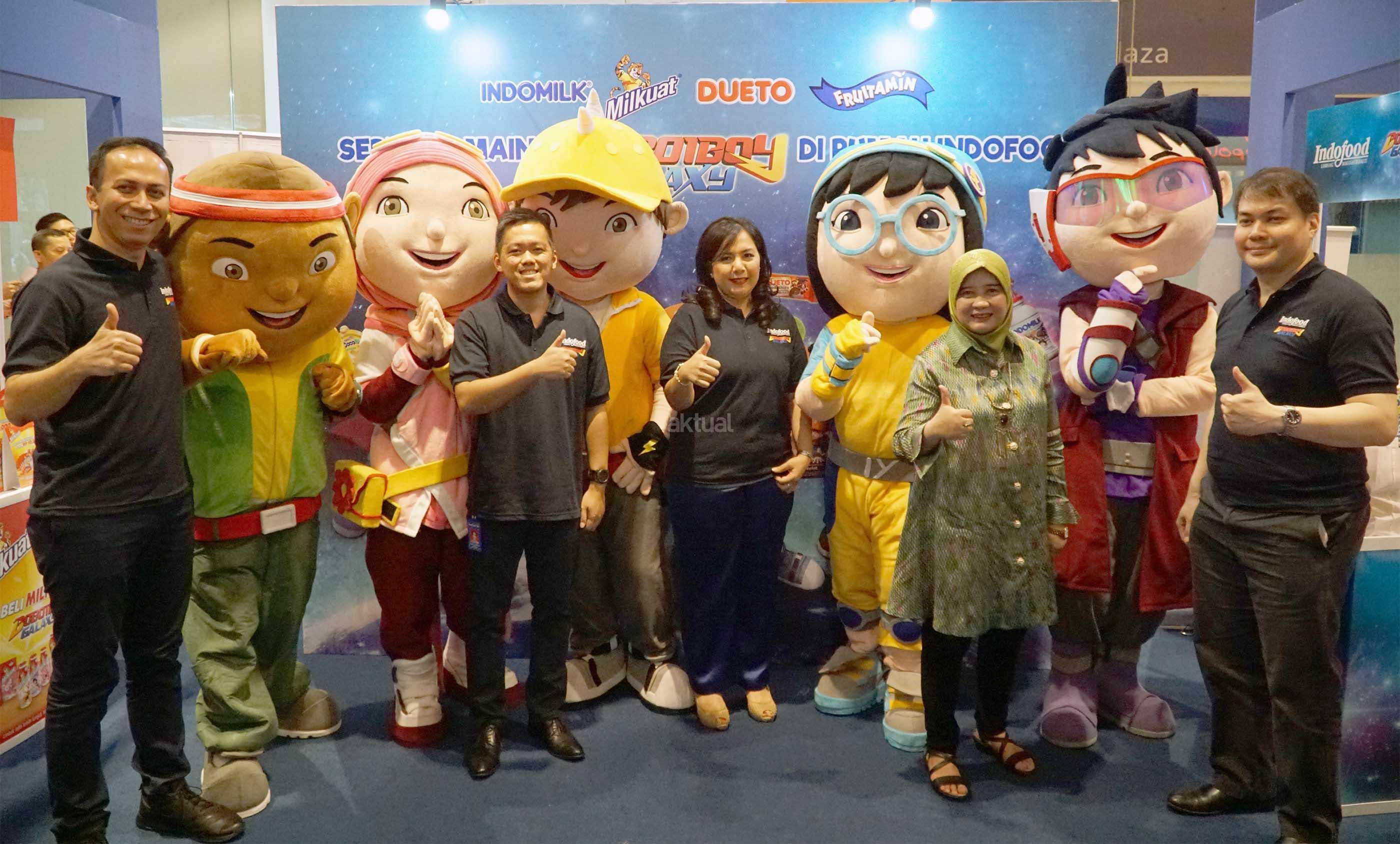 (dari kiri ke kanan) Head Of Consumer Engagement Corporate Marketing PT Indofood CBP Sukses Makmur Tbk, Fierman Authar, Senior Brand Manager Biscuit PT Indofood CBP Sukses Makmur Tbk, Abraham Nandiwardhana, General Manager Marketing Indomilk Liquid,Powder, dan Milkuat,PT Indofood CBP Sukses Makmur Tbk, Vanda Ratana, Direktur DNA Entertainment Boboiboy Licenser, Rina Novita, General Manager Marketing Divisi Minuman Dalam Kemasan PT Indofood CBP Sukses Makmur Tbk, Budiyanto Bambang berfoto bersama dengan maskot pendukung Boboiboy Galaxy seusai peluncuran program tersebut di Jakarta, senin (5/5).Program permainan Boboiboy ini yang sebelumnya adalah konsep papan permainan Indomilik Boboiboy Galaxy, tahun ini dikemas dalam permainan ular tangga dengan tema petualangan sehingga akan lebih seru jika dimaninkan dengan lebih banyak teman.Rangkaian ini akan diadakan dari Juni hingga September 2017 di berbagai lokasi seperti minimarket, supermarket, mall, sekolah, tempat rekreasi dan lain lain dengan tujuan untuk menambah keseruan pertemanan anak anak Indonesia. AKTUAL/Eko S Hilman