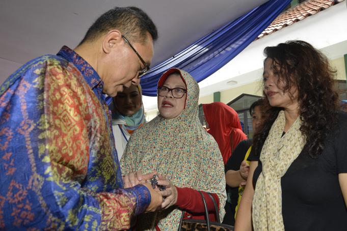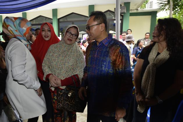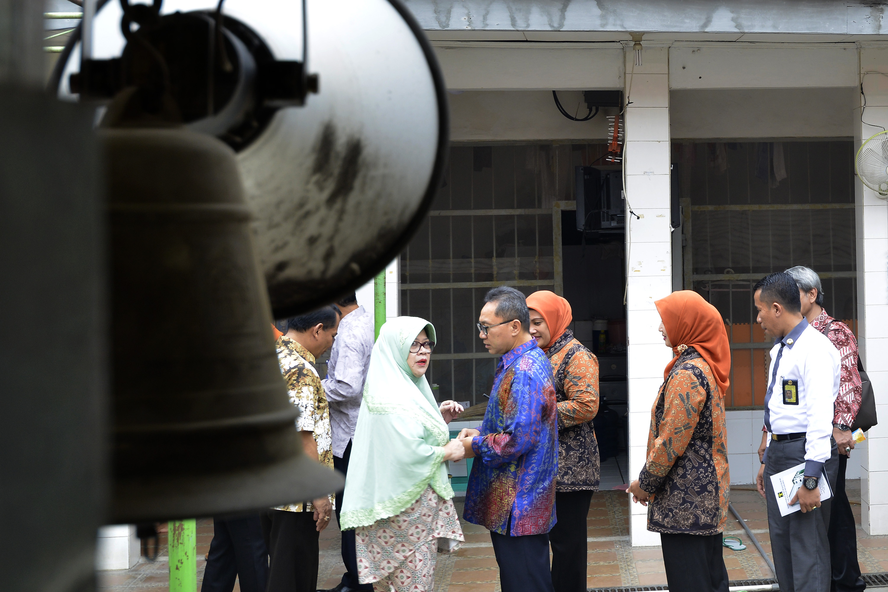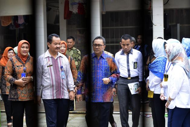 Ketua MPR Zulkifli Hasan (kiri) menerima cenderamata hasil kreasi dari Terpidana kasus suap anggota DPR Dewie Yasin Limpo (kedua kiri) dalam kunjungan ke Rutan Klas II A Pondok Bambu, Jakarta, Jumat (27/5). Dalam kunjungan kerja tersebut, sejumlah penghuni rutan meminta perubahan PP No.99 tahun 2012 kemungkinan revisi PP No. 99 Tahun 2012 yang mengatur pengetatan aturan pemberian remisi kepada narapidana (napi) kasus korupsi, narkotika dan terorisme. ANTARA FOTO/Rosa Panggabean/foc/16.