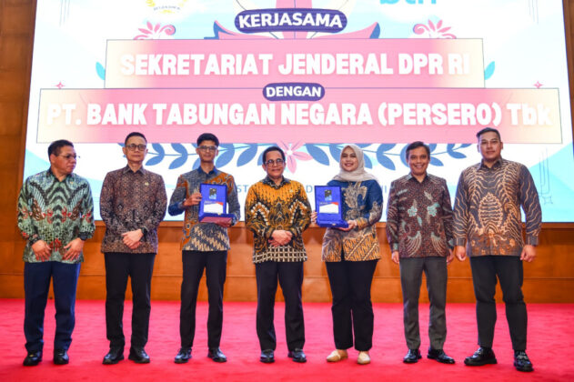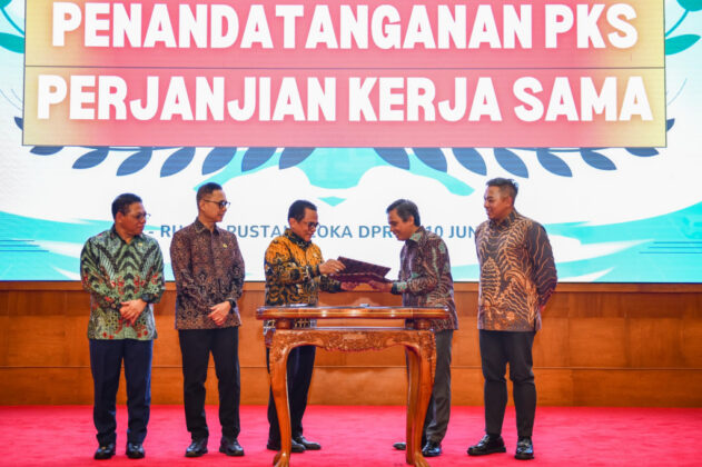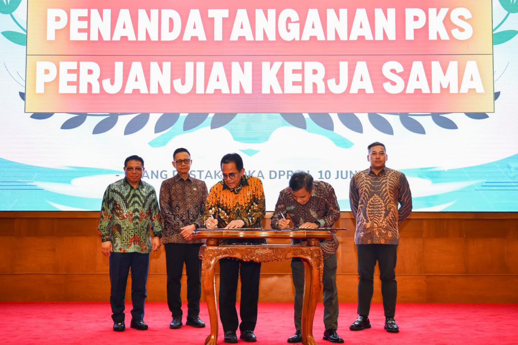 Direktur Utama BTN Nixon LP Napitupulu bersama Sekretaris Jenderal DPR RI Indra Iskandar menandatangani Perjanjian Kerja Sama antara BTN dan Sekretariat Jenderal (Setjen) DPR RI terkait Penyediaan Layanan Jasa Perbankan disaksikan oleh Direktur Network & Retail Funding BTN Rully Setiawan, Kepala Badan Keahlian Setjen DPR RI Inosentius Samsul, dan Deputi Bidang Administrasi Setjen DPR RI Sumariyandono, di Gedung Nusantara IV, Kompleks Parlemen Senayan, Jakarta, Selasa (10/6).