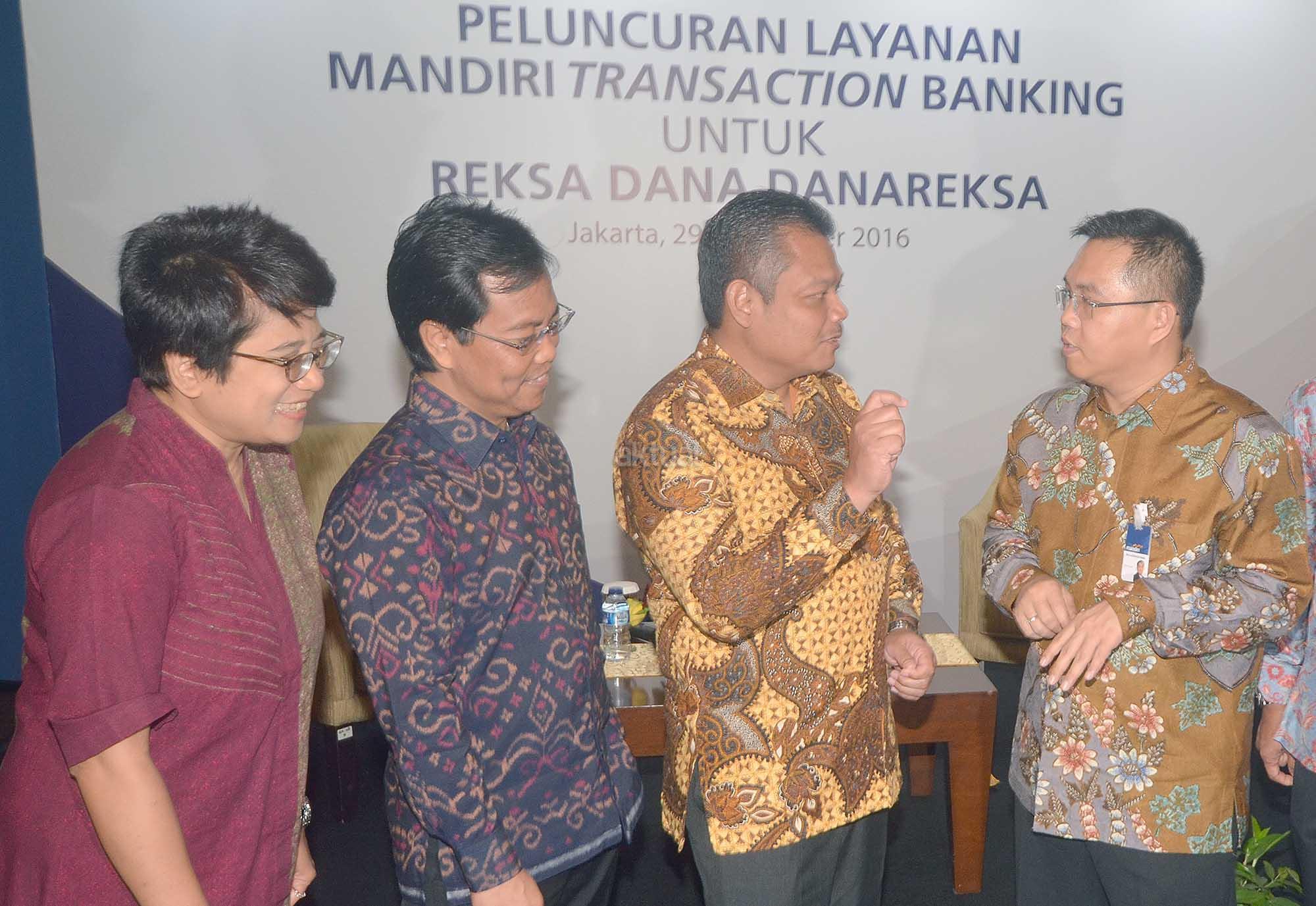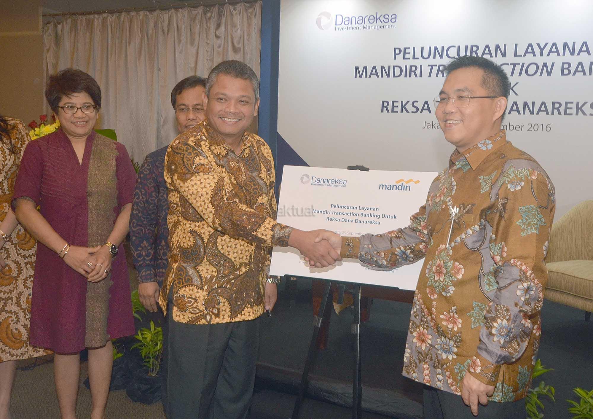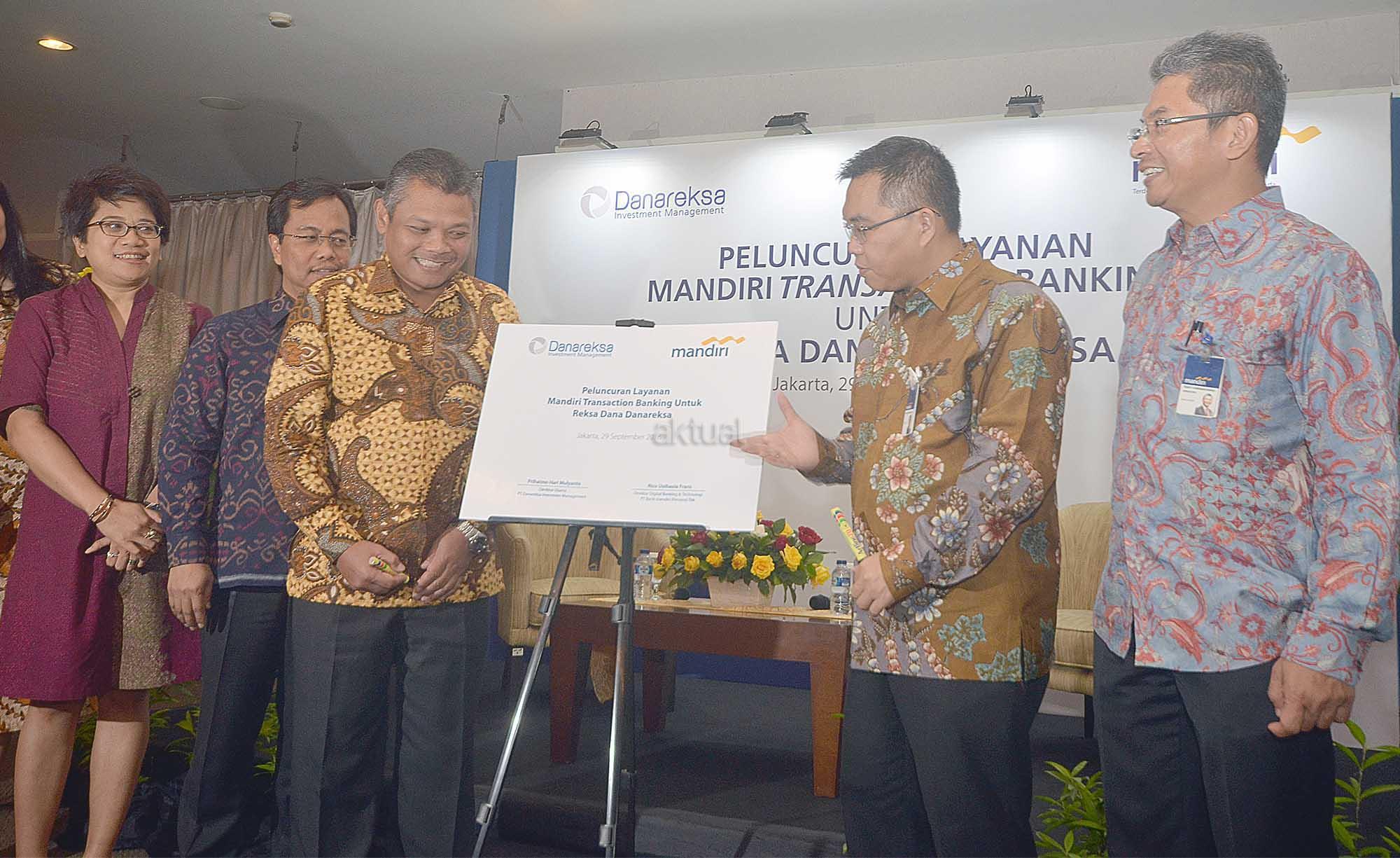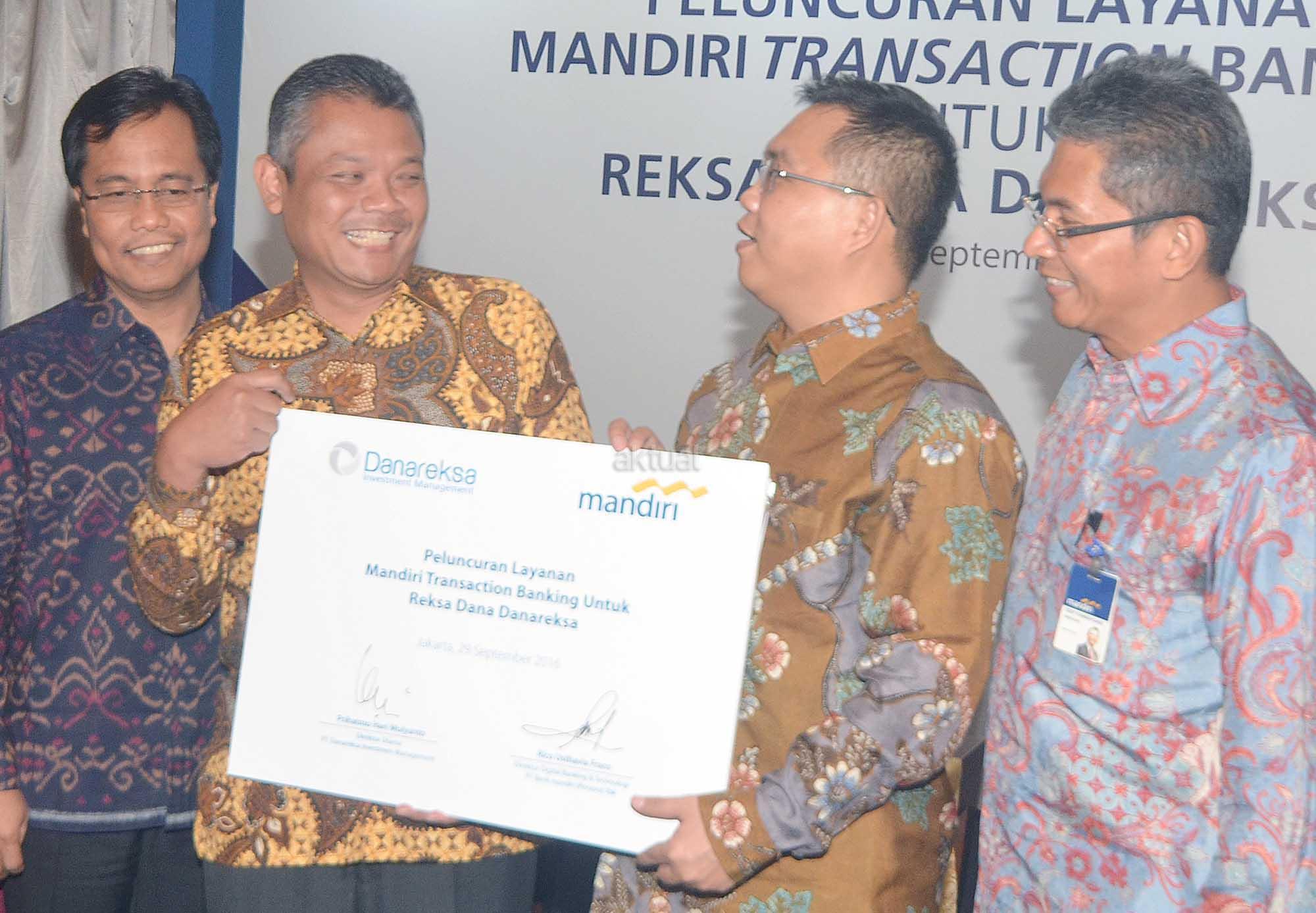 Dari kiri ke kanan: Direktur Danareksa Investment Management (DIM) Egi Indrawati Santosa, Direktur PT Danareksa (Persero) Bondan Pristiwandana, Dirut DIM Prihatmo Hari Mulyanto, Direktur Digital Banking dan Technology Bank Mandiri Rico Usthavia Frans usai penandatanganan perjanjian kerjasama pemanfaatan transaksi perbankan untuk investor retail di Jakarta, Kamis, 29 September 2016.Danareksa Investment Management (DIM) menandatangani perjanjian kerjasama dengan Bank mandiri berkaitan dengan peluncuran layanan Mandiri Transaction Banking . Melalui kerjasama ini, investor retail dapat memanfaatkan layanan Mandiri Auto Debit dan Clickpay untuk solusi transaksi perbankan saat berinvestasi reksa dana di Danareksa. Harapannya, kerjasama ini dapat mendukung upaya pendalaman pasar keuangan domestik melalui penambahan investor retail.