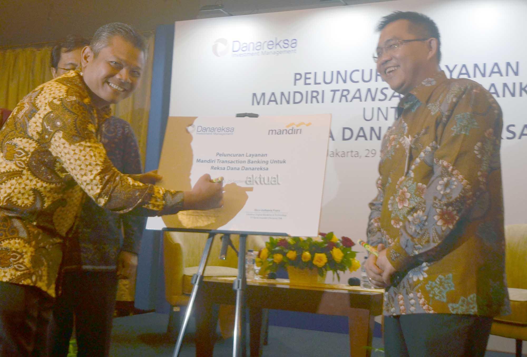 Direktur Utama Danareksa Investment Management (DIM) Prihatmo Hari Mulyanto (kiri) disaksikan Direktur Digital Banking dan Technology Bank Mandiri Rico Usthavia Frans menandatangani perjanjian kerjasama pemanfaatan transaksi perbankan untuk investor retail antara DIM dengan Bank Mandiri di Jakarta, Kamis, 29 September 2016. Melalui kerjasama ini, investor retail dapat memanfaatkan layanan Mandiri Auto Debit dan Clickpay untuk solusi transaksi perbankan saat berinvestasi reksa dana di Danareksa. Harapannya, kerjasama ini dapat mendukung upaya pendalaman pasar keuangan domestik melalui penambahan investor retail.