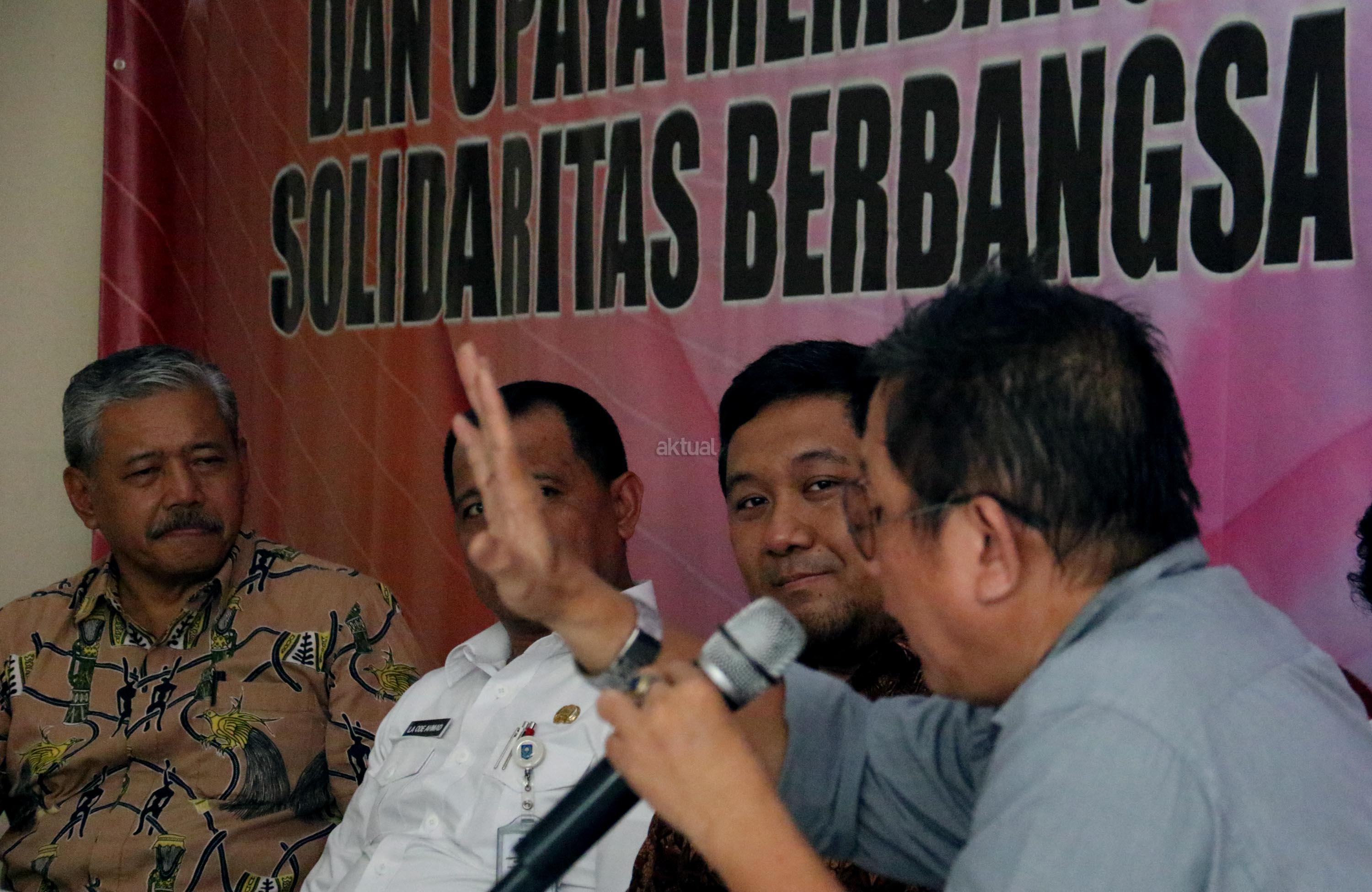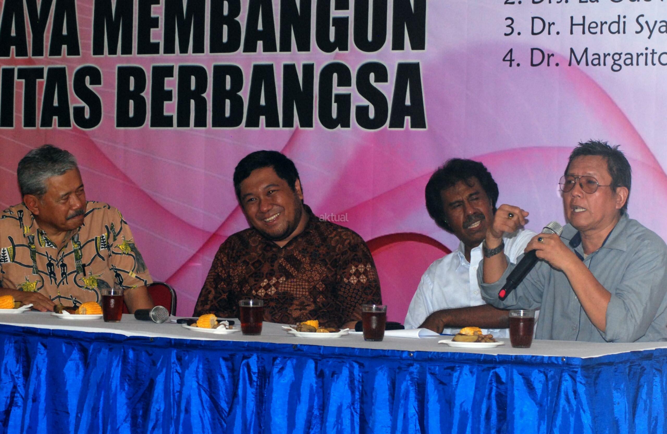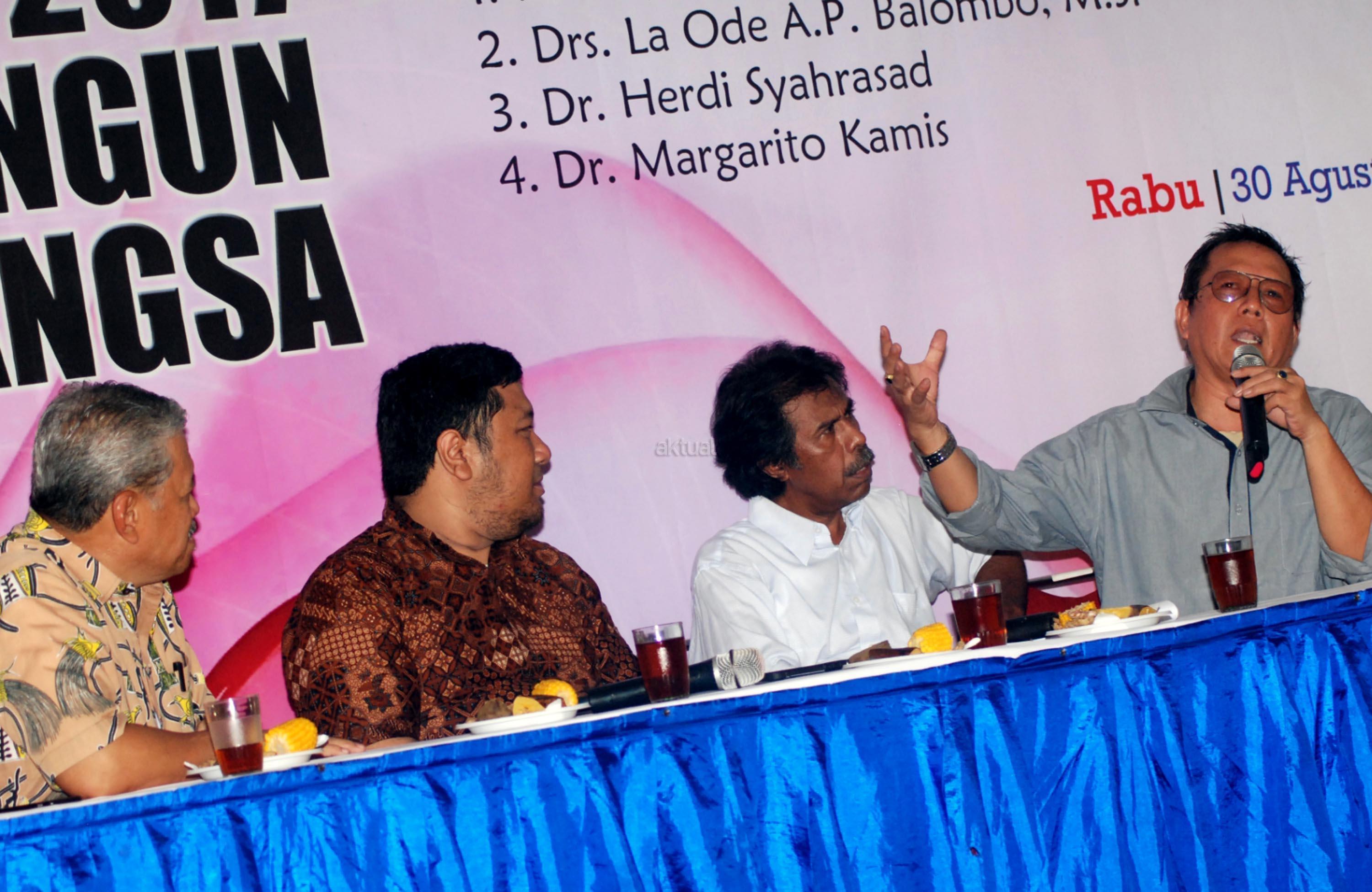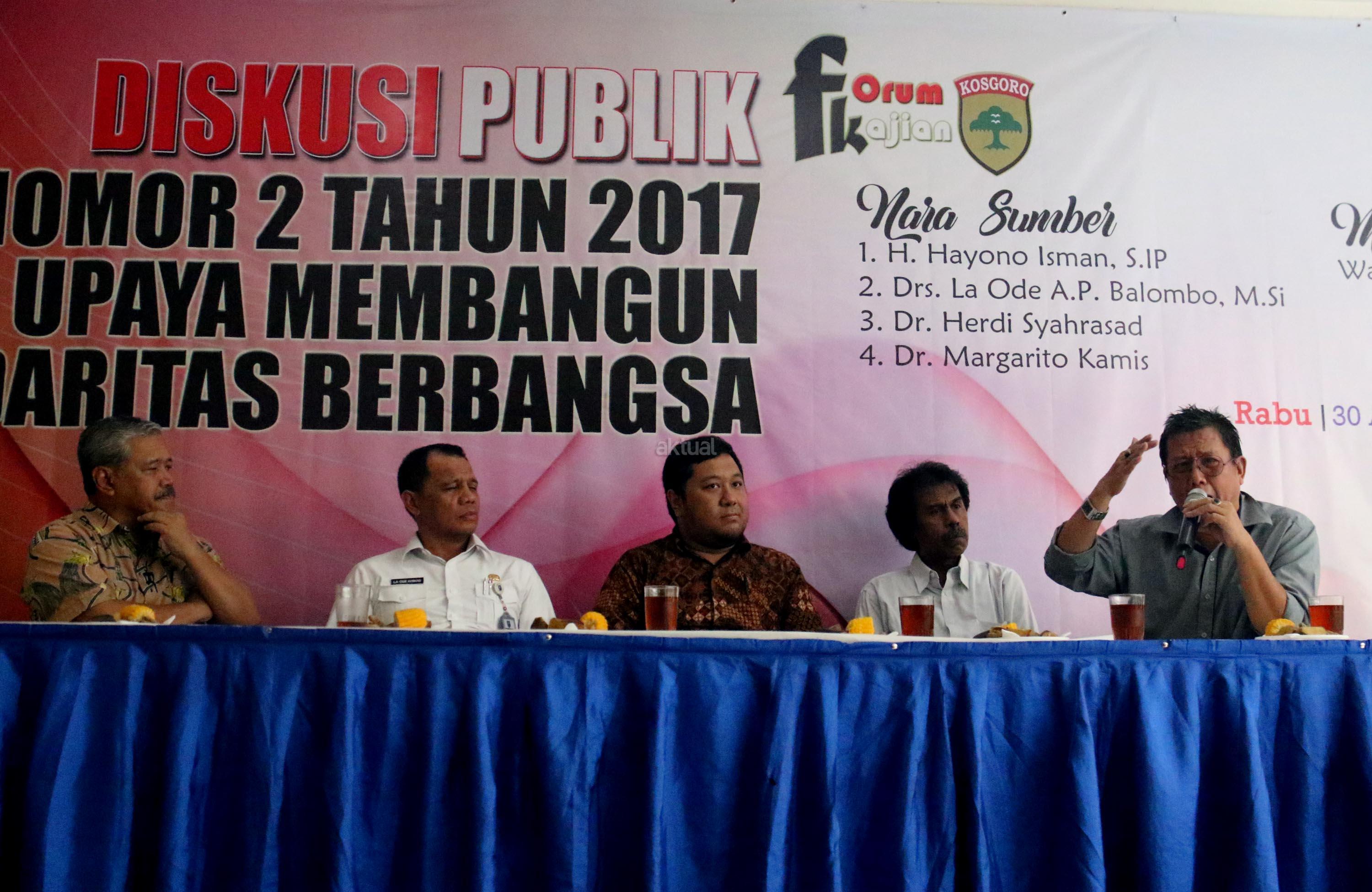 Pengamat Organisasi Keagamaan Universitas Paramadina, Herdi Syahrasad, Pakar Hukum Tata Negara, Margarito Kamis, Pengamat Hukum Tata Negara, Wahyuanda Suryadarmanto dan Ketua Umum Pimpinan Pusat Kolektif (PPK) Kosgoro, Hayono Isman menjadi pembicara pada diskusi publik di Jakarta, Rabu (30/8/2017). Diskusi mengangkat tema ‘Perppu Nomor 2 Tahun 2017 & upaya Membangun Solidaritas Berbangsa’. AKTUAL/Munzir