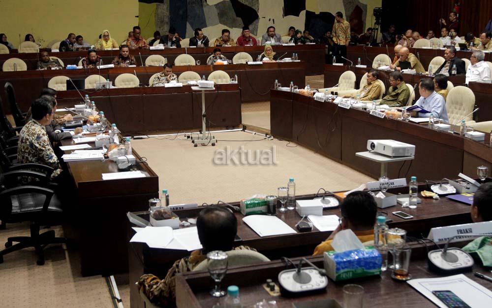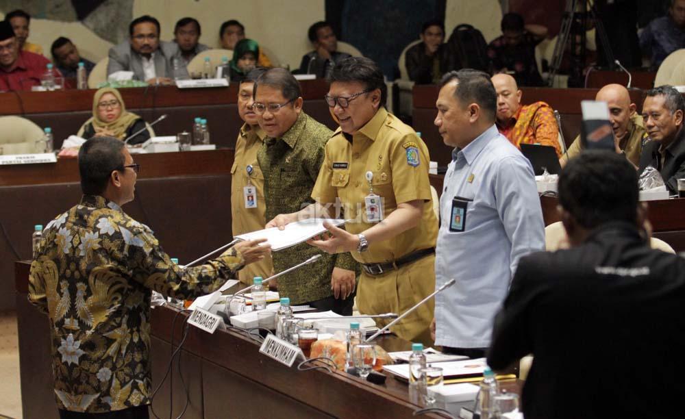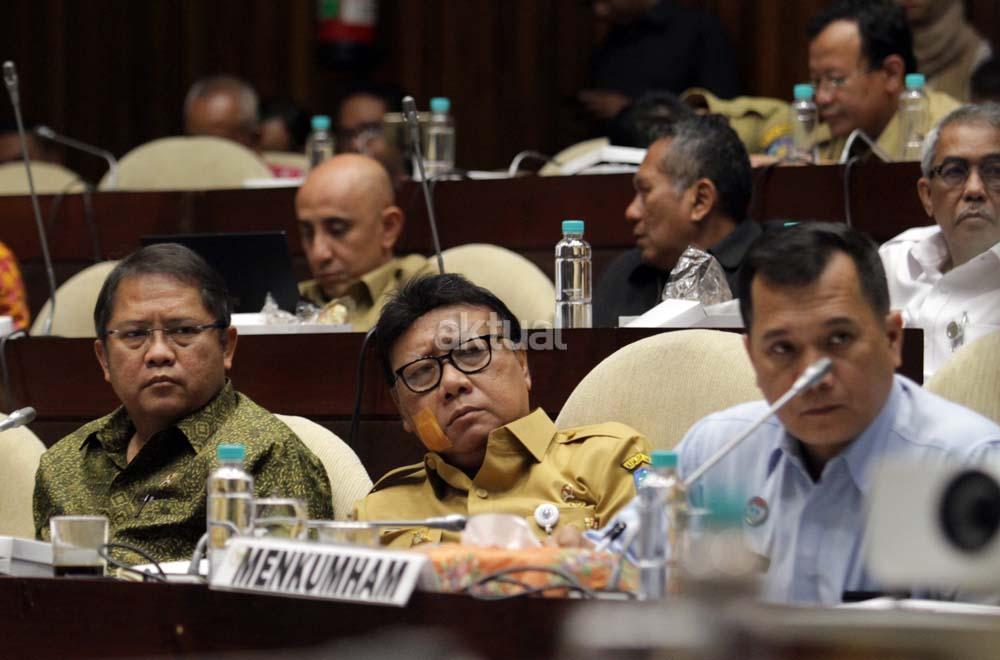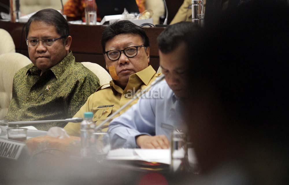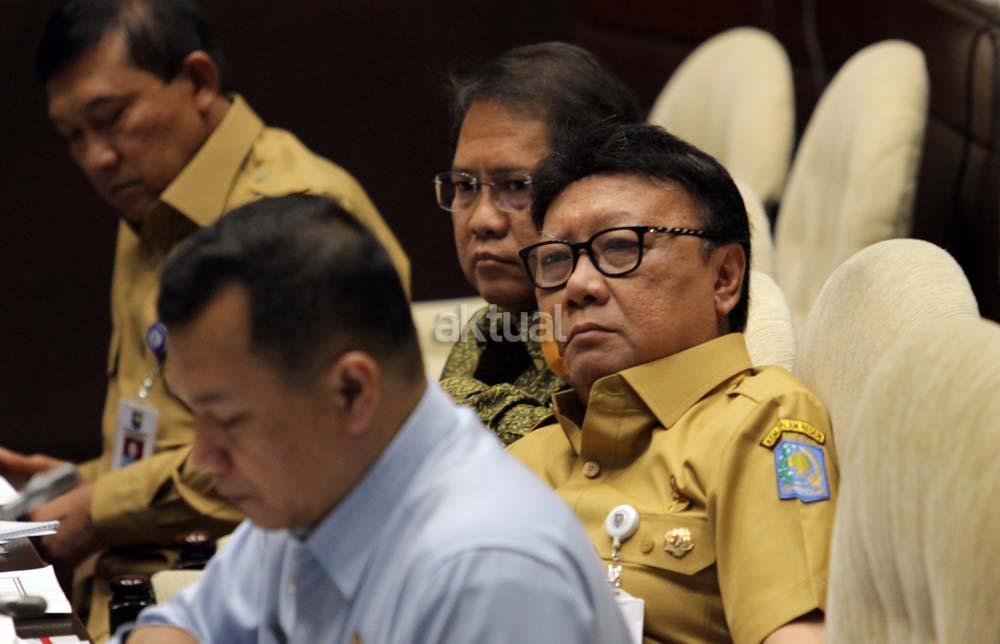 Menteri Dalam Negeri Tjahjo Kumolo bersama Menteri Komunikasi dan Informatika Rudiantara dan perwakilan dari Kemnkumham mengikuti rapat kerja dengan Komisi II DPR di Kompleks Parlemen, Senayan, Jakarta, Senin (23/10). Rapat kerja tersebut beragendakan lanjutan pengambilan keputusan tingkat pertama terhadap Peraturan Pemerintah Pengganti Undang-Undang (Perppu) Nomor 2 Tahun 2017 tentang Organisasi Masyarakat (Perppu Ormas). AKTUAL/Tino Oktaviano