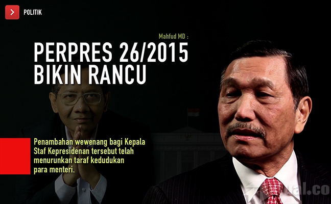 Jakarta, Aktual.co — Mantan Ketua Makamah Konstitusi Mahfud MD menilai bahwa ada kerancuan dalam penerbitan Peraturan Presiden (Pepres) Nomor 26 Tahun 2015 tentang Kewenangan Kepala Staf Kepresidenan. Ia menilai penambahan wewenang bagi Kepala Staf Kepresidenan tersebut telah menurunkan taraf kedudukan para menteri.