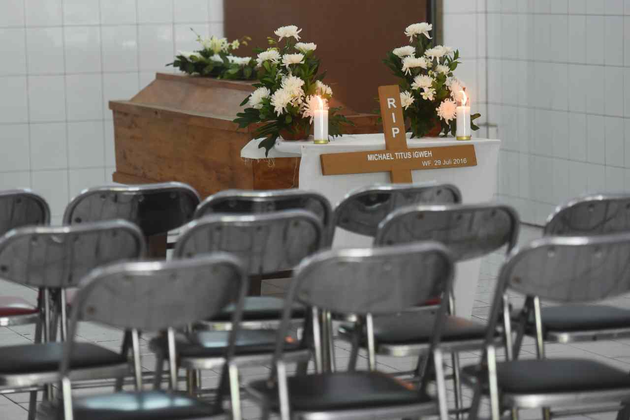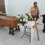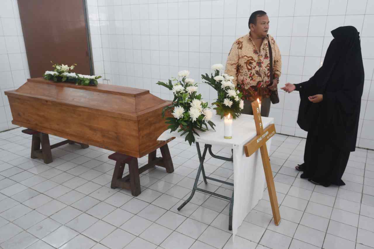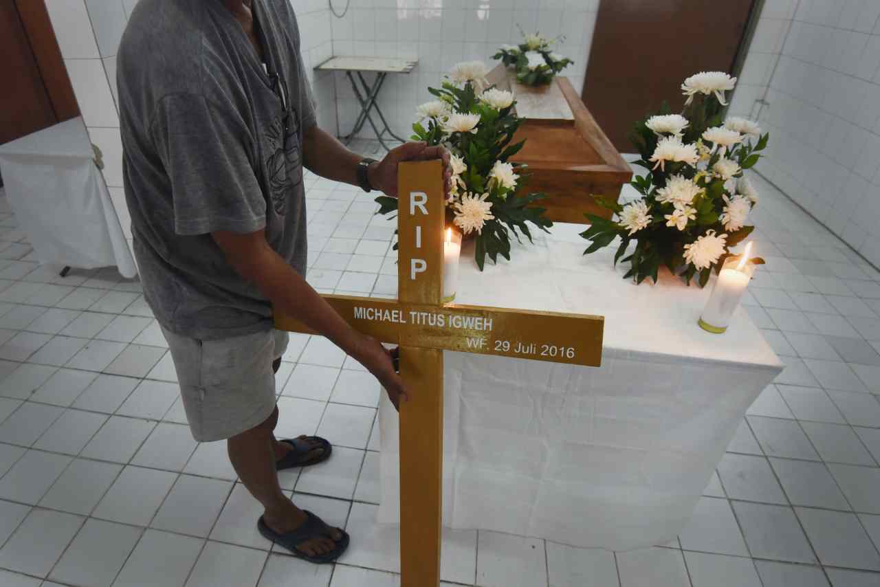 Kerabat berdiri di samping peti jenazah Michael Titus Igweh saat persemayaman di Rumah Duka Bandengan, Jakarta, Jumat (29/7). Warga negara Nigeria itu merupakan satu dari empat orang terpidana mati kasus narkoba yang menjalani eksekusi di Pulau Nusakambangan. ANTARA FOTO/Akbar Nugroho Gumay/kye/16