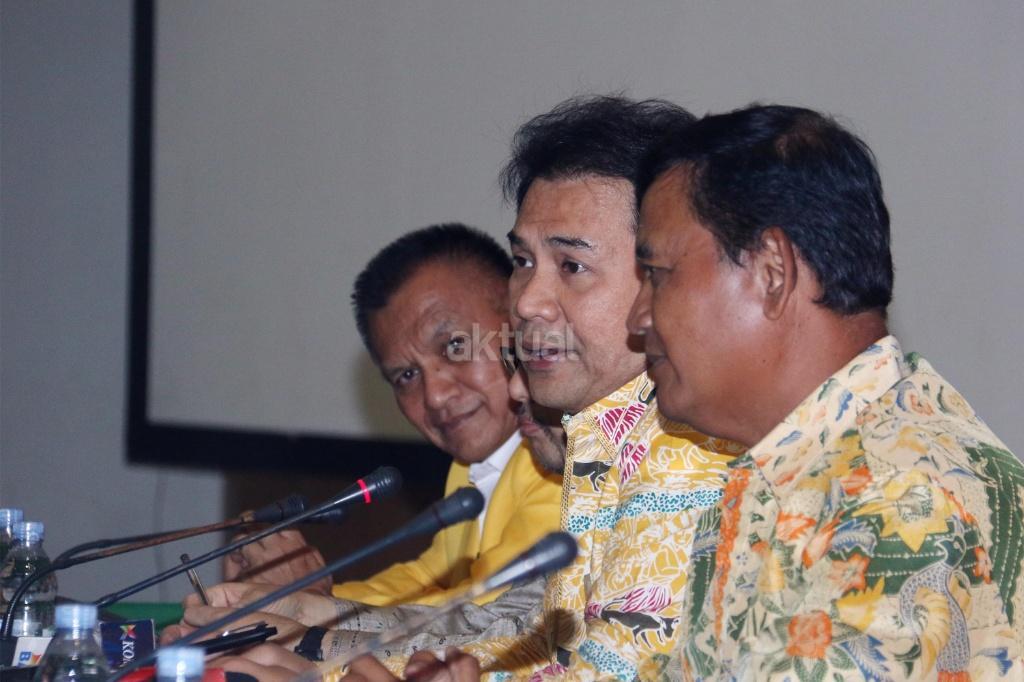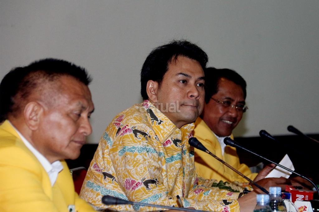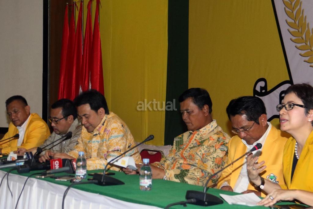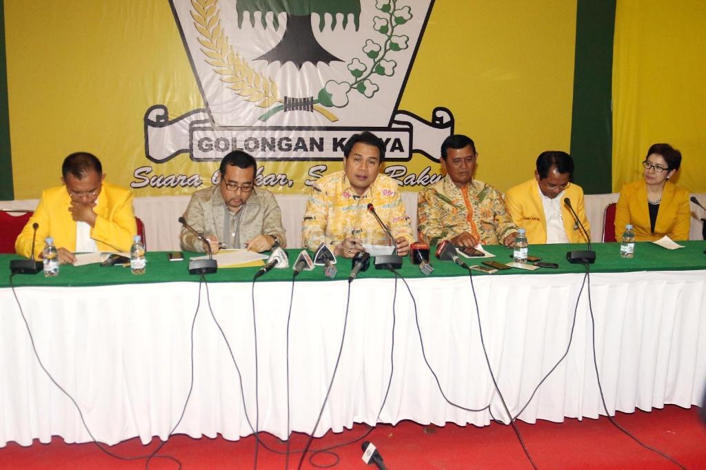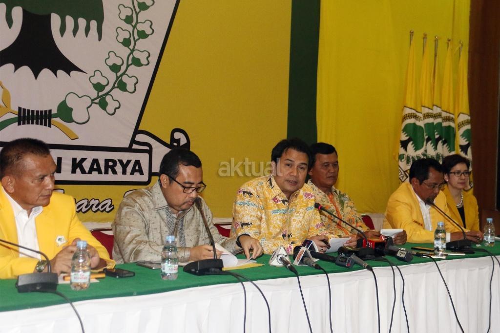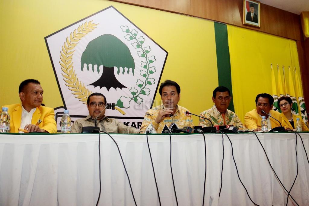 Ketua Pelaksana HUT ke-53 Partai Golkar Azis Syamsudin (kedua kiri) didampingi Ketua Pengarah HUT M Yahya Zaini (kiri), Ketua Korbid Polhukam Eko Wiratmoko (kedua kanan), dan Wasekjen John Kenedy Azis (kanan), Ketua Bidang MPO Nurul Arifin memegang poster sesusai memberikan keterangan pers di Kantor DPP Golkar, Jakarta, Rabu (18/10/2017). Dalam HUT ke 53 Partai Golkar mengambil tema “Partai Golkar Sahabat Rakyat” dan akan menggelar setidaknya sembilan kegiatan dalam HUT Partai Golkar ke-53. Kegiatan tersebut diawali dengan Seminar Kebangsaan yang bertema ‘Revitalisasi Pancasila sebagai Ideologi Perjuangan Partai GOLKAR. AKTUAL/Munzir