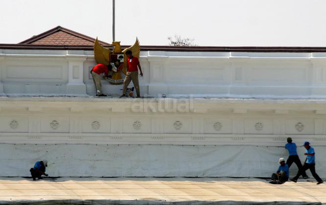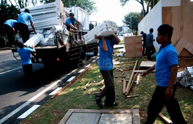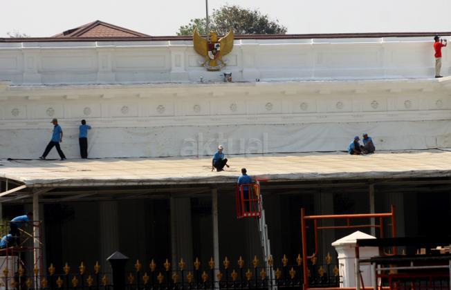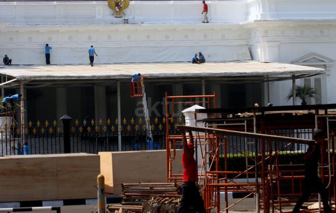 Sejumlah pekerja mempersiapkan panggung di depan Istana Merdeka, Jakarta, Kamis (6/8/2015). Aktifitas tersebut dalam rangka persiapan Upacara Bendera Hari Kemerdekaan Republik Indonesia ke-70 yang jatuh pada 17 Agustus mendatang.