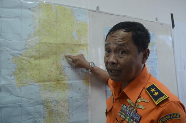 Deputi Bidang Potensi Basarnas Marsekal Muda TNI Sudipo Handoyo menunjukkan peta titik fokus pencarian pesawat Aviastar DHC6/PK-BRM di Crisis Center Bandara Internasional Sultan Hasanuddin, Makassar, Sulawesi Selatan, Sabtu (3/10). Tim Basarnas melakukan operasi pokok pencarian pesawat Aviastar DHC6/PK-BRM di titik empat sektor koordinat 150 'nautical mile square', titik hilangnya sinyal handphone pilot Aviastar di tiga kabupaten yakni Palopo, Toraja, Enrekang. ANTARA FOTO/Sahrul Manda Tikupadang/nz/15