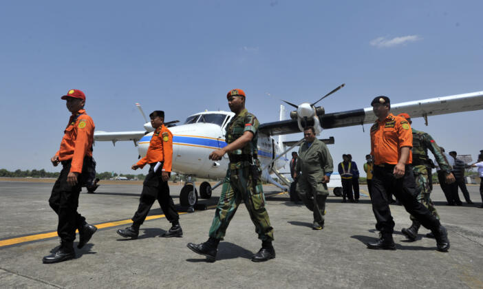 Tim SAR melintas di dekat pesawat Aviastar saat akan melakukan pencarian pesawat Aviastar DHC6/PK-BRM yang hilang di Bandara Sultan Hasanuddin Makassar, Sulawesi Selatan, Sabtu (3/10). Hingga saat ini TIM SAR belum menemukan pesawat Aviastar DHC6/PK-BRM yang hilang kontak setelah lepas landas dari Bandara Andi Jemma, Masamba, Kabupaten Luwu Utara, menuju Makassar pada Jumat (02/10) 2015 dan titik pencarian difokuskan pada empat kabupaten yakni kabupaten Luwu, Palopo, Enrekang dan Toraja. ANTARA FOTO/Yusran Uccang/nz/15