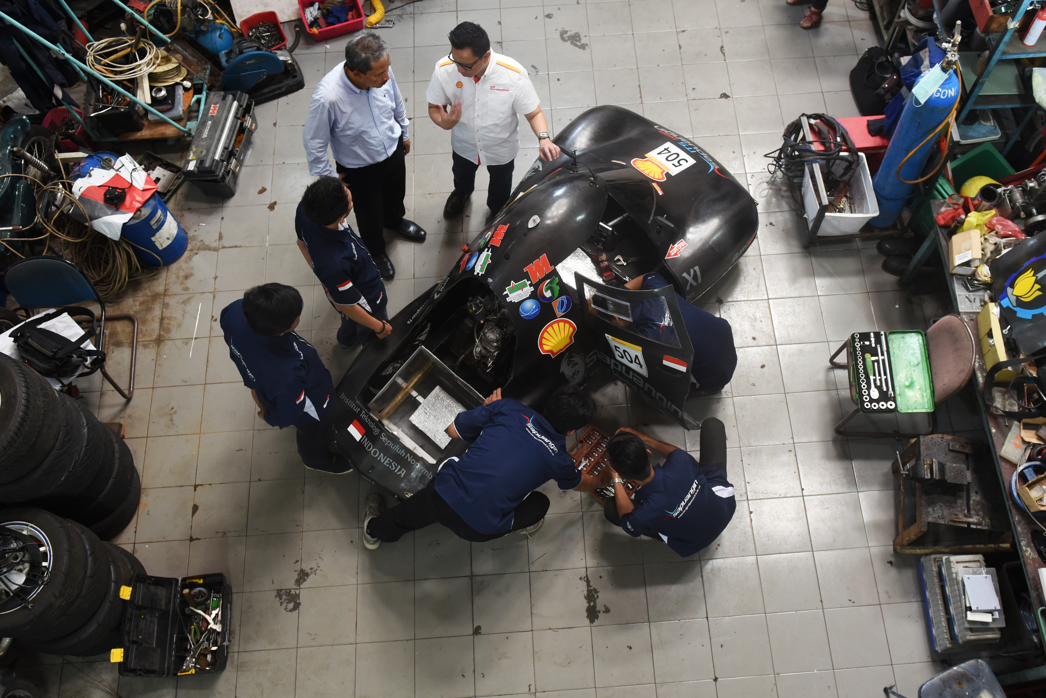 Rektor Institut Teknologi Sepuluh November (ITS) Joni Hermawan (kiri) berbincang dengan GM External Relations PT Shell Indonesia Haviez Gautama (kanan) saat menyaksikan Tim ITS Team 2 mobil sapuangin 10 memeriksa mobil karya mereka di Kampus ITS, Surabaya, Jawa Timur, Senin (9/5). Persiapan itu dalam rangka mengikuti kualifikasi untuk berkompetisi di Shell Eco-marathon Drivers World Championship di London, Inggris pada 30 Juni 2016, setelah mobil karya tim mereka meraih juara pertama pada ajang Shell Eco-marathon Asia yang diadakan Maret 2016 lalu. ANTARA FOTO/Zabur Karuru/aww/aww/16.