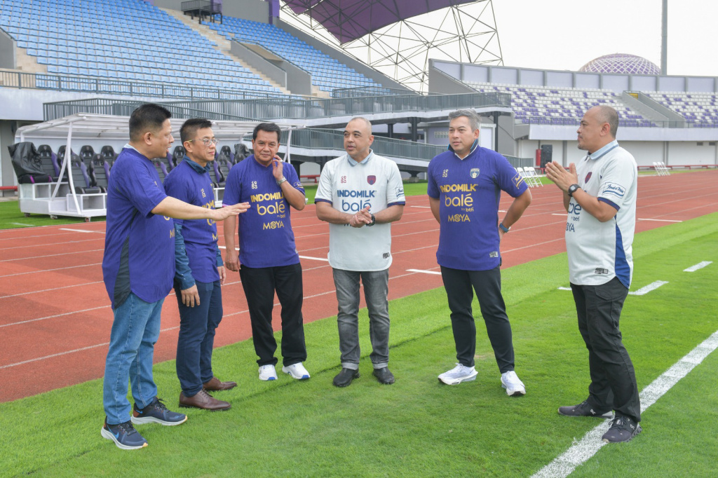 Direktur Information Technology PT Bank Tabungan Negara Tbk (BTN) Tan Jacky Chen, Direktur Network & Retail Funding BTN Rully Setiawan dan SEVP Digital Business BTN Thomas Wahyudi berbincang dengan Bupati Tangerang Moch Maesyal Rasyid serta Presiden Persita Tangerang HA Zaki Iskandar saat peluncuran jersey baru Persita Tangerang berlogo Bale by BTN di kawasan Indomilk Arena Sport Center, Kelapa Dua, Tangerang, Minggu (27/7/25).
