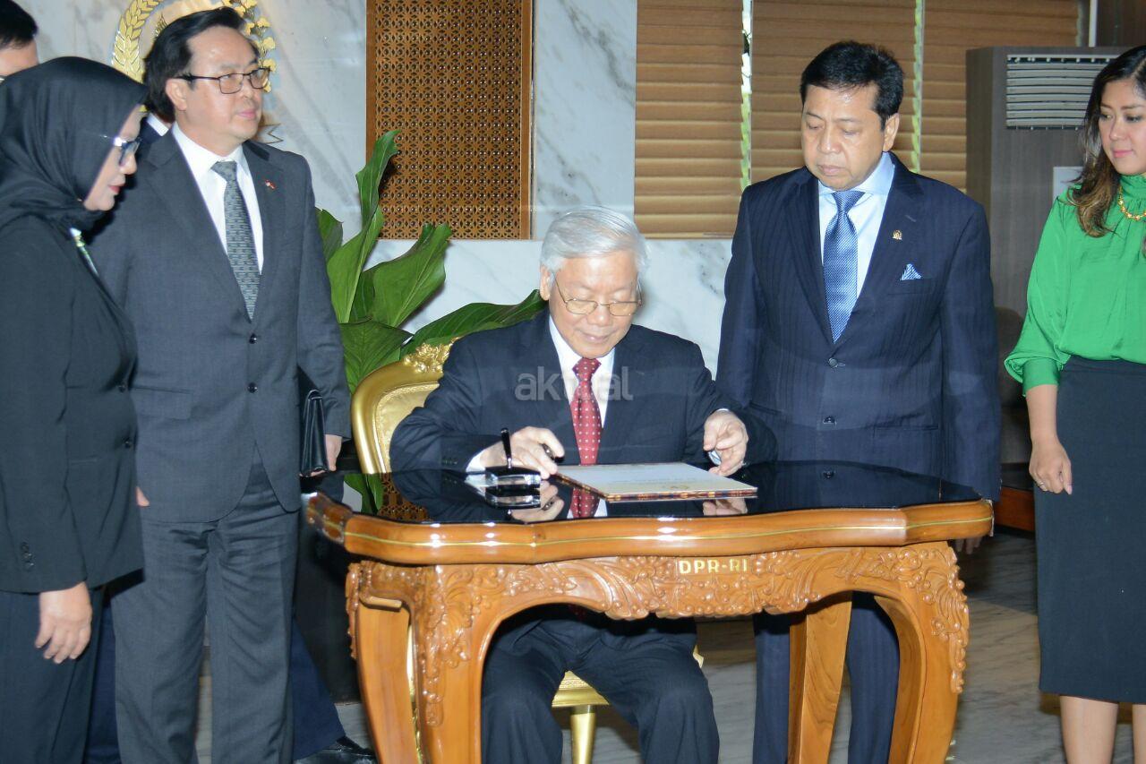 Ketua DPR Setya Novanto menerima kunjungan kenegaraan Sekretaris Jenderal (Sekjen) Partai Komunis Vietnam Nguyen Phu Trong di DPR, Kompleks Parlemen, Senayan, Jakarta, Selasa (22/8). Kunjungan tersebut bertujuan untuk mempererat kemitraan strategis kedua negara di berbagai bidang. AKTUAL/Tino Oktaviano