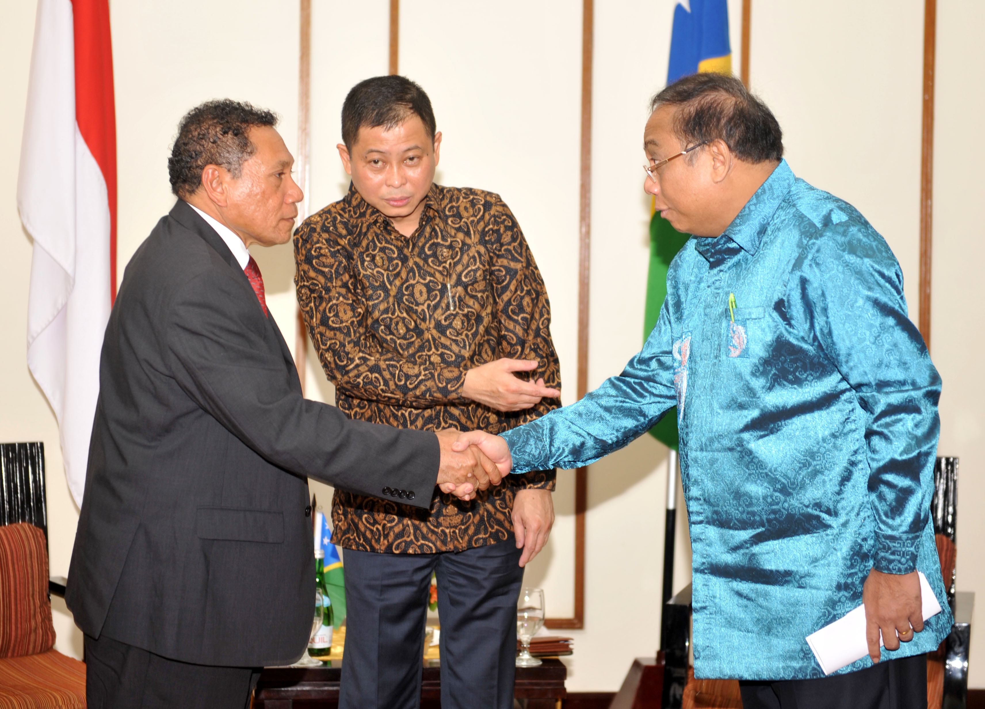 Menteri Perhubungan Ignasius Jonan (kanan) memperkenalkan Utusan Khusus Menteri Perhubungan Indonesia untuk International Civil Aviation Organization (ICAO) Indroyono Soesilo (kanan) kepada Menteri Perhubungan Kepulauan Salomo Peter Shanel Agovaka (kiri) usai pertemuan bilateral di Bali, Minggu (29/5). Pertemuan tersebut dilakukan menjelang "Transportation Ministerial Meeting of Developing Countries" yang akan berlangsung 30-31 Mei 2016, dan Indonesia tengah berupaya untuk meminta dukungan agar menjadi anggota dewan International Civil Aviation Organization (ICAO). ANTARA FOTO/Hermanus Prihatna/aww/16.