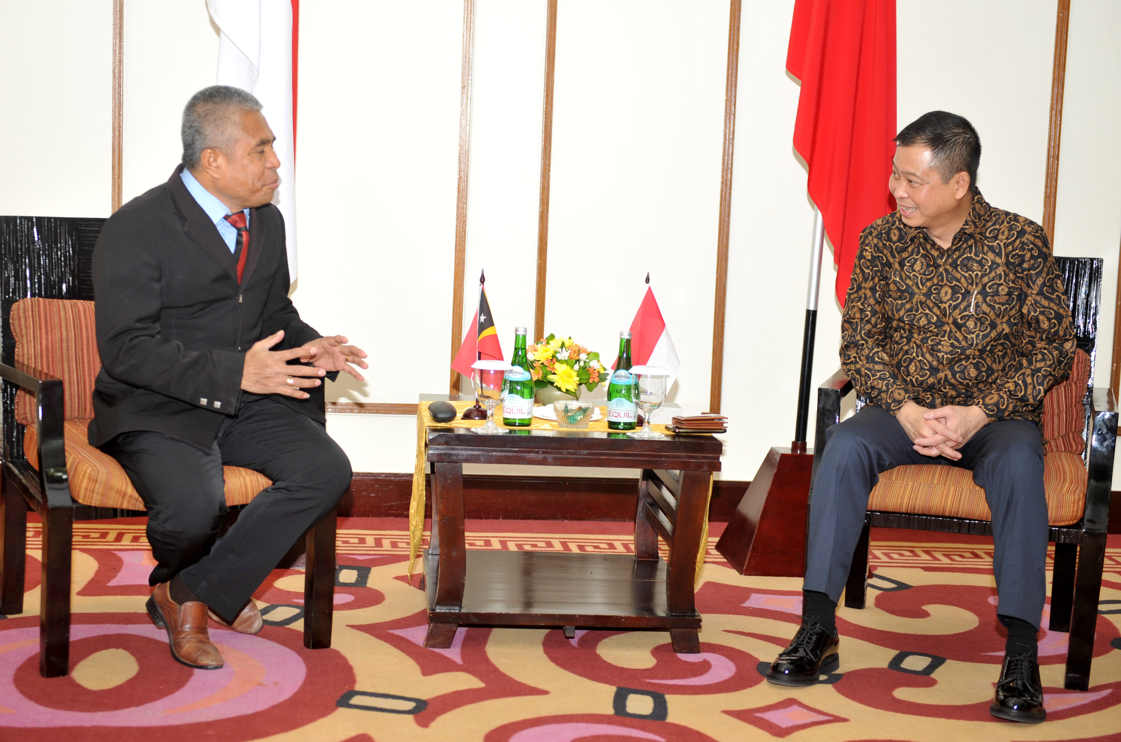 Menteri Perhubungan Ignasius Jonan (kanan) menyimak pernyataan Wakil Menteri Perhubungan Timor Leste Inacio Mariera saat pertemuan bilateral di Bali, Minggu (29/5). Pertemuan tersebut dilakukan menjelang "Transportation Ministerial Meeting of Developing Countries" yang akan berlangsung 30-31 Mei 2016, dan Indonesia tengah berupaya untuk meminta dukungan agar menjadi anggota dewan International Civil Aviation Organization (ICAO). ANTARA FOTO/Hermanus Prihatna/aww/16.