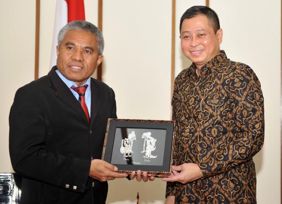 Menteri Perhubungan Ignasius Jonan (kanan) dan Wakil Menteri Perhubungan Timor Leste Inacio Mariera memperlihatkan cenderamata usai pertemuan bilateral di Bali, Minggu (29/5). Pertemuan tersebut dilakukan menjelang "Transportation Ministerial Meeting of Developing Countries" yang akan berlangsung 30-31 Mei 2016, dan Indonesia tengah berupaya untuk meminta dukungan agar menjadi anggota dewan International Civil Aviation Organization (ICAO). ANTARA FOTO/Hermanus Prihatna/aww/16.