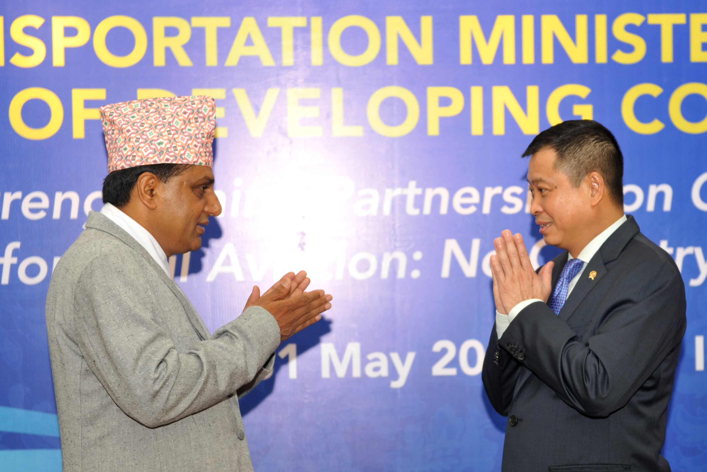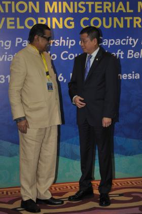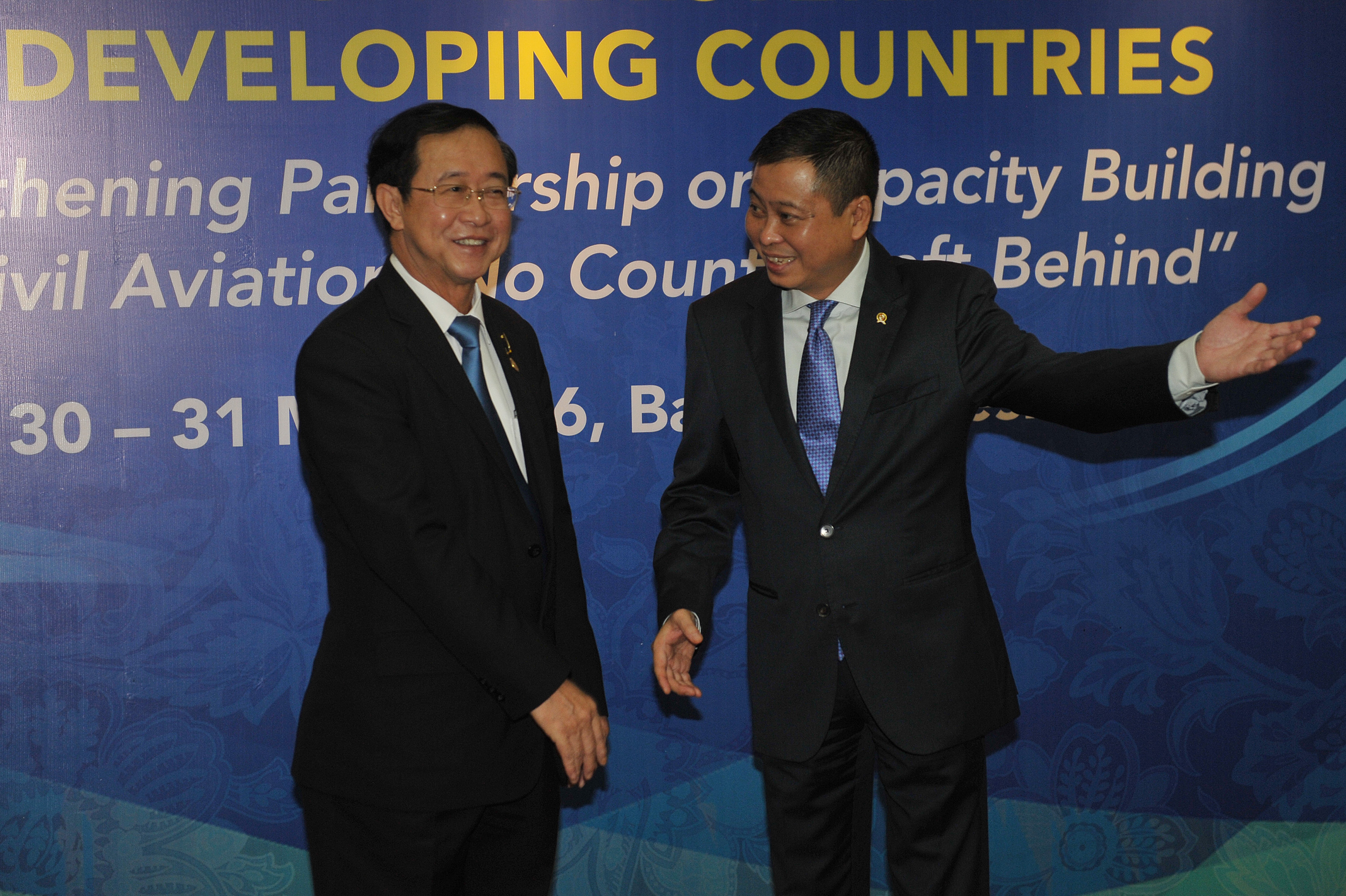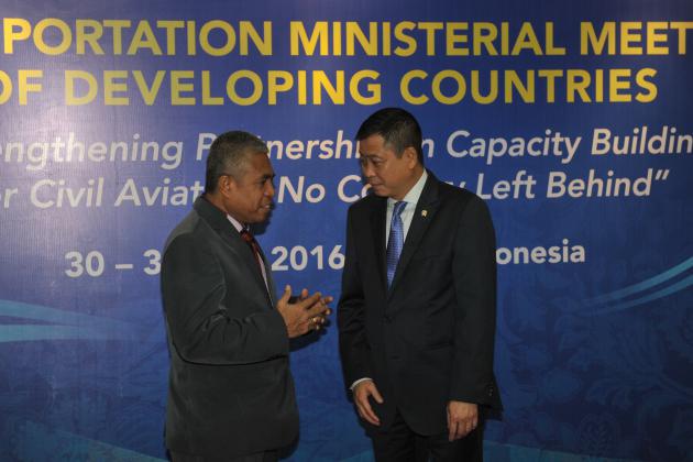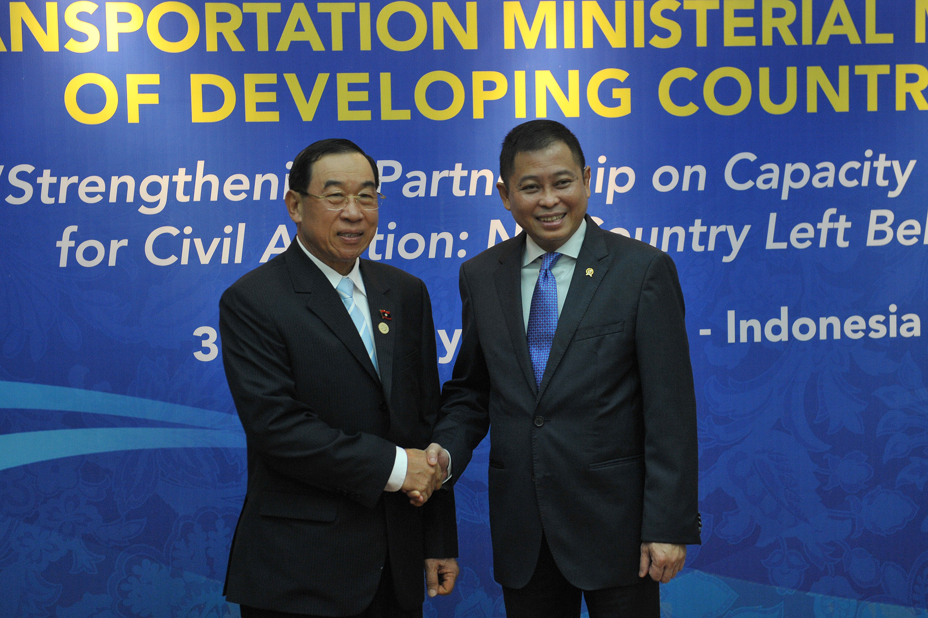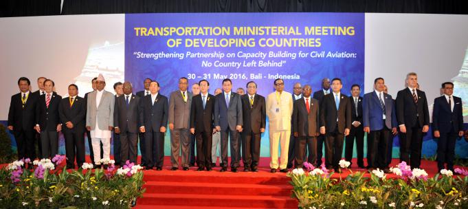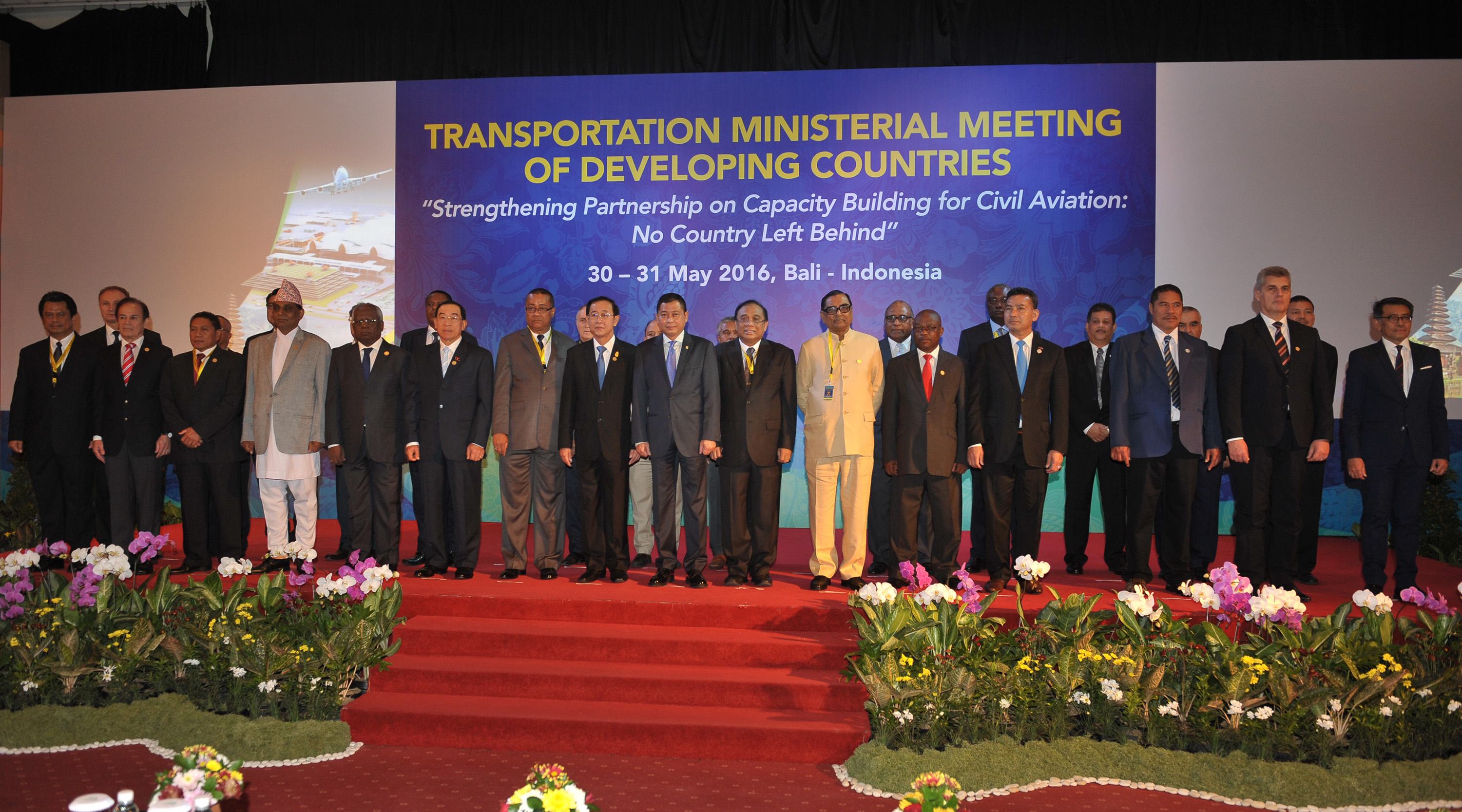 Menteri Perhubungan Ignasius Jonan (tengah) didamping Utusan Khusus Menteri Perhubungan RI untuk International Civil Aviation Organitation (ICAO) Indroyono Susilo berfoto bersama dengan para menteri perhubungan negara negara berkembang pada pembukaan Pertemuan Menteri Perhubungan Negara-Negara Berkembang di Bali, Senin (30/5). Dalam pertemuan yang akan berlangsung hingga 31 Mei 2016 itu Indonesia tengah mengupayakan dukungan dari negera peserta pertemuan ini untuk menjadi Anggota Dewan (ICAO) periode 2016-2019. ANTARA FOTO/Hermanus Prihatna/kye/16