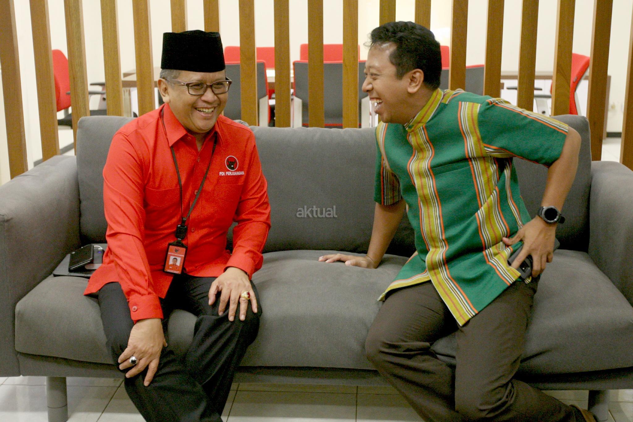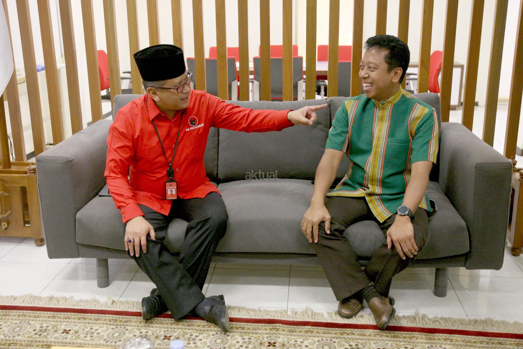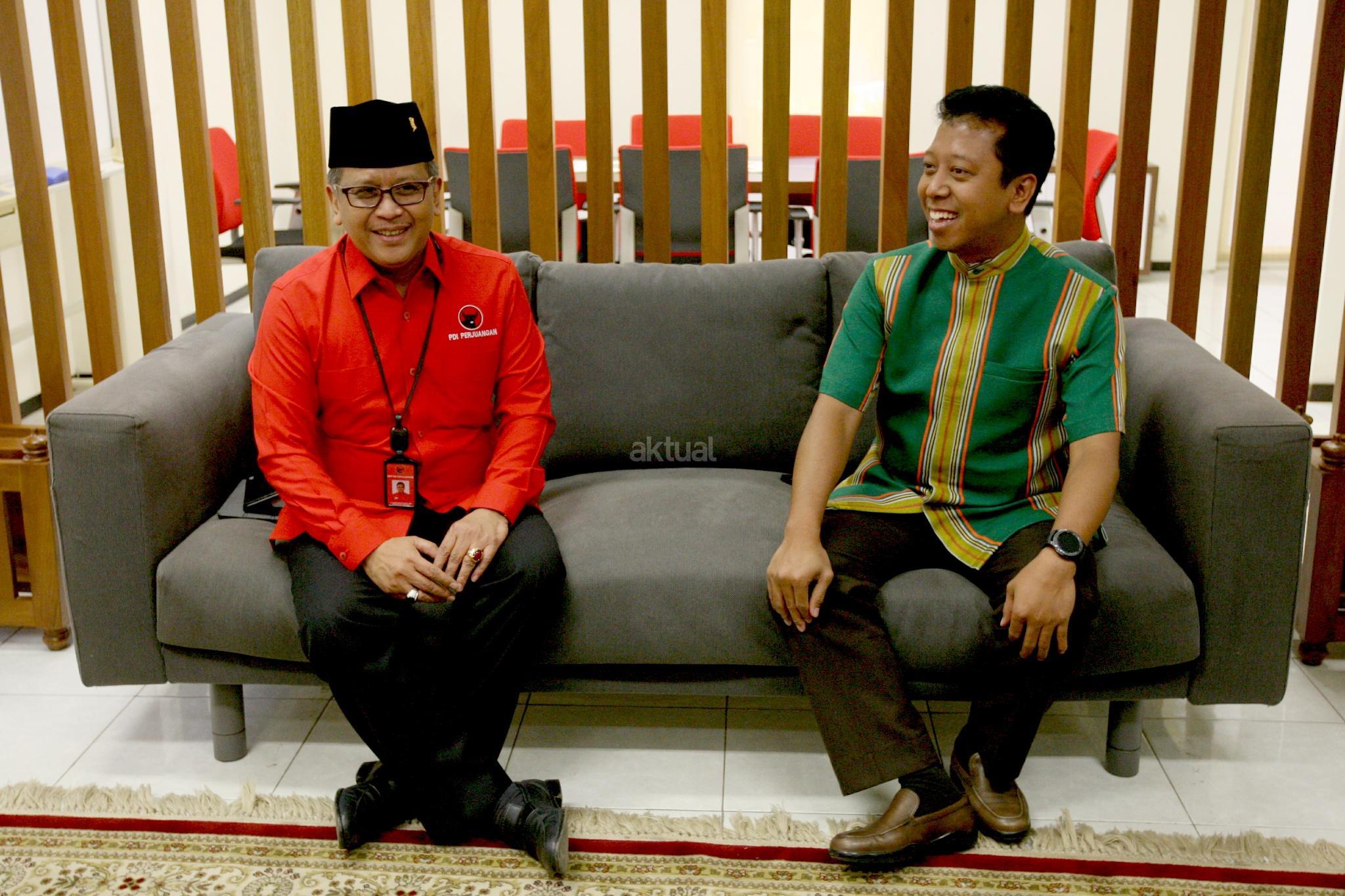 Sekjen PDI Perjuangan Hasto Kristiyanto dan Ketua Umum DPP PPP Romahurmuziy berbincang saat mengadakan pertemuan di Jakarta, Senin (26/3/2018). Pertemuan tersebut membahas berbagai strategis kebangsaan termasuk sinergi menguatkan dukungan efektivitas Pemerintahan Presiden Joko Widodo. AKTUAL/Tino Oktaviano