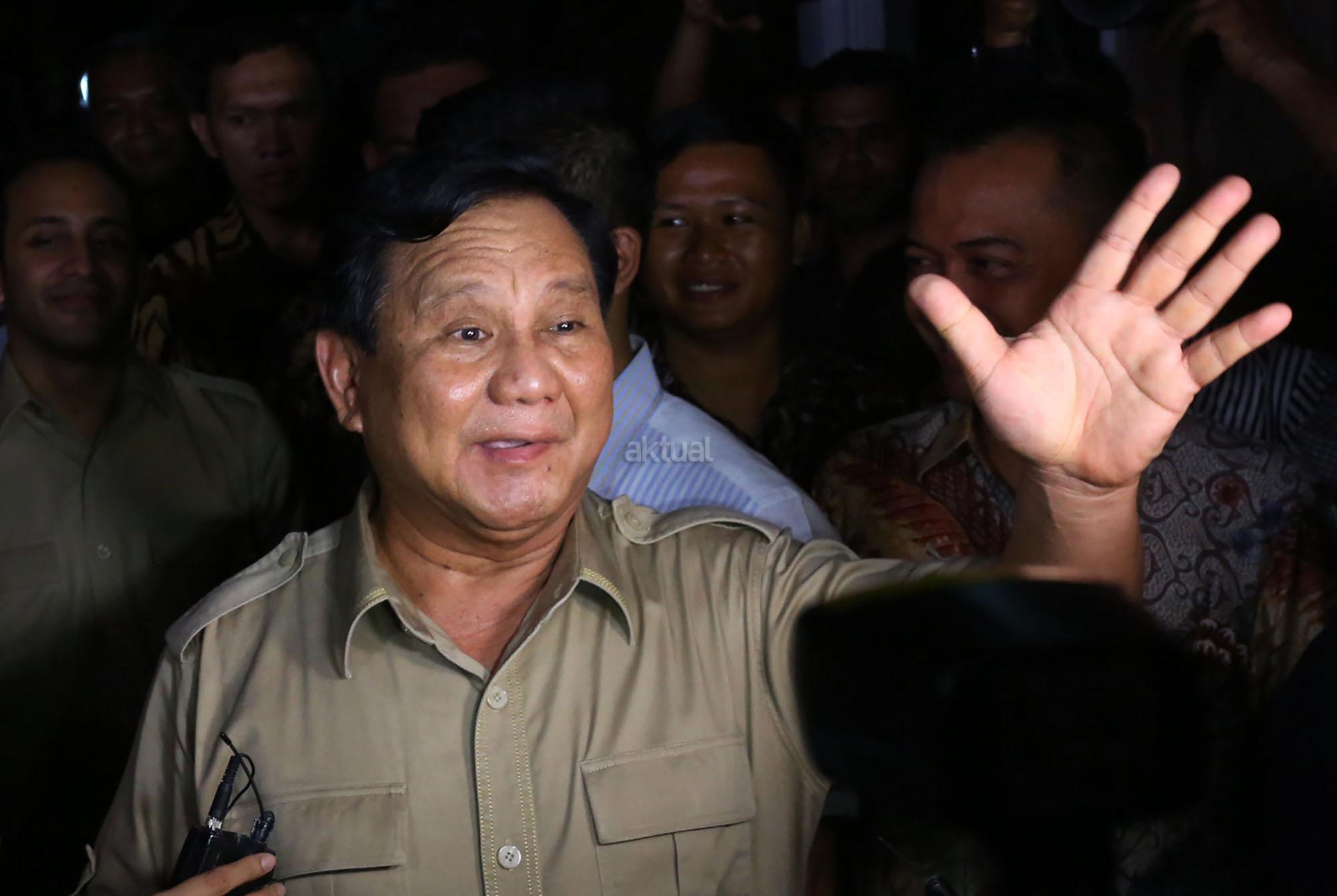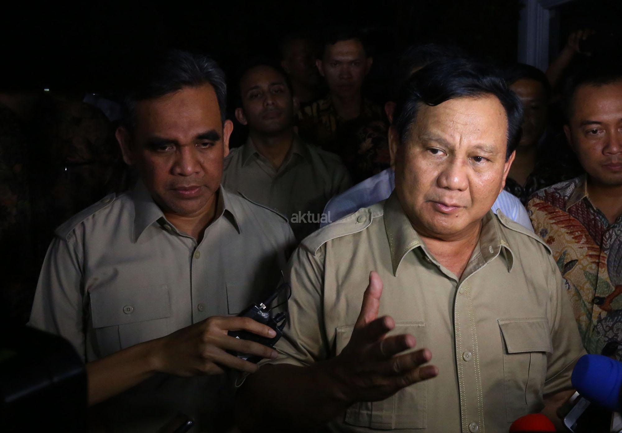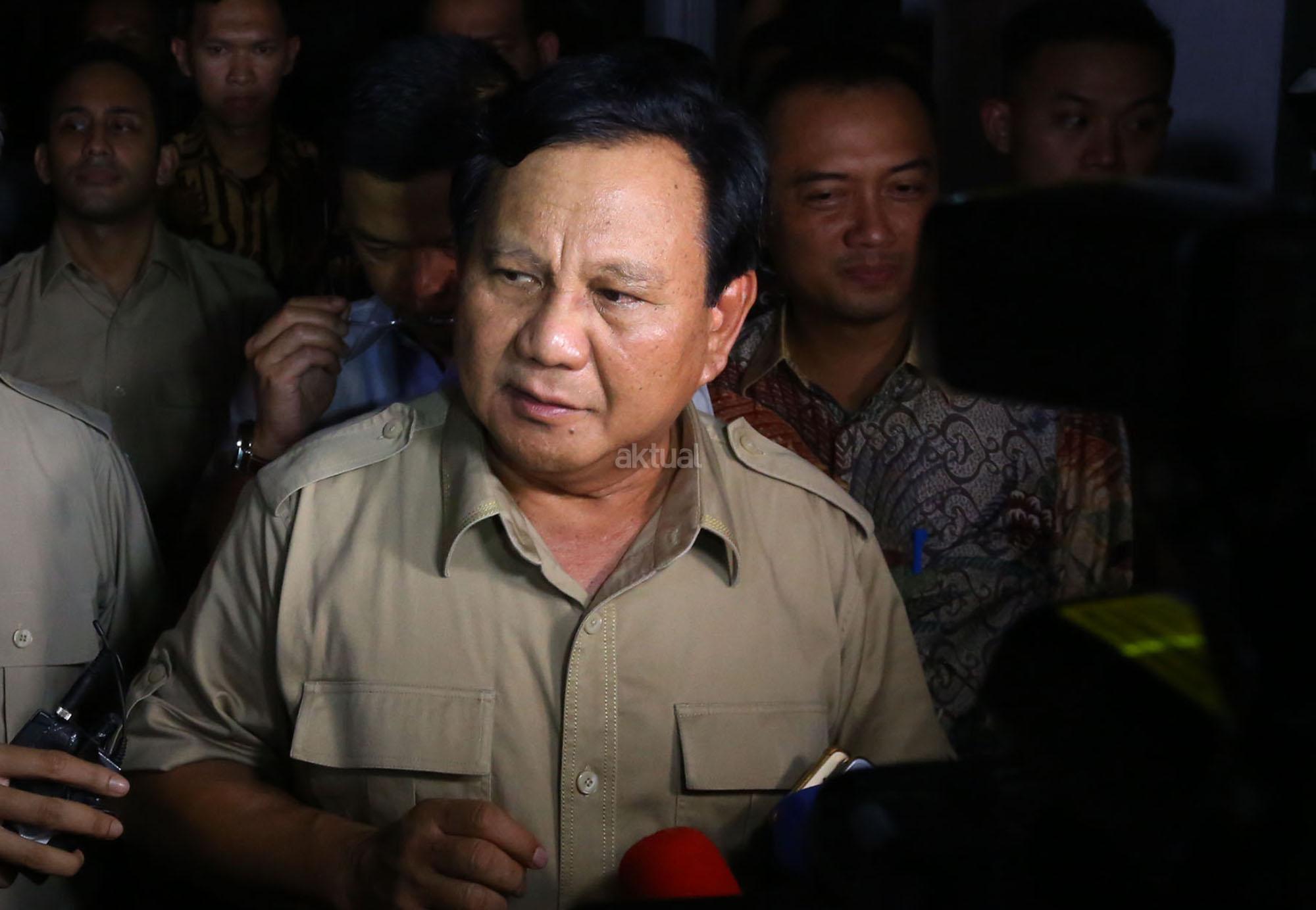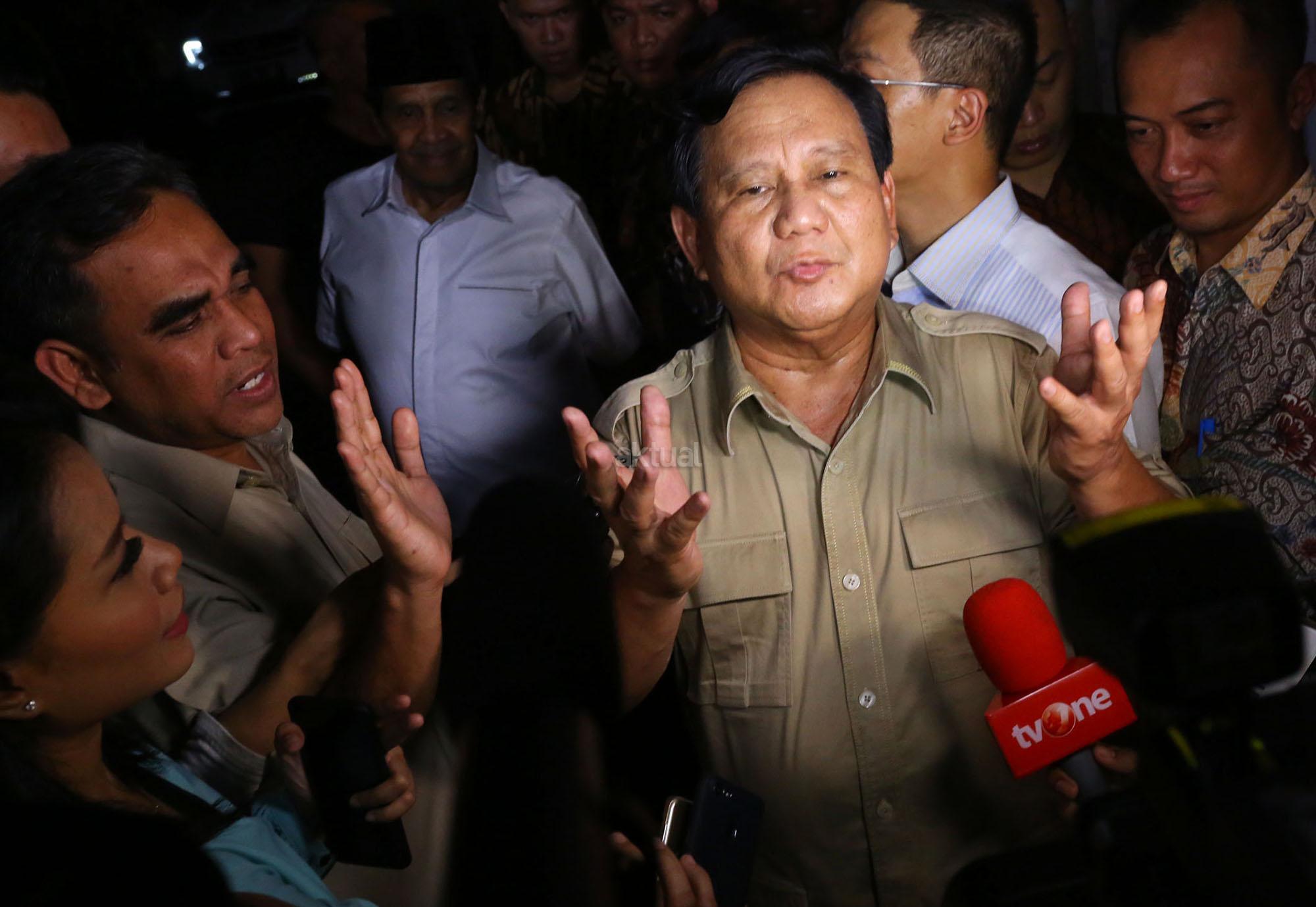 Ketua Umum Partai Gerindra Prabowo Subianto menjawab pertanyaan wartawan usai pertemuan dengan pimpinan partai PAN dan PKS di Jakarta, Selasa (31/7). Pertemuan tersebut membahas rekomendasi capres-cawapres dari pertemuan ulama Gerakan Nasional Pengawal Fatwa (GNPF) akan dibahas dalam pertemuan elite Partai Gerindra, PKS dan PAN. AKTUAL/Tino Oktaviano