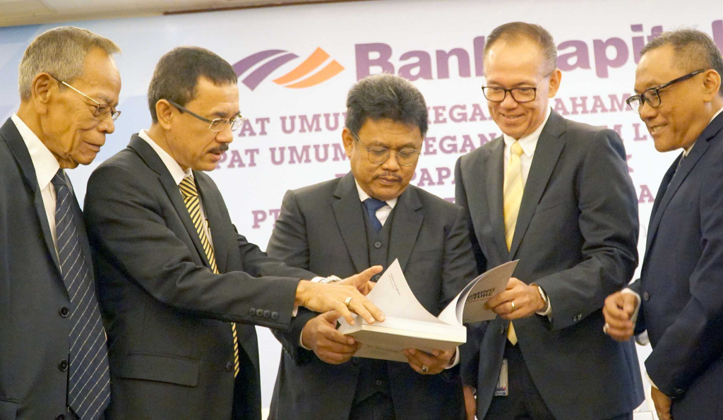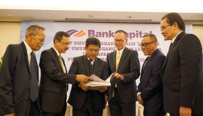(dari kiri ke kanan) Komisaris Independen Bank Capital Amrih Masjhuri, Komisaris Independen Maxen B Nggadas, Direktur Utama Wahyu Dwi Aji, Direktur Roy Iskandar Kusuma Widjaja, Direktur Gatot Wahyu Djatmiko, Direktur Gunarto Hanafi berbincang usai melakukan RUPSTahunan dan RUPSLB di Jakarta, Kamis (27/6). AKTUAL/STR-Eko S Hilman