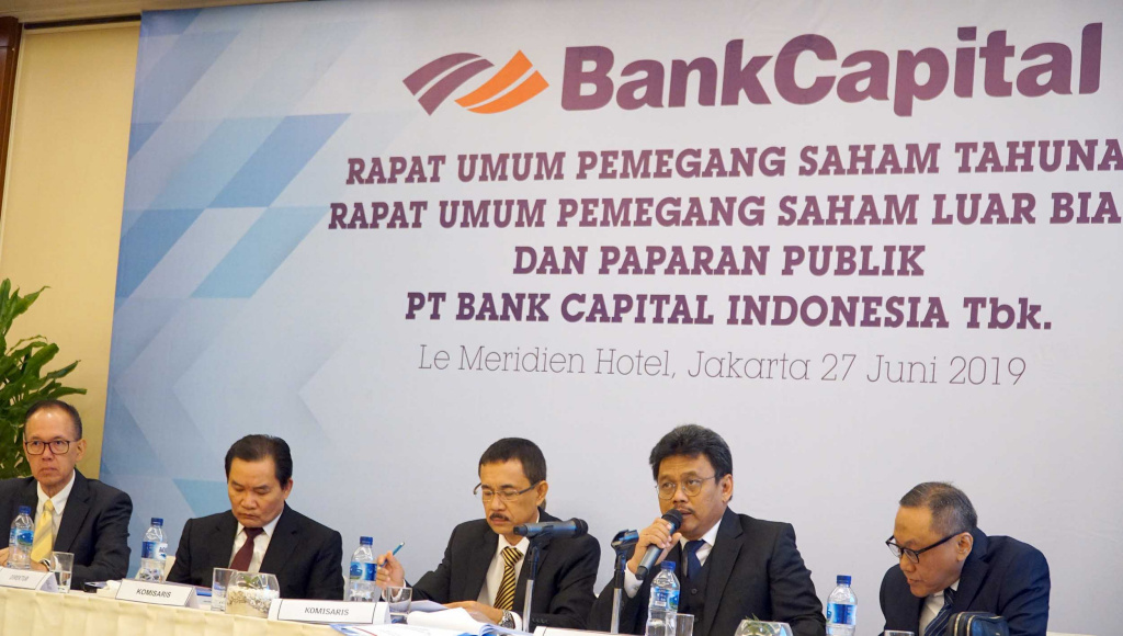 (dari kiri ke kanan) Komisaris Independen Bank Capital Amrih Masjhuri, Komisaris Independen Maxen B Nggadas, Direktur Utama Wahyu Dwi Aji, Direktur Roy Iskandar Kusuma Widjaja, Direktur Gatot Wahyu Djatmiko berbincang usai melakukan RUPSTahunan dan RUPSLB di Jakarta, Kamis (27/6). AKTUAL/STR-Eko S Hilman